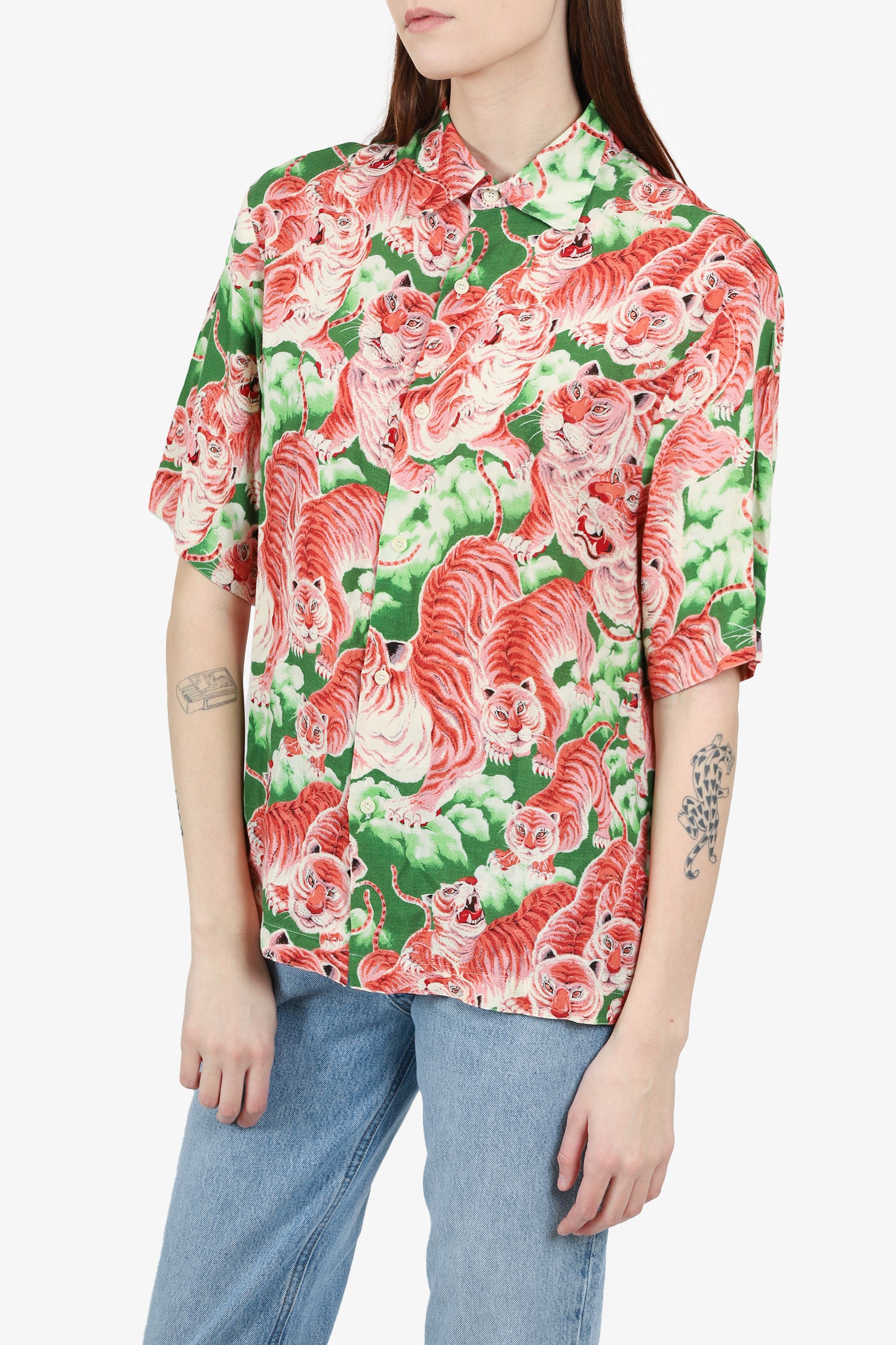 Refresh availabilitySandro Green/Pink Tiger Print Shirt. Collared neckline. Front button closure. Tonal stitching.