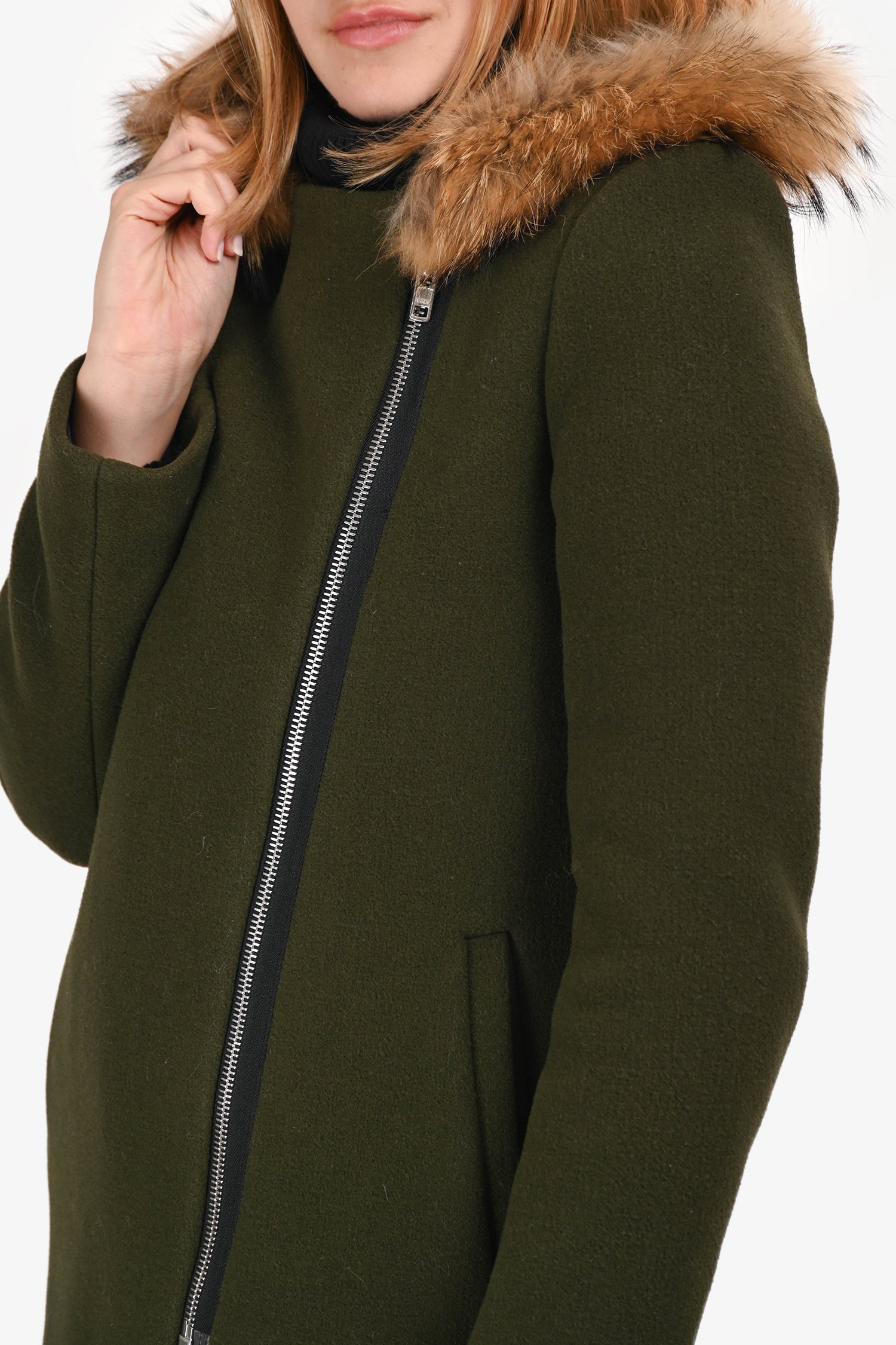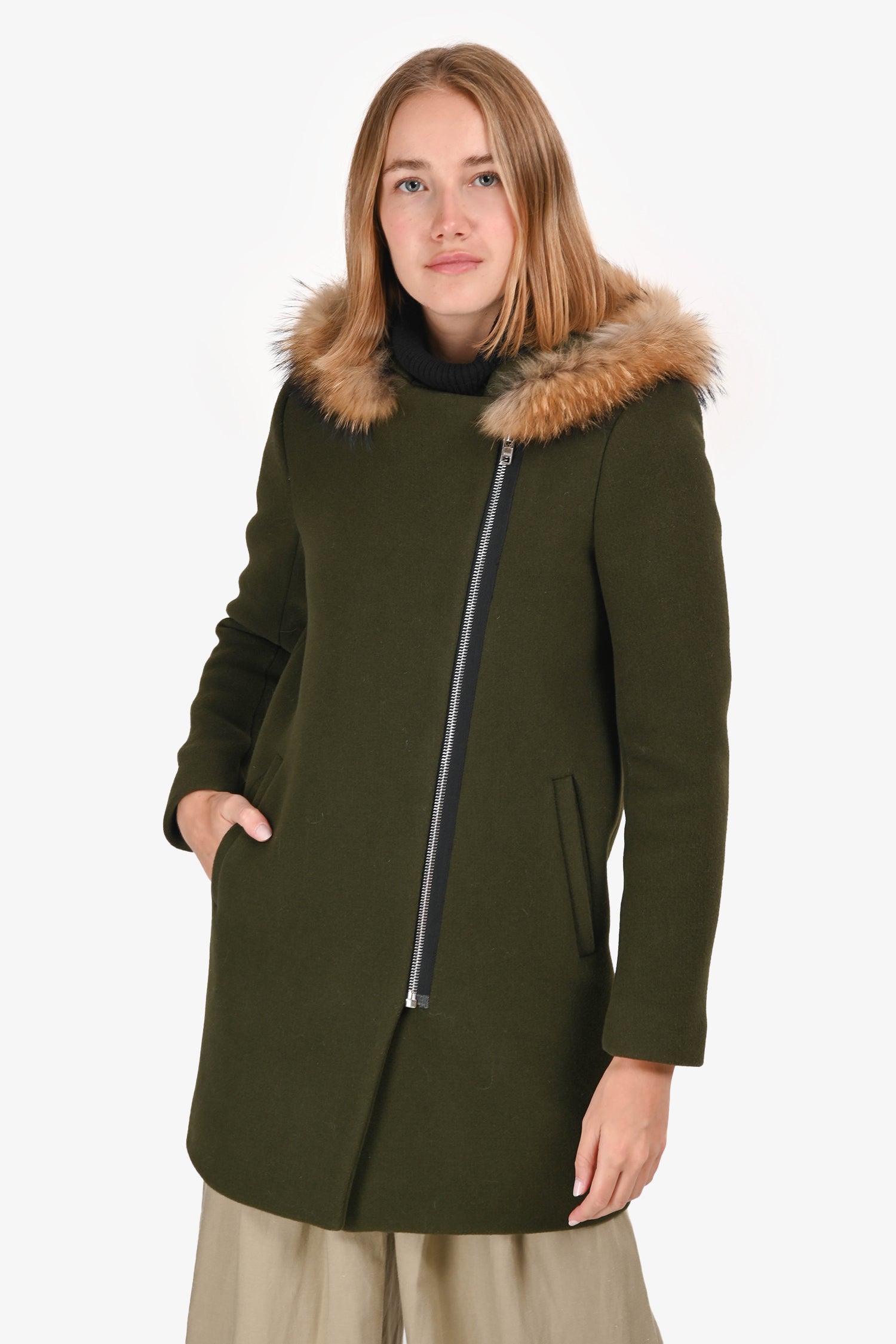 Refresh availabilitySandro Green Wool/Raccoon Fur Hood Midi Coat. Slip-on. Hooded neckline with fur trim. Front zip closure. 2 exterior slip pockets. Lined interior. Silver-tone hardware. Tonal stitching.