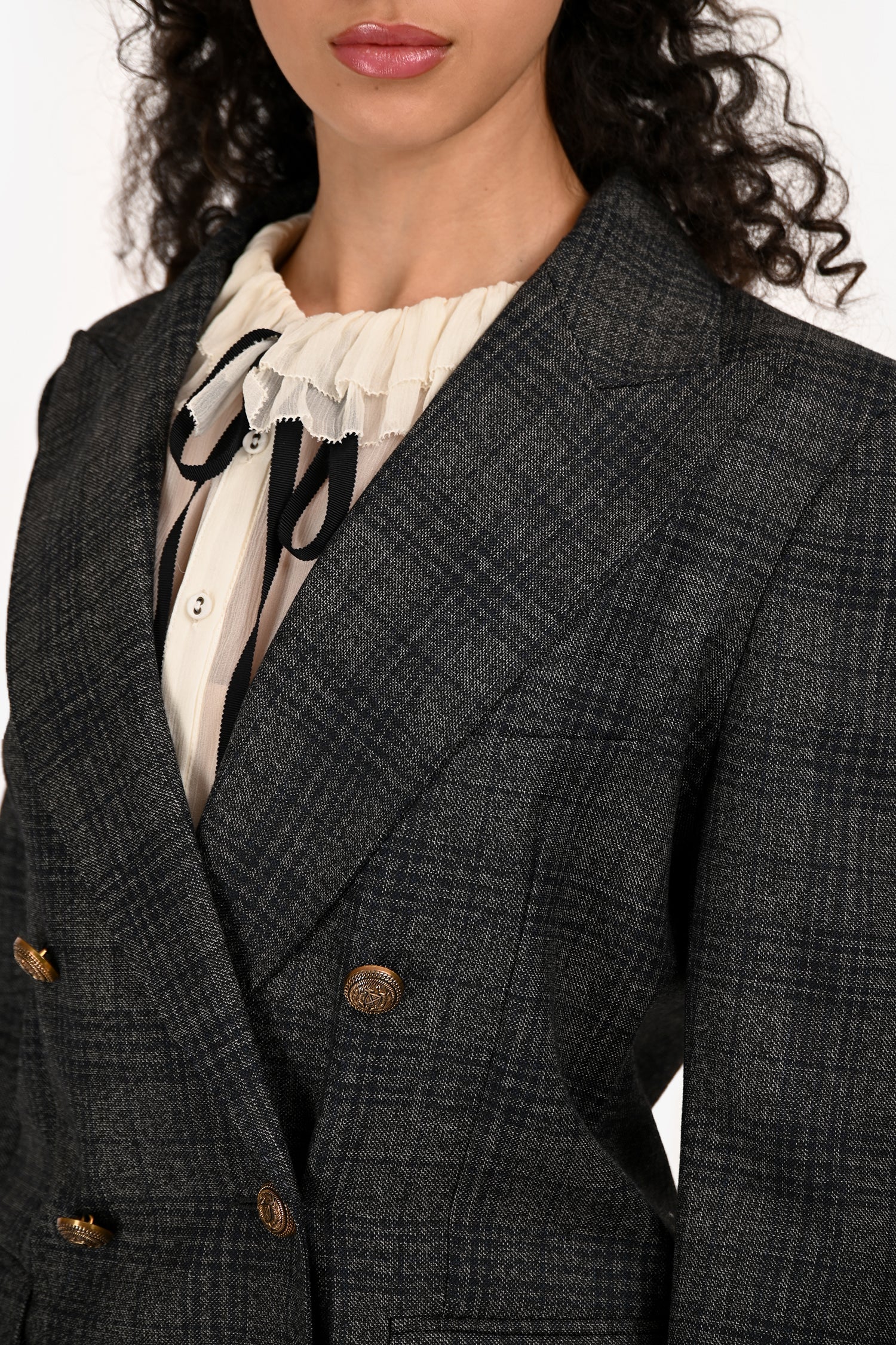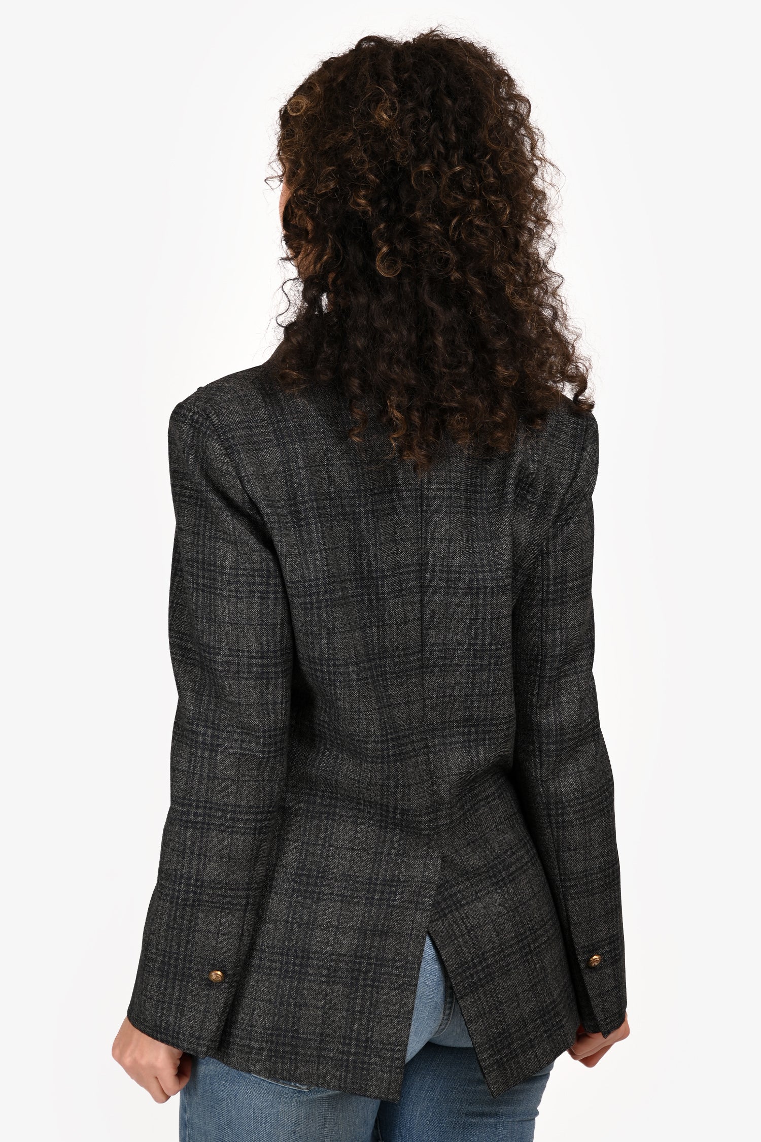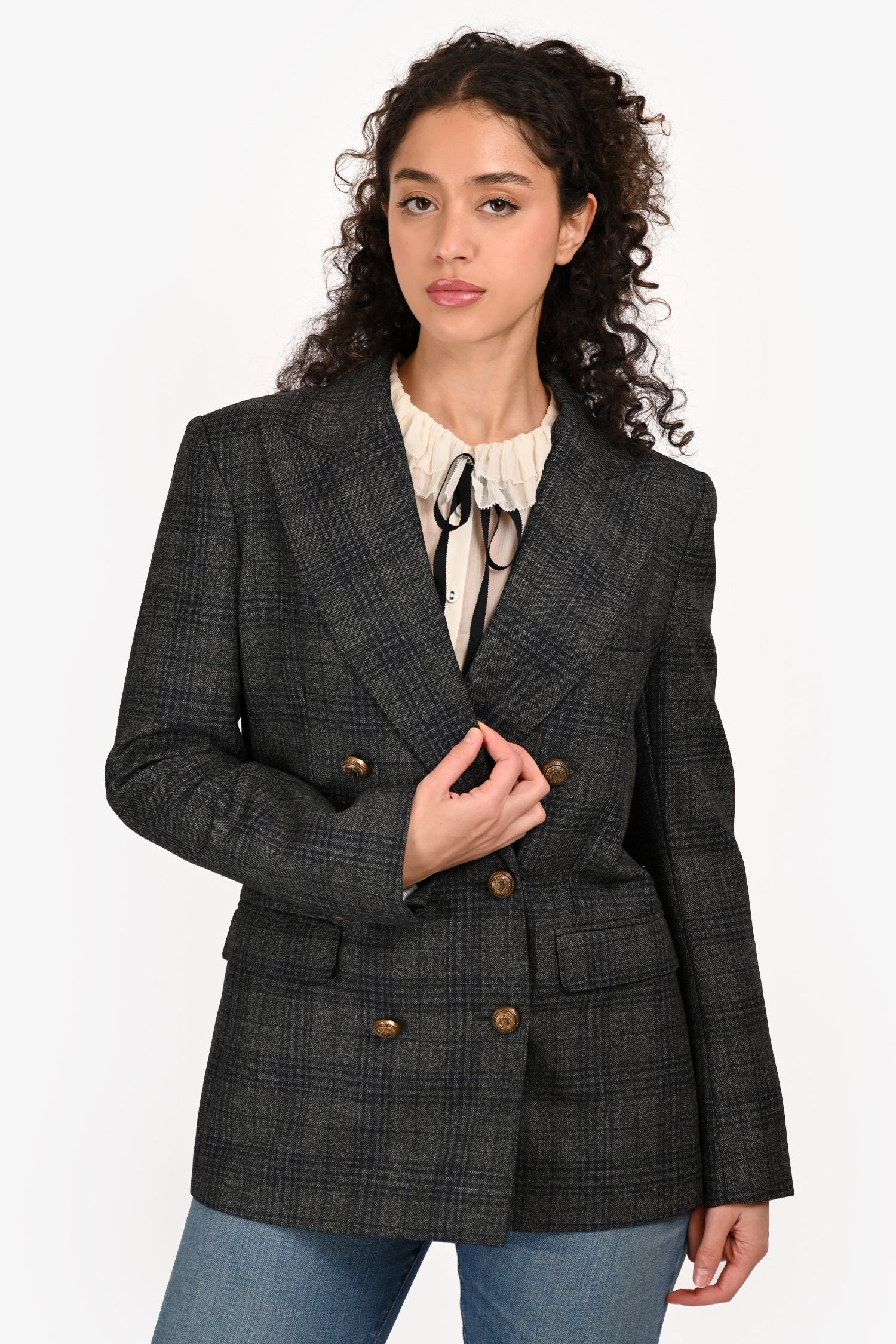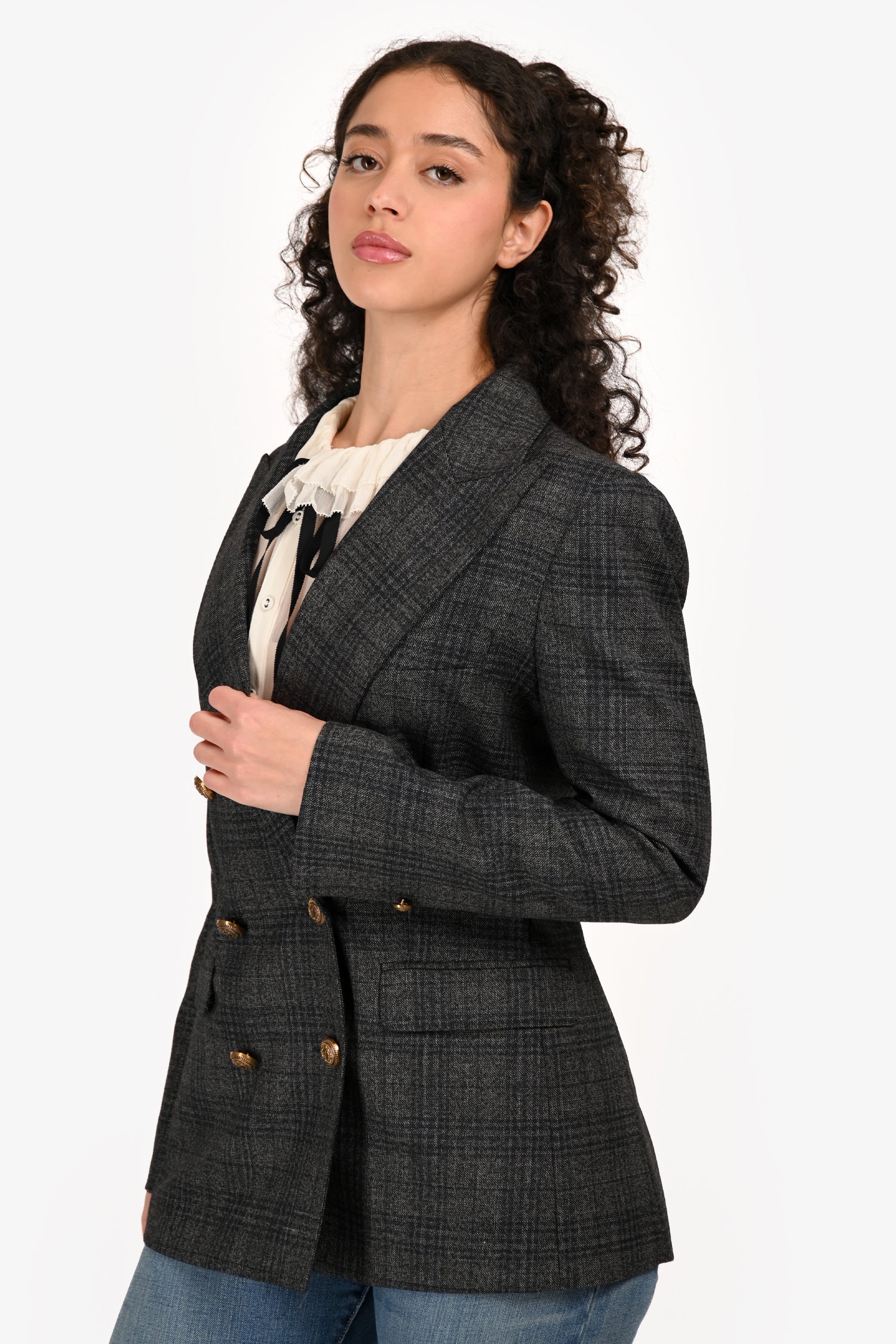 Refresh availabilitySandro Grey Check Double Breasted Blazer. Slip-on. Peak lapels. Button closure in the front. 2 pockets with fold-over closure in the front. Lined. Gold-tone hardware. Tonal stitching.
