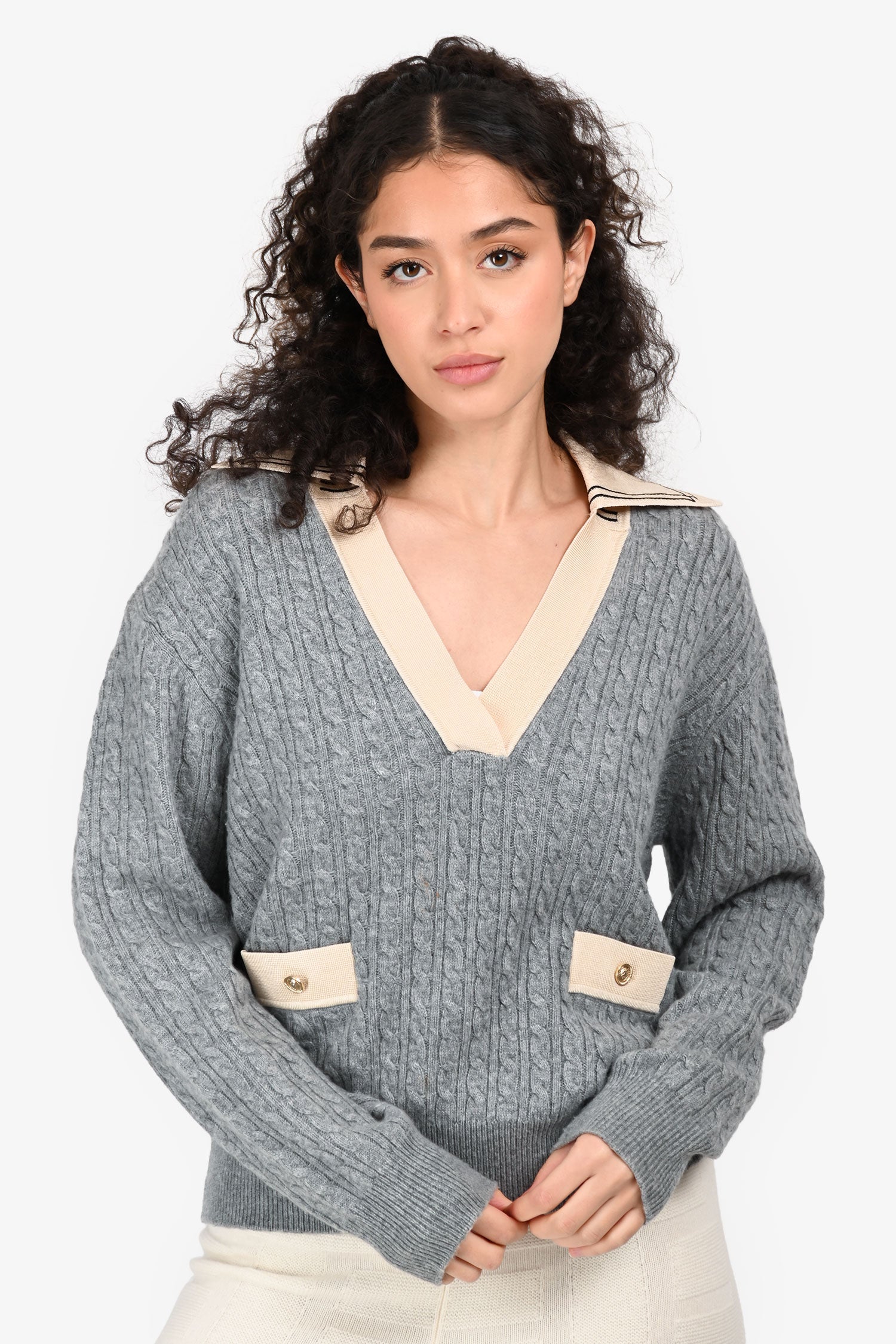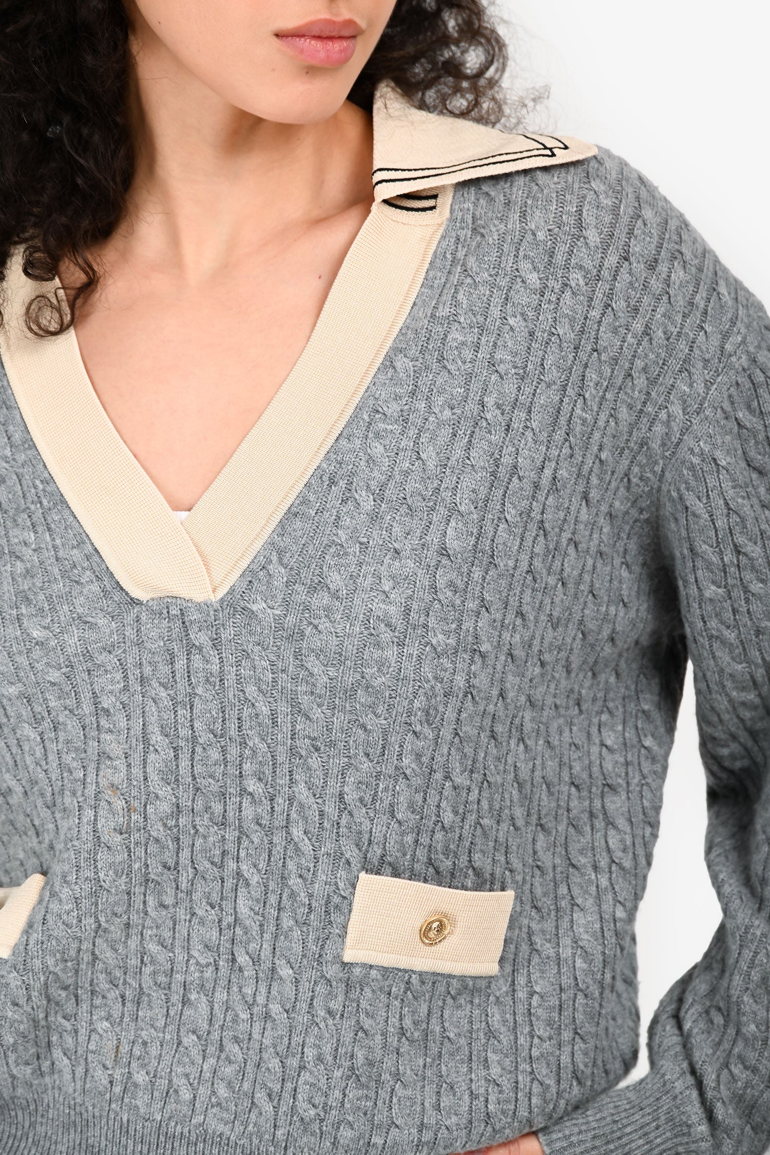 Refresh availabilitySandro Grey/Beige Wool Pocket Detail Sweater. Slip-on. V-neckline with collar. Ribbed cuffs and hem. 2 exterior slip pockets with button details. Gold-tone hardware. Tonal stitching.