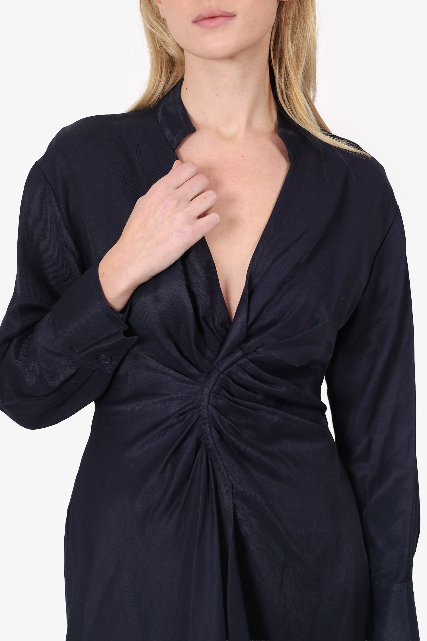 Refresh availabilitySandro Navy Linen Blend Mini Shirt Dress. Slip-on. V-neckline. Sleeve cuffs with button-up closure. Tonal stitching.