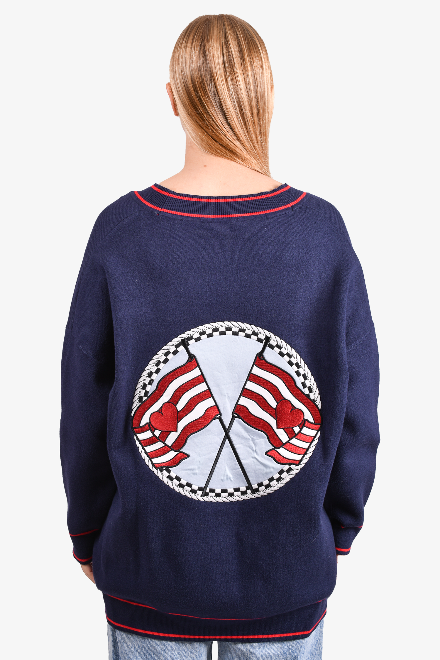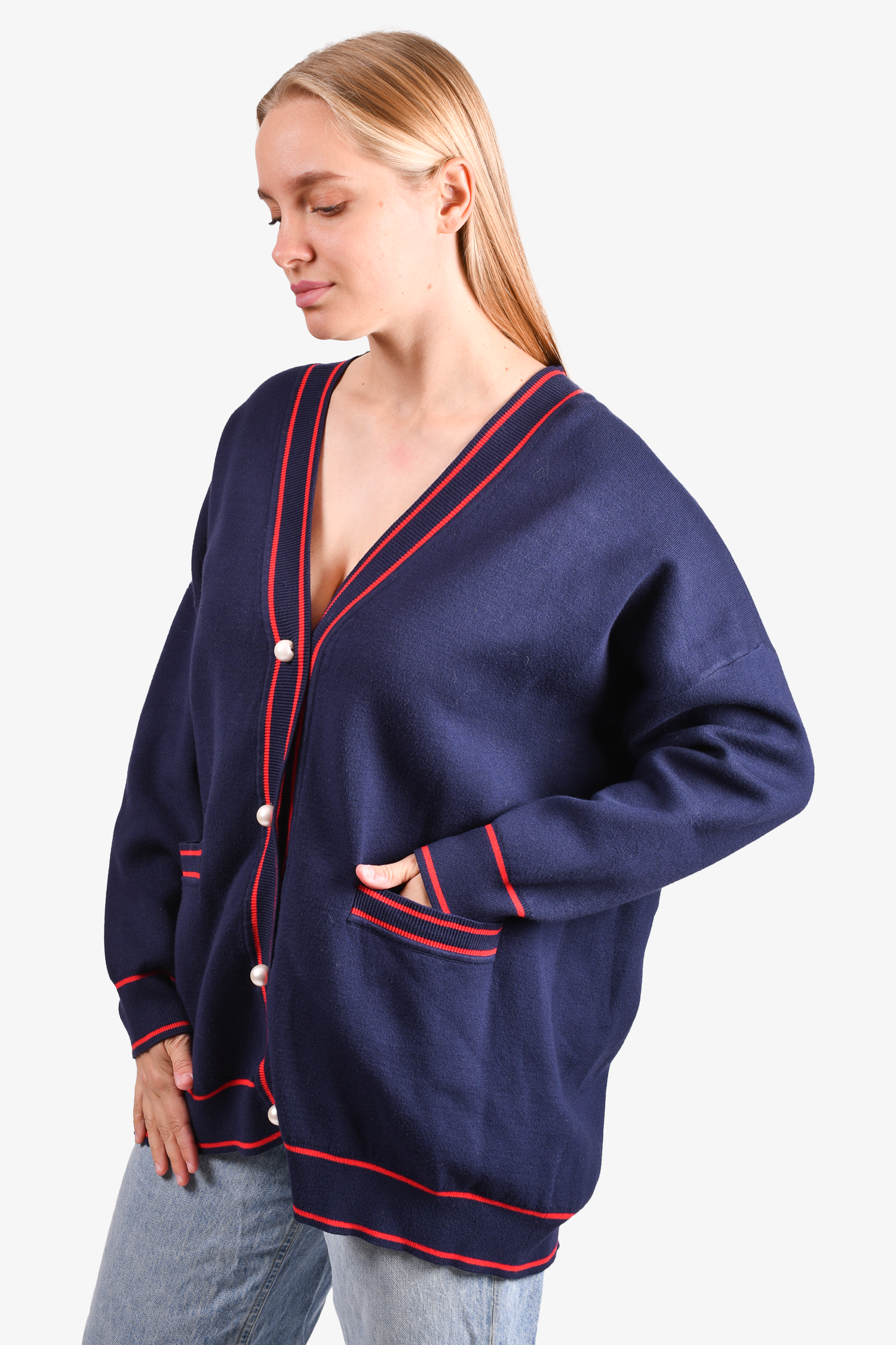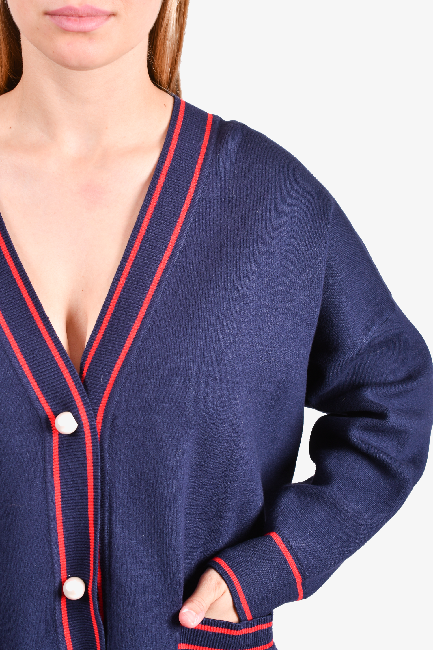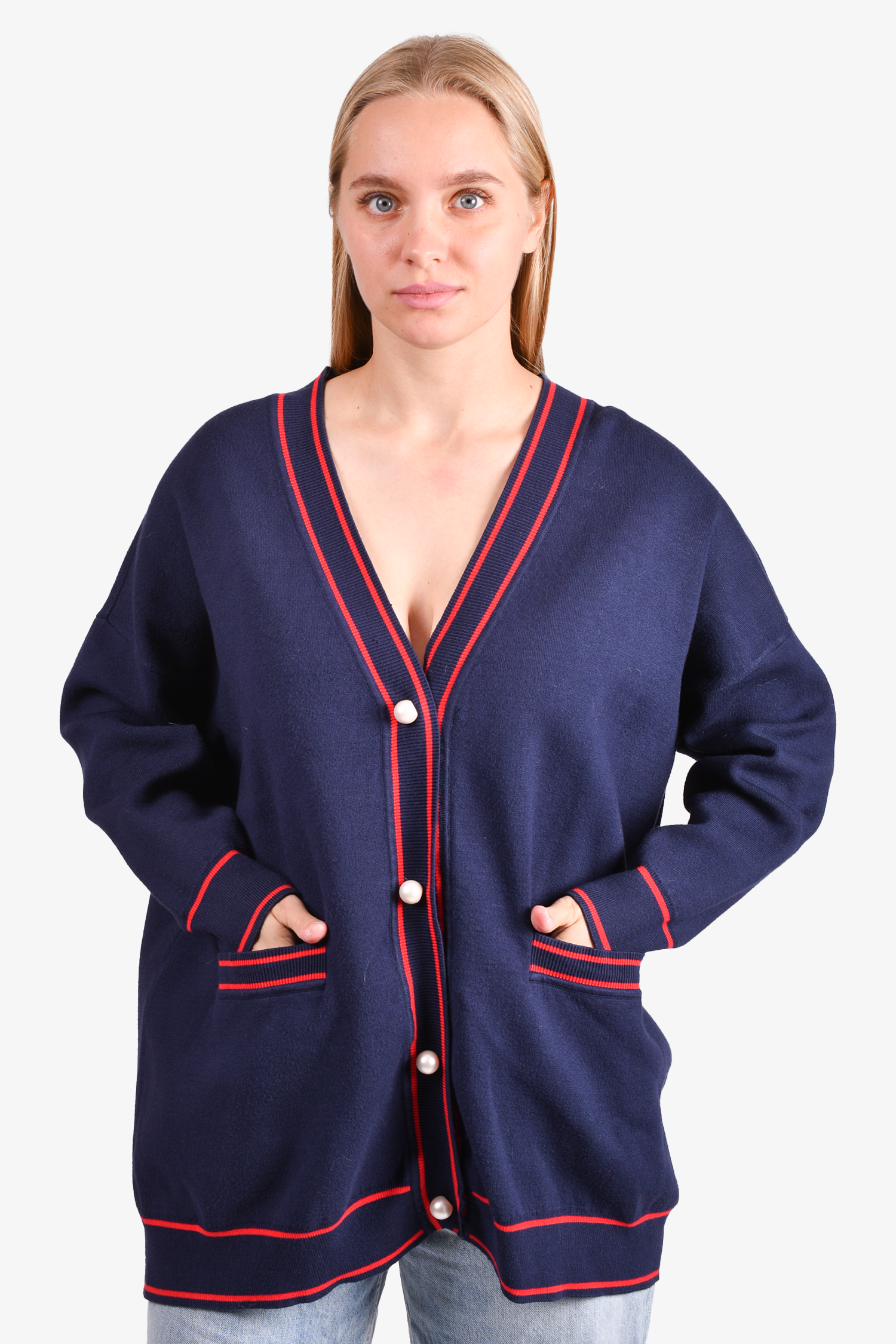 Refresh availabilitySandro Navy/Red Heart Print Cardigan. Front button-up closure. Frot pockets. Ribbed cuffs and hem. Tonal stitching.