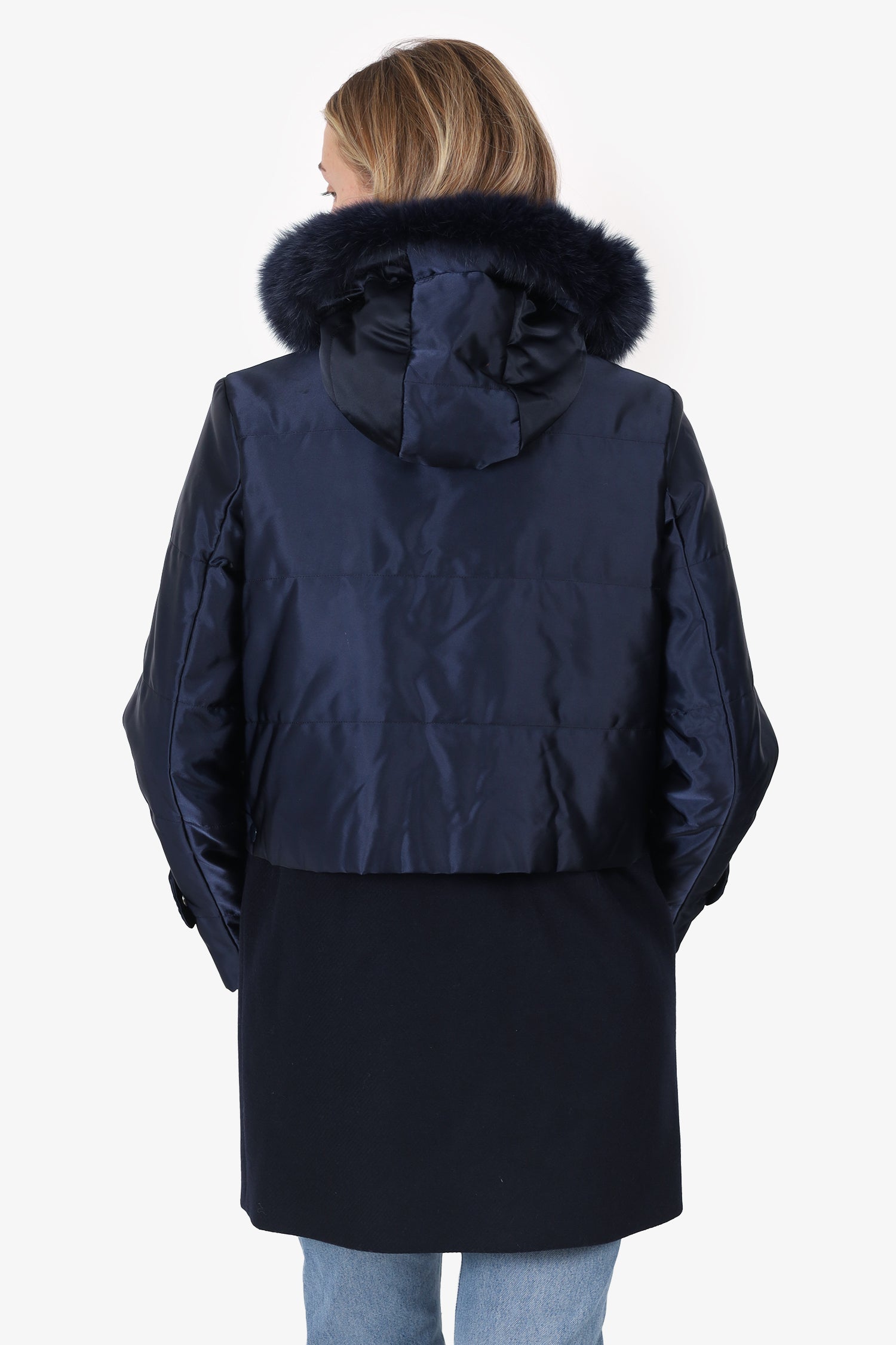 Sandro Navy Wool/Satin Fox Fur Hooded Coat Size 36