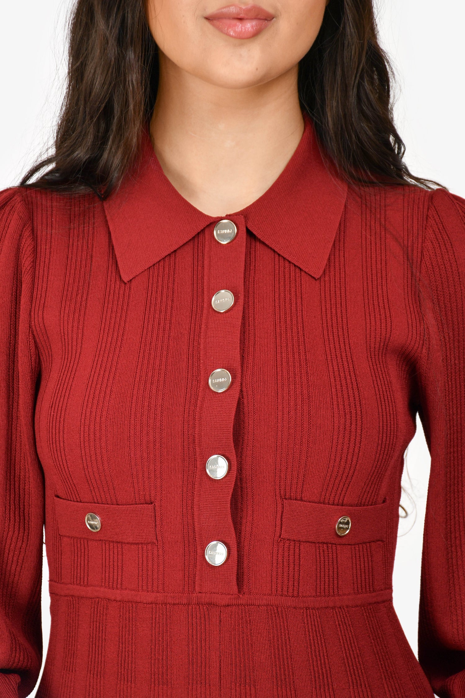 Refresh availabilitySandro Red Rib Knit Long Sleeve Mini Dress Size 38. Front silver-tone button-up closure. Ribbed neckline and cuffs. Two front faux pockets. Tonal stitching.