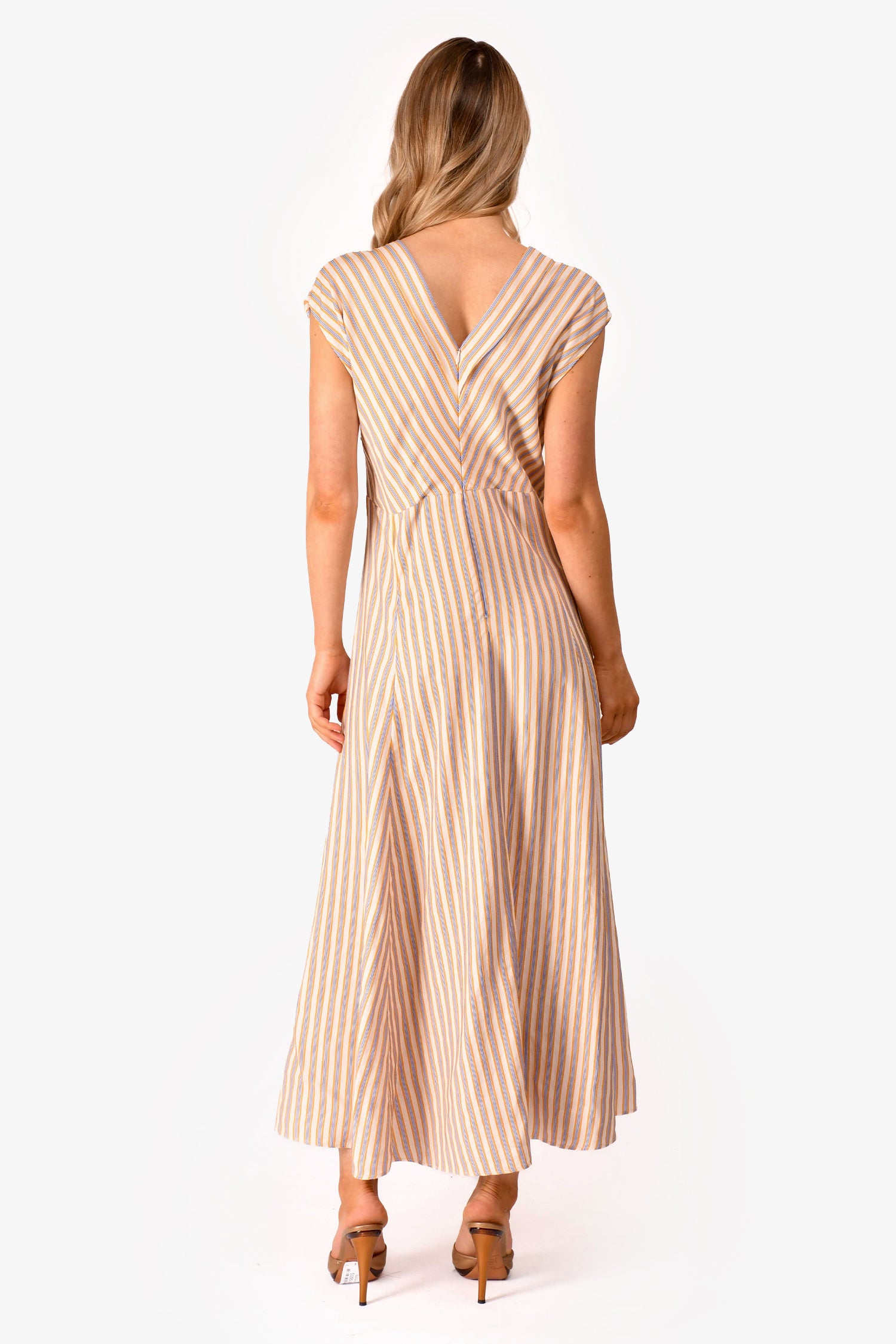 Refresh availabilitySandro Yellow/Navy/Blush Striped V-Neck Sleeveless Midi Dress. Rear zip closure. Unlined. Tonal stitching.