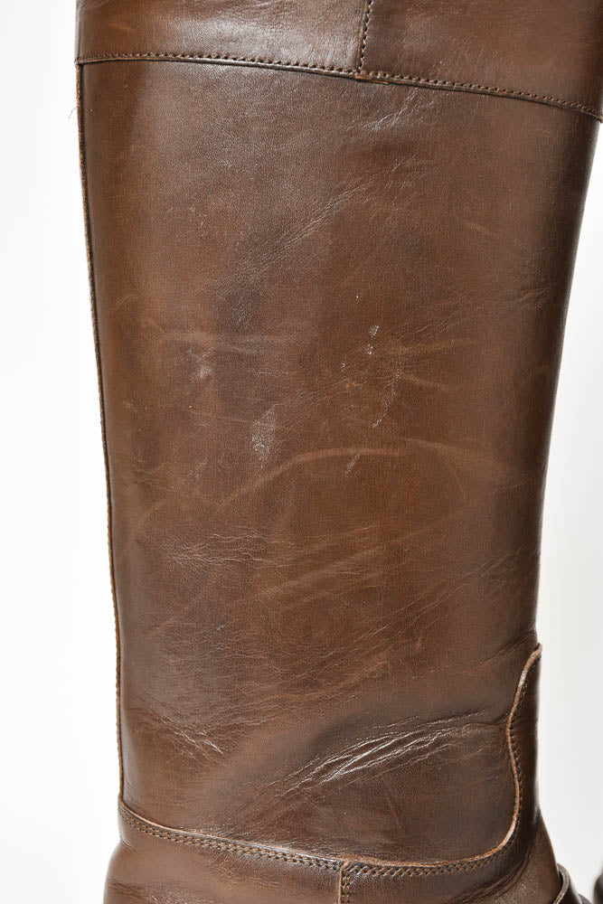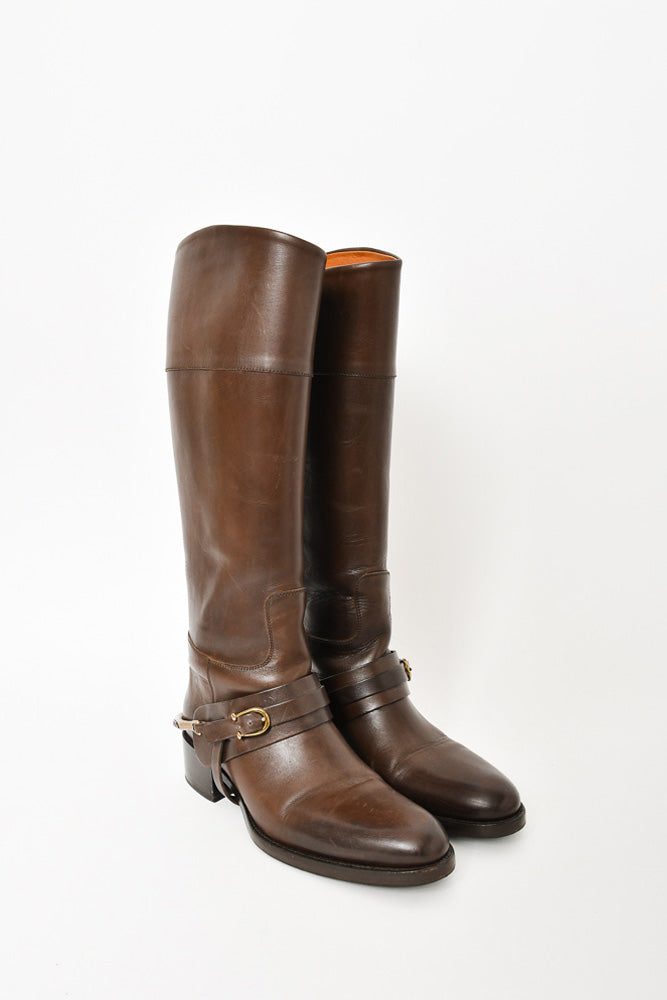 Refresh availabilitySartore Brown Leather Knee Boots with Buckle. Slip on. Round toe. Buckle detail. Gold-tone hardware. Topy bottoms. Tonal stitching.