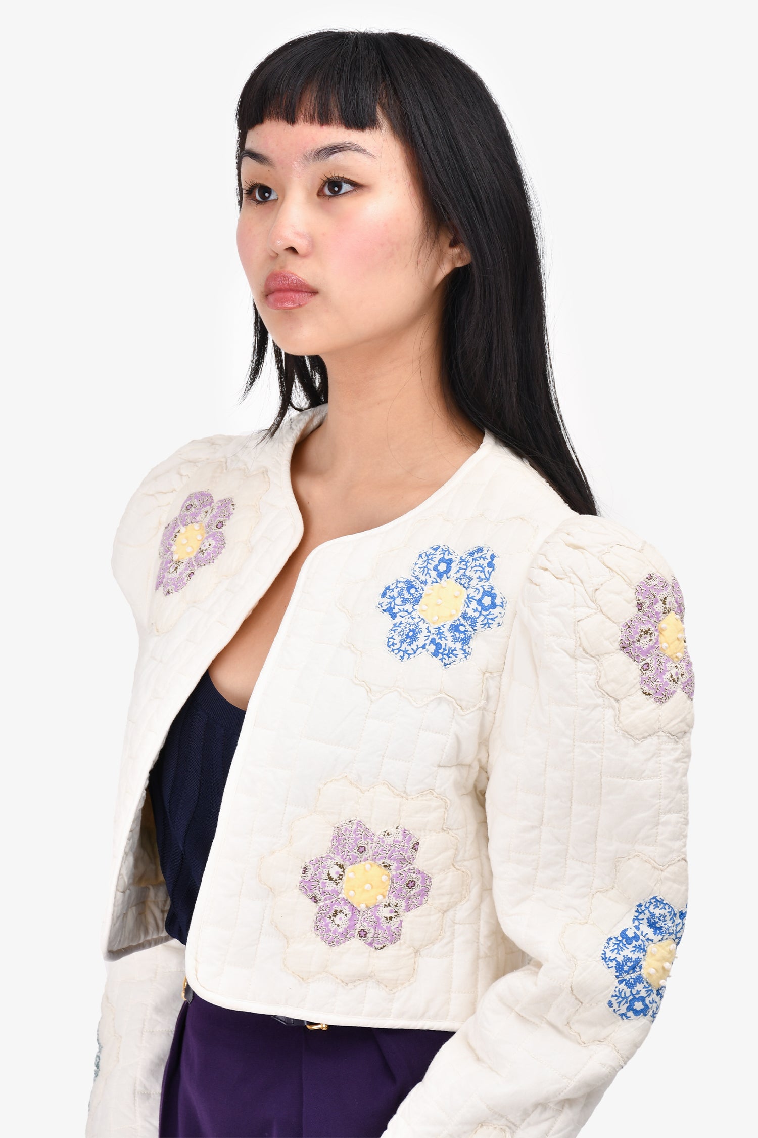 Refresh availabilitySea New York Quilted Floral Cropped Jacket. Open front. Lined. Tonal stitching.