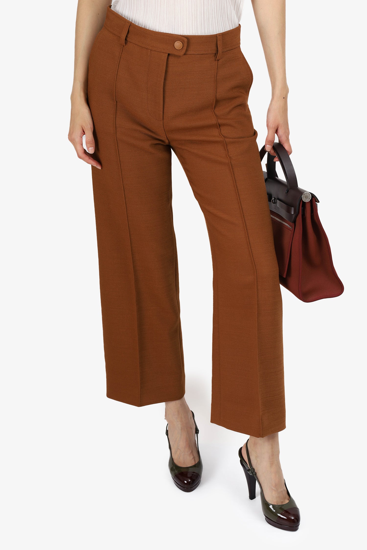 Refresh availabilitySee By Chloe Brown Wide Leg Trousers. Snap button and zip closure. Waist belt loops. 2 front slip pockets. 2 rear pockets with snap button closure. Tonal stitching.