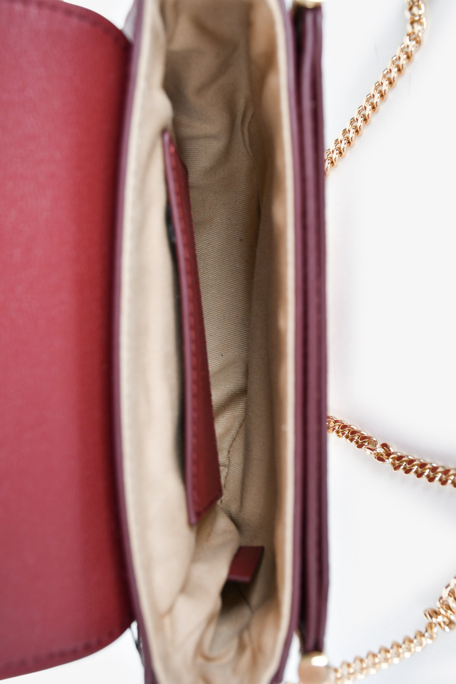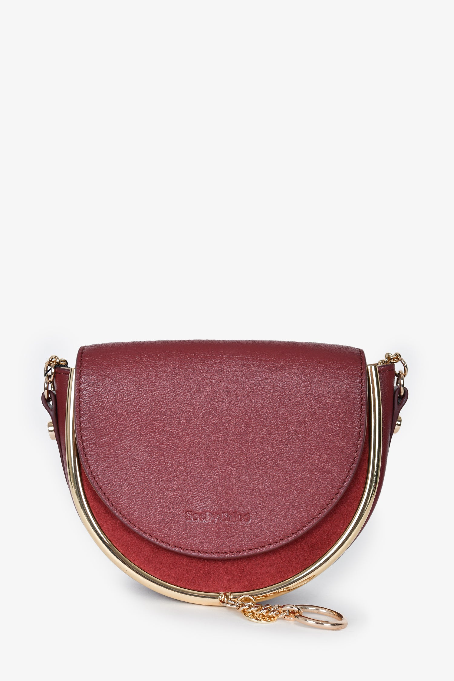Refresh availabilitySee By Chloe Maroon Leather/Suede Gold Hardware "Mara" Crossbody. Front fold-over flap with magnetic button closure. Front slip pocket. Beige textile interior lining. Single interior wall card slot. Gold-tone hardware.