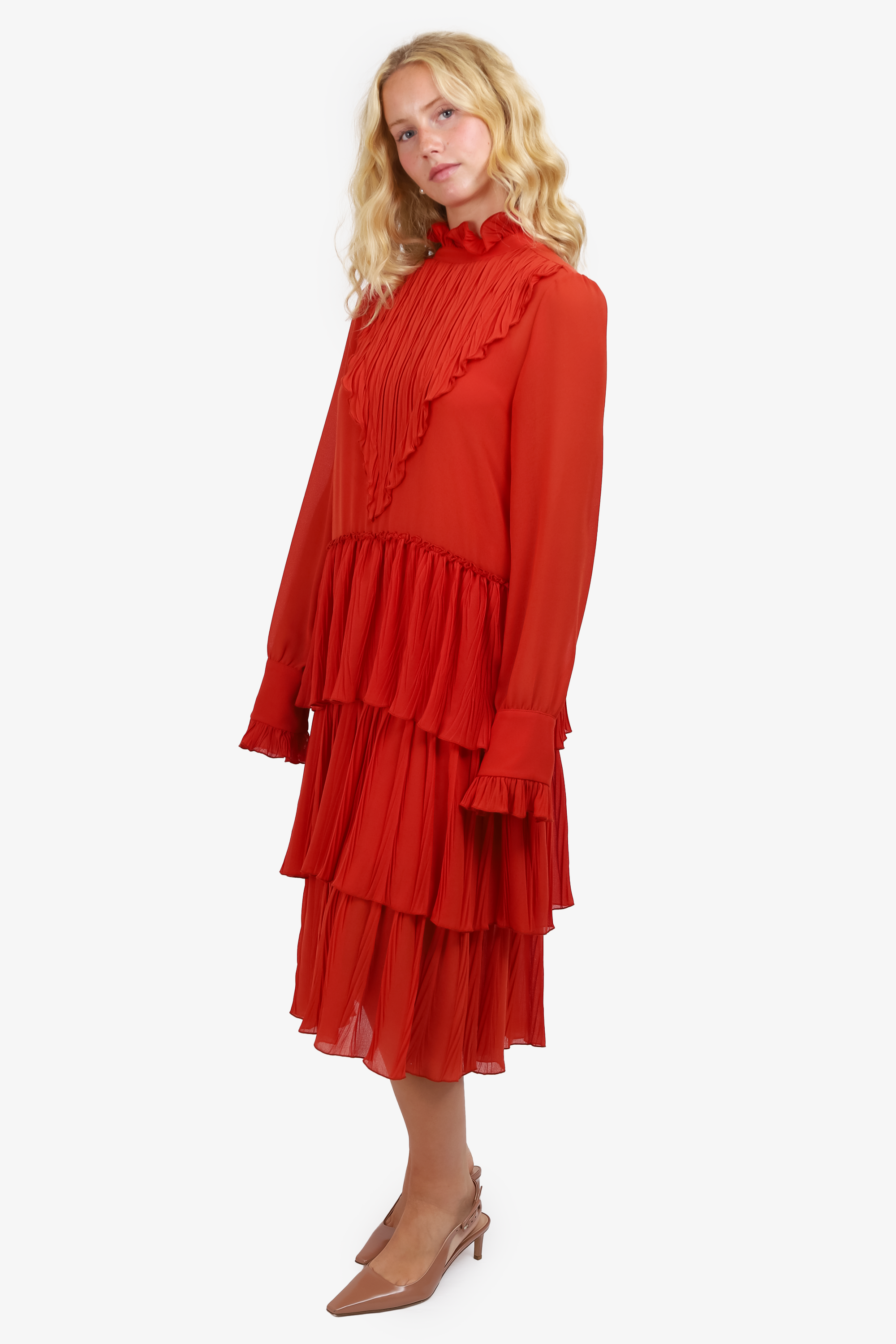 Refresh availabilitySee By Chloe Orange Ruffled Tiered Long-Sleeve Dress. Rear button closure. High neckline. Lined (comes with slip). Tonal stitching.
