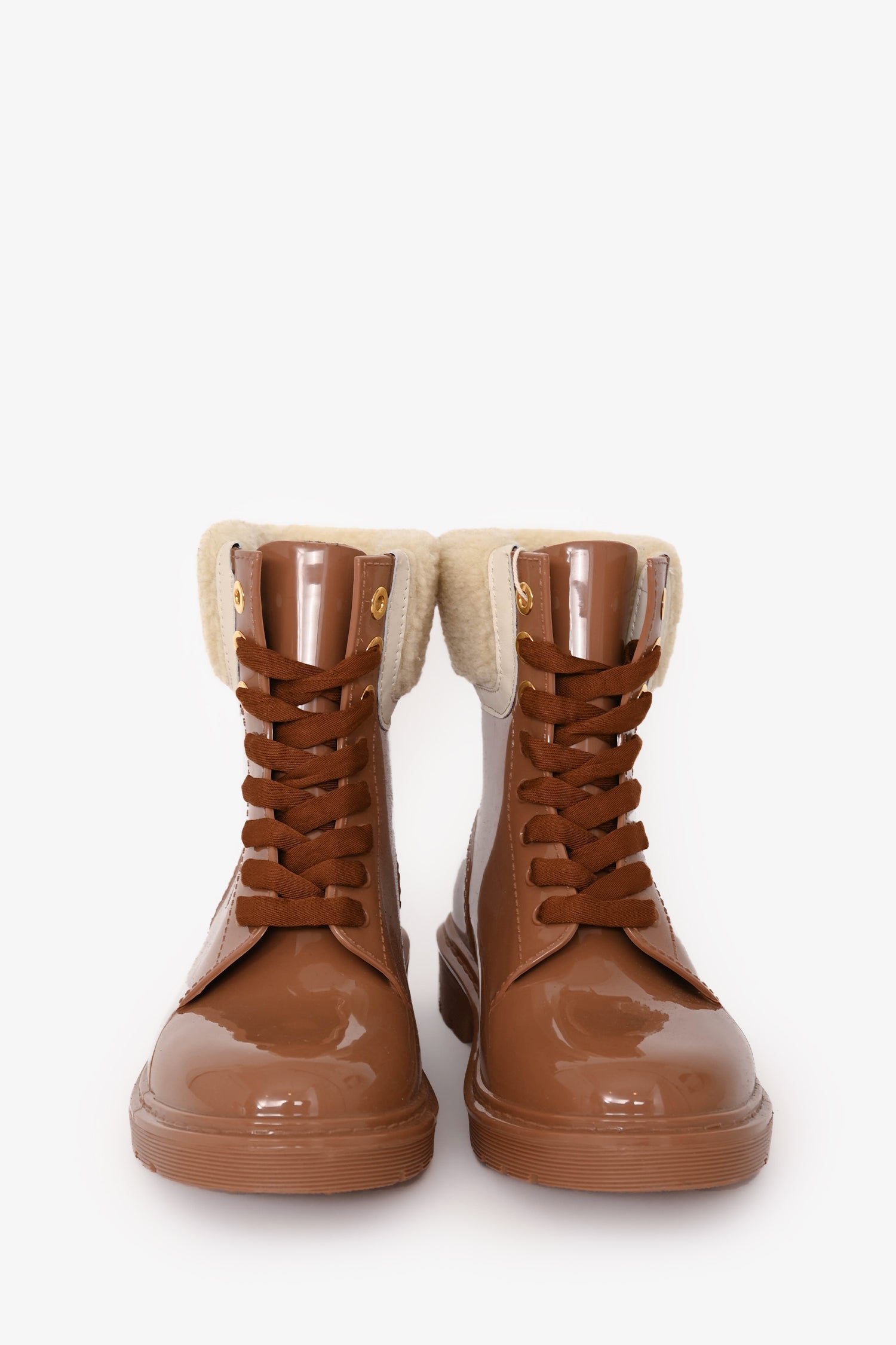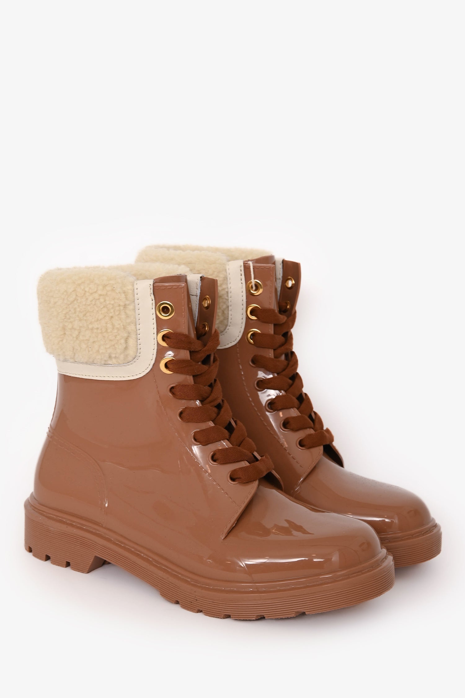 Refresh availabilitySee By Chloe Tan Rubber Faux Shearling 'Florrie' Ankle Boots. Pull-on. Round toe. Lace closure in the front. Gold-tone hardware. Tonal stitching.