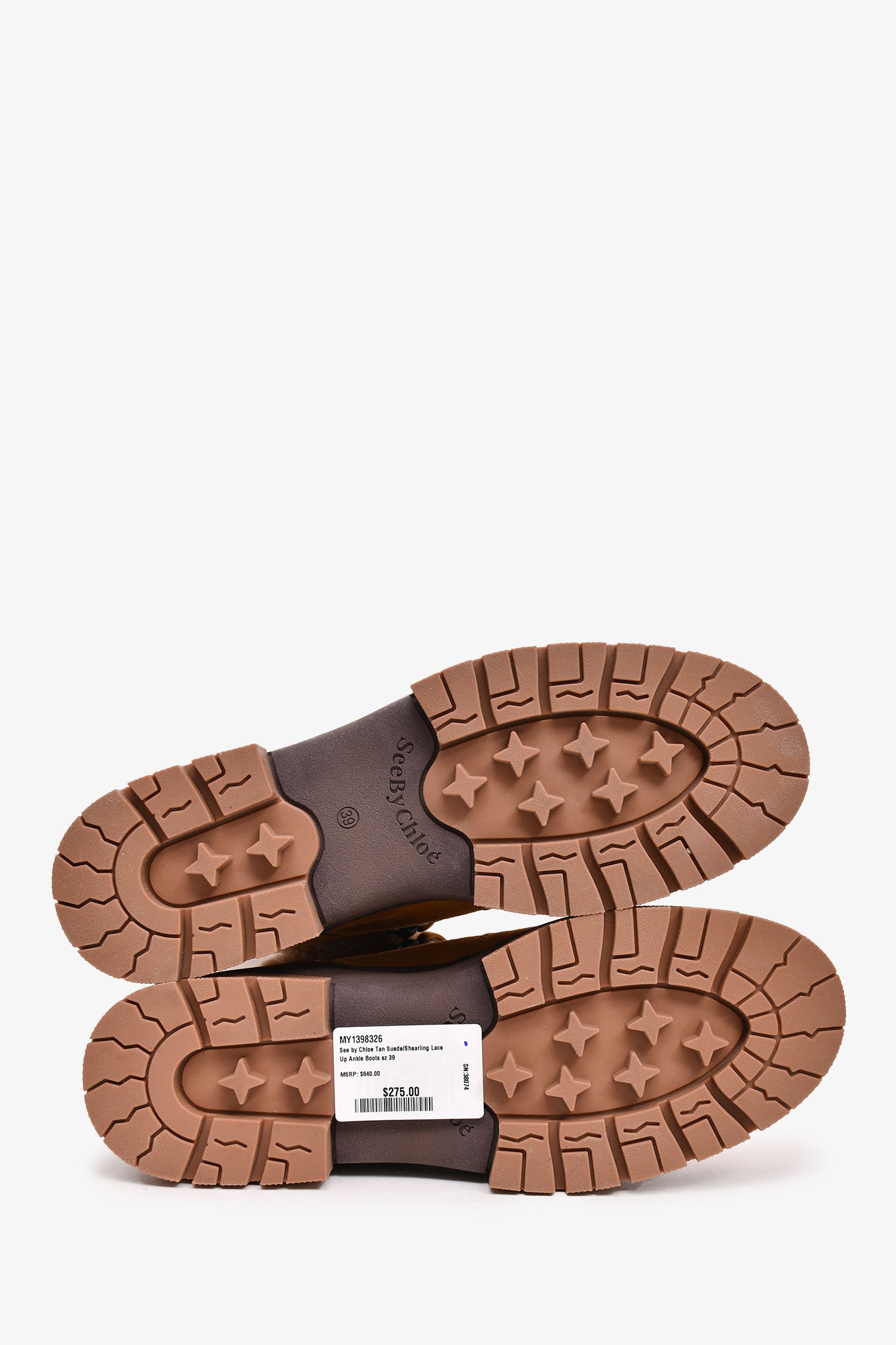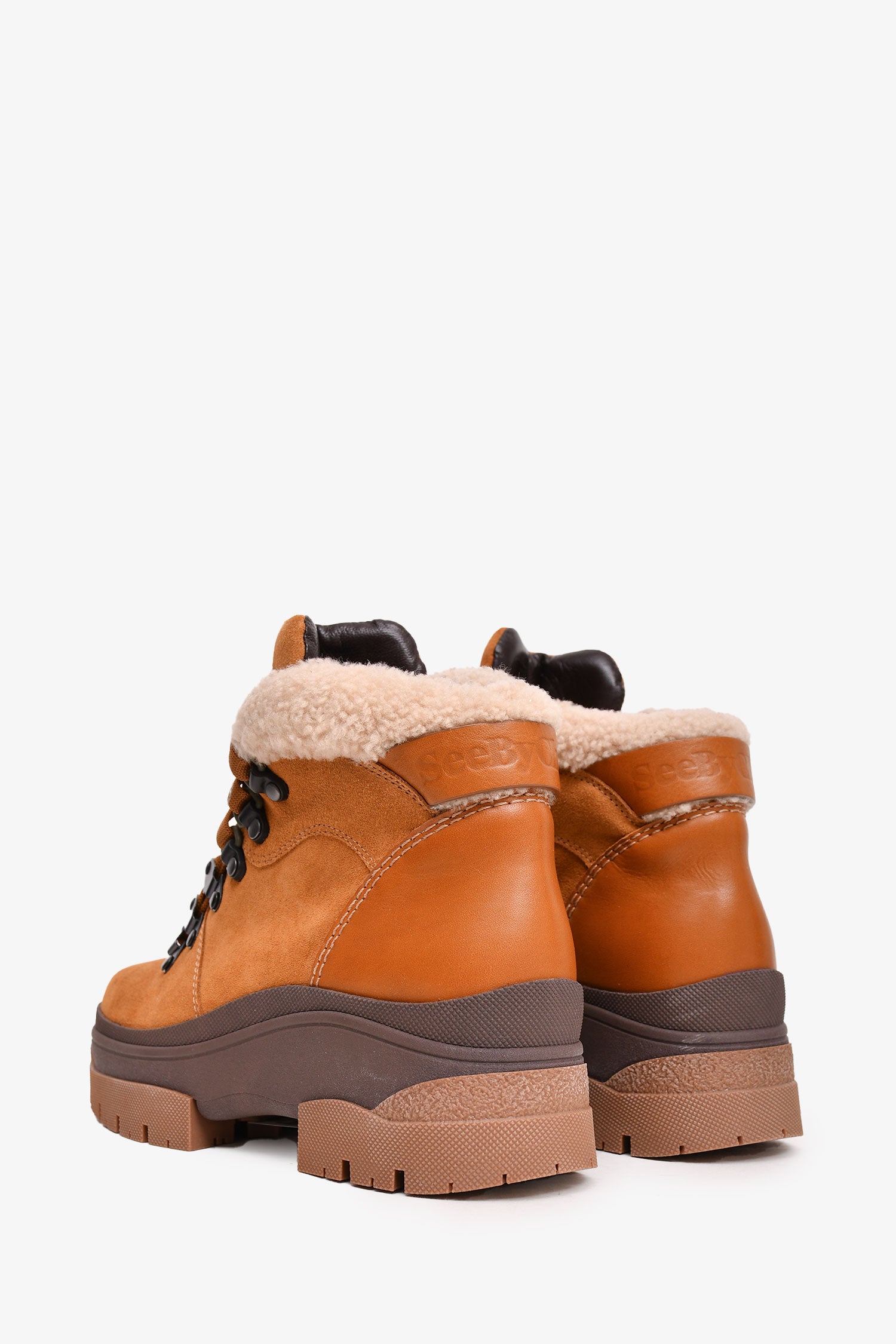 Refresh availabilitySee by Chloe Tan Suede/Shearling Lace-Up Ankle Boots. Round toe. Pull-on. Treaded bottoms.