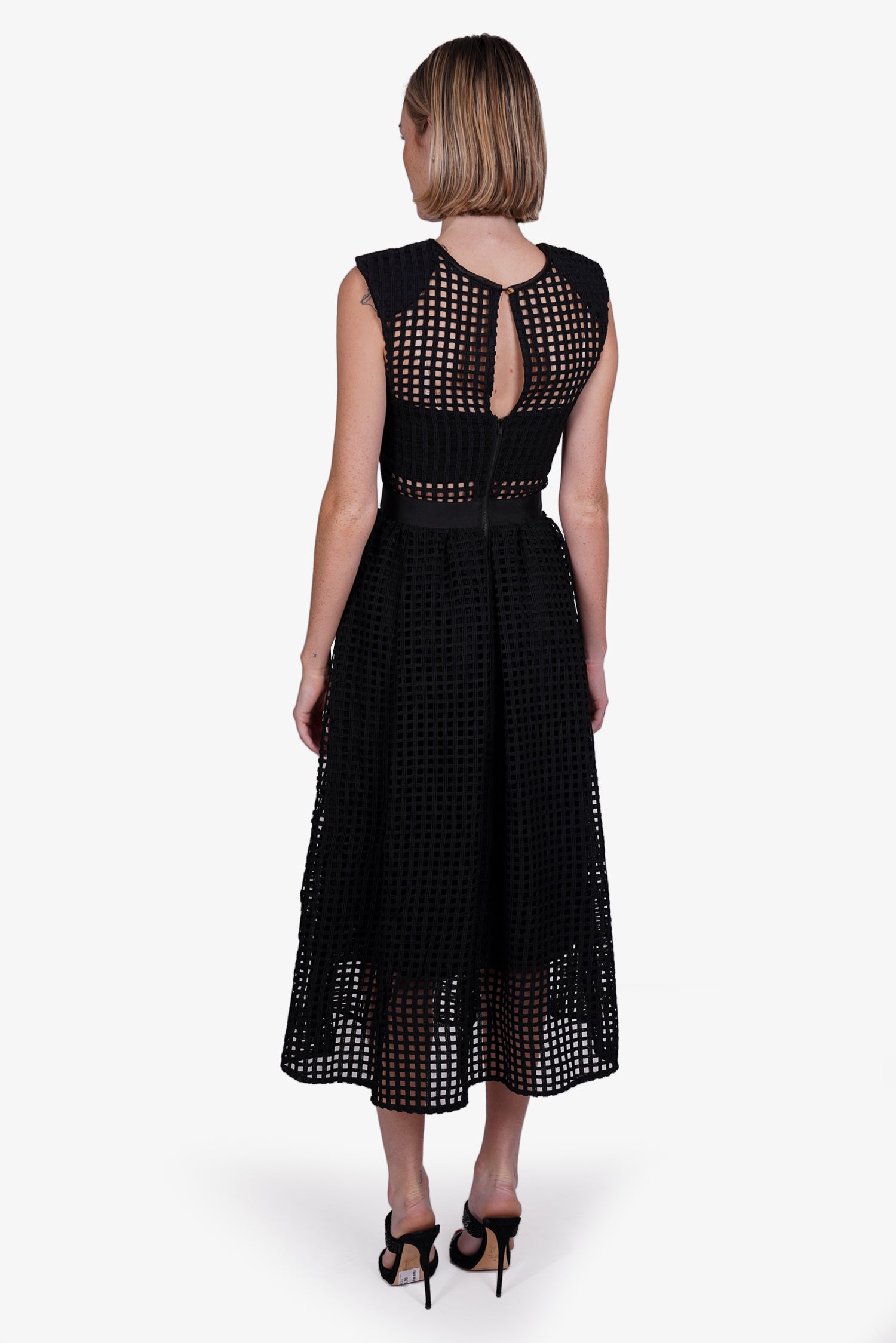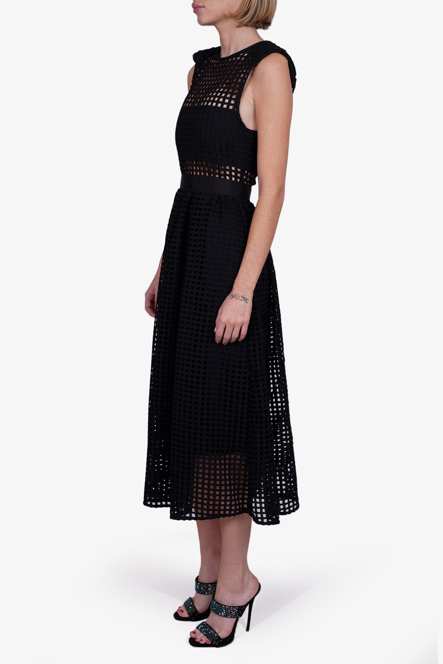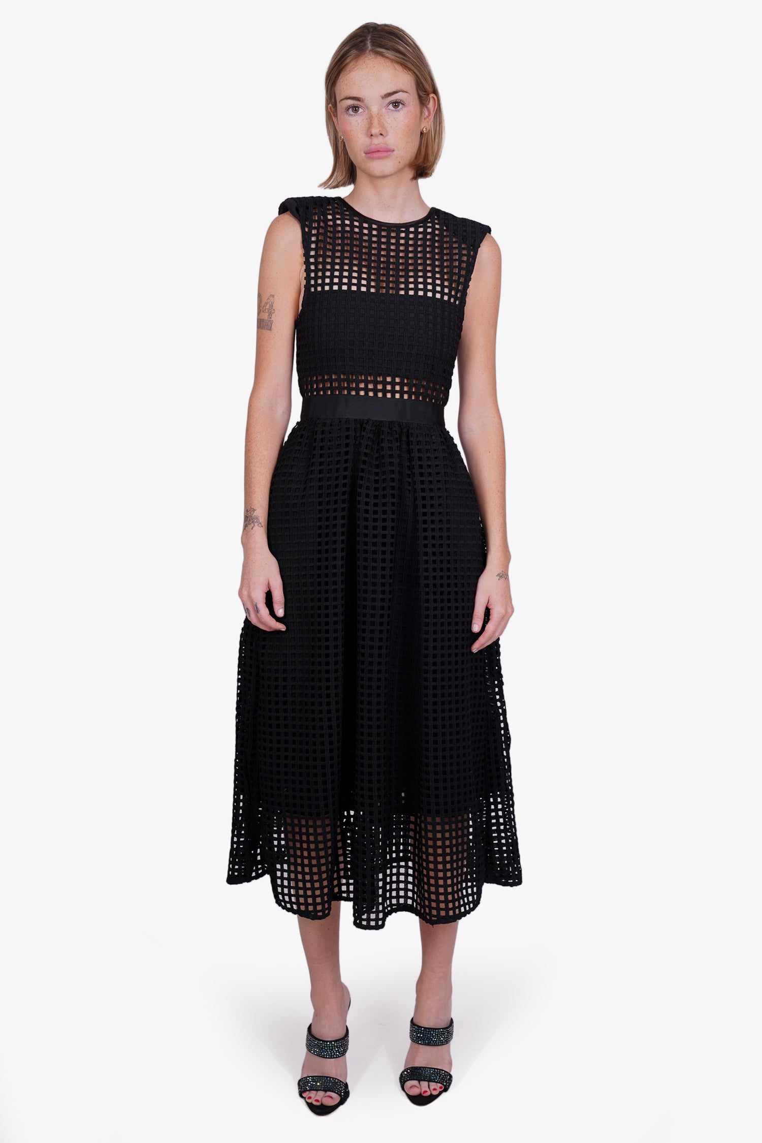 Refresh availabilitySelf-Portrait Black Cut Out Sleeveless Midi Dress. Round neckline. Shoulder pads. Back button and zip up closure. Interior lining. Gold-toned hardware. Tonal stitching.