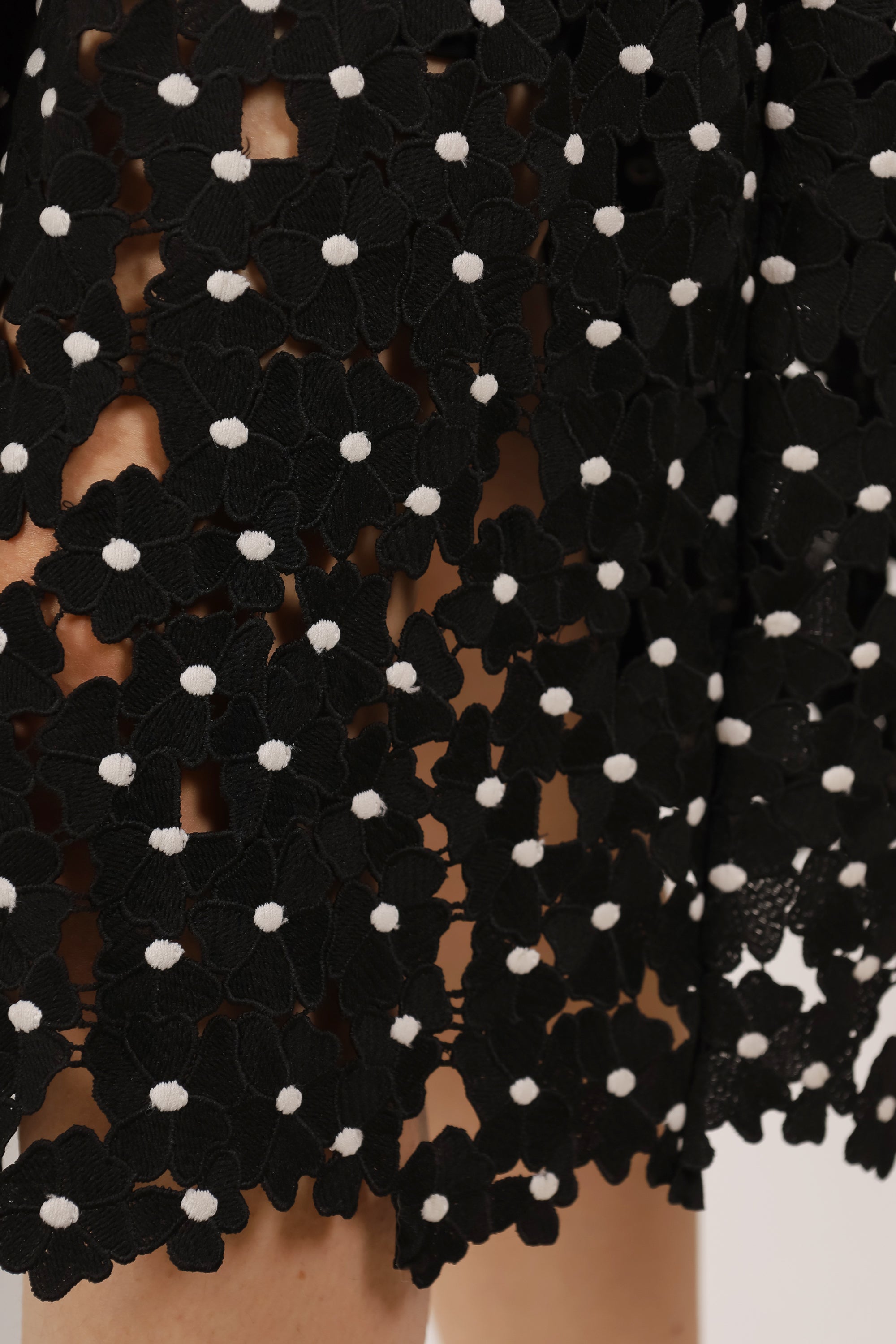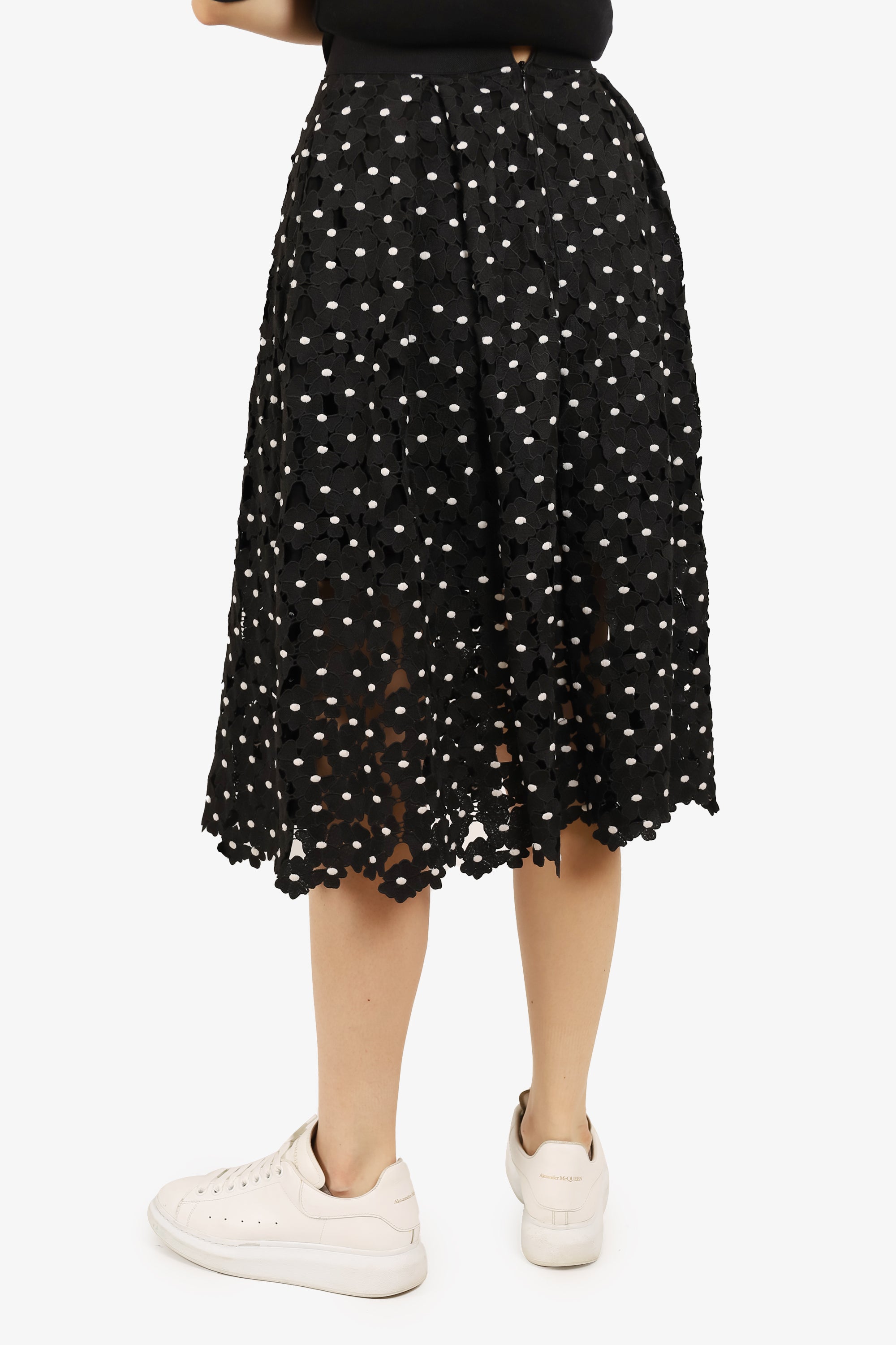 Refresh availabilitySelf-Portrait Black/White 'Polka Daisy' Guipure Lace Midi Skirt. Back zipper and hook closure. Lined. Tonal stitching. Stretch waist band.