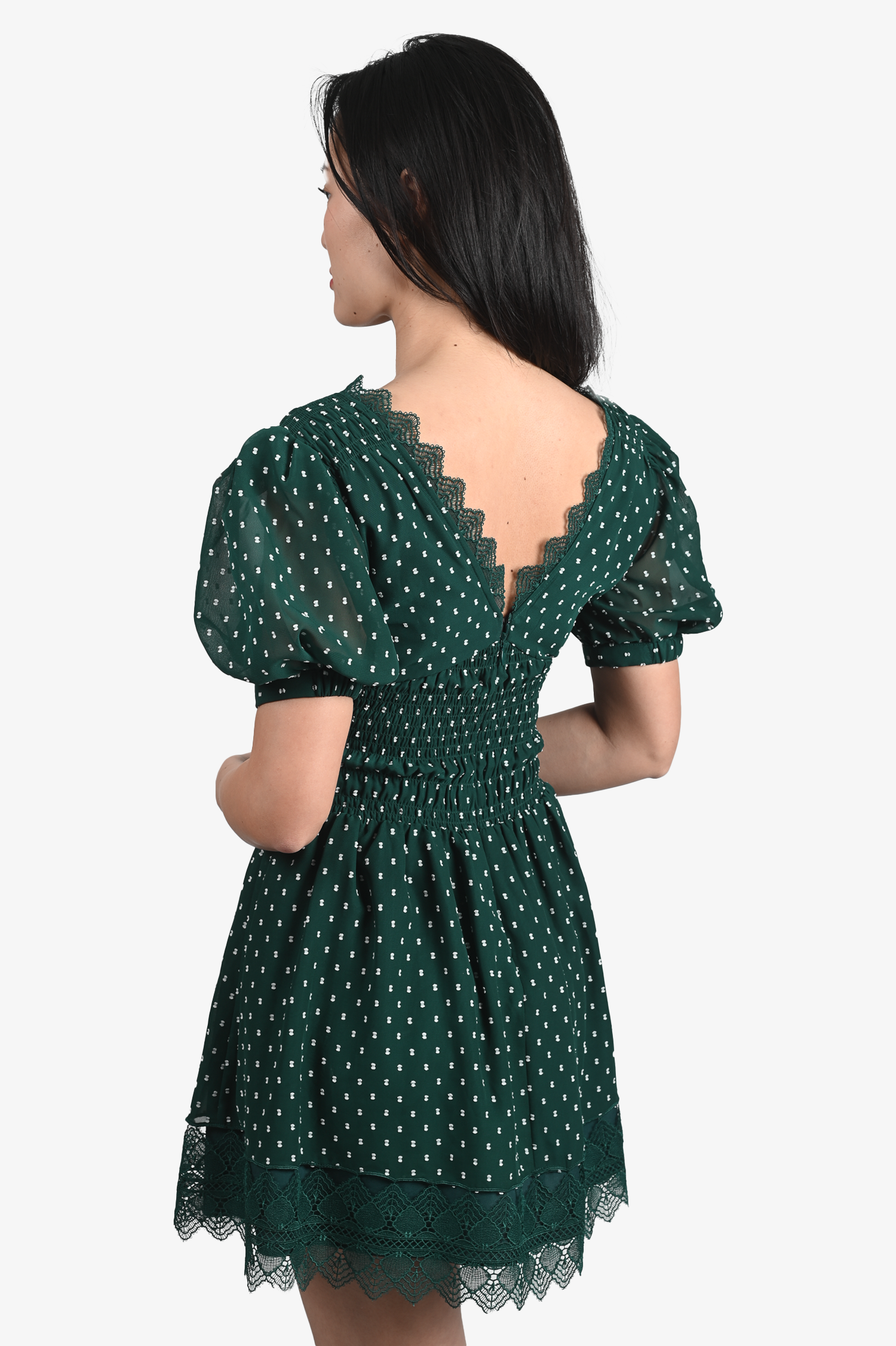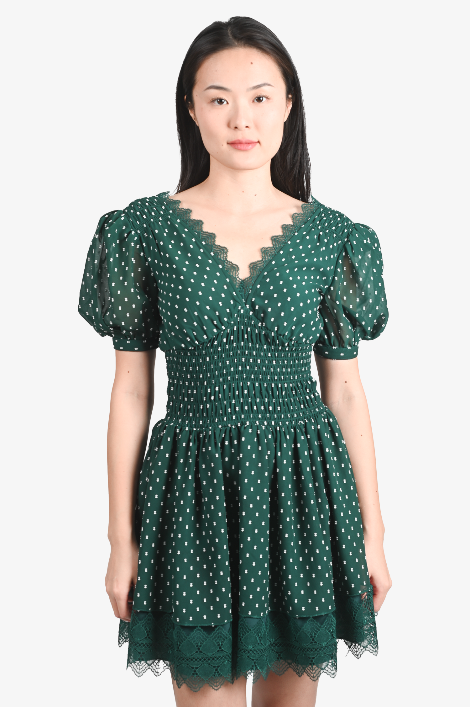 Refresh availabilitySelf Portrait Green/White Embroidered Lace Hem Mini Dress. Rear zip and hook closure. V-neck with lace trim. Elasticized cuffs. Lined. Tonal stitching.
