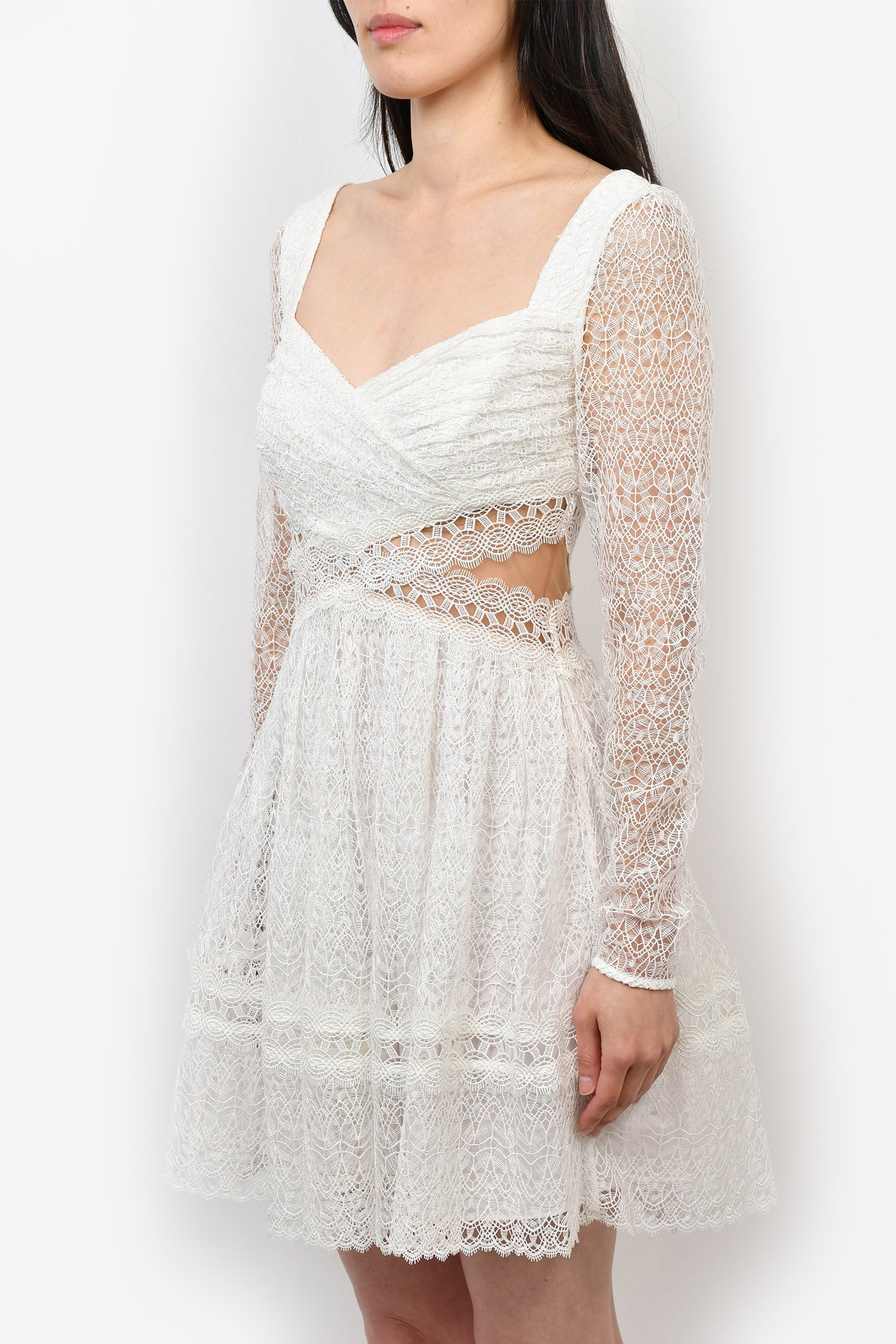 Refresh availabilitySelf-Portrait White Lace with Beige Mesh Cut Out Mini Dress. Rear zip closure. Lined. Tonal stitching.