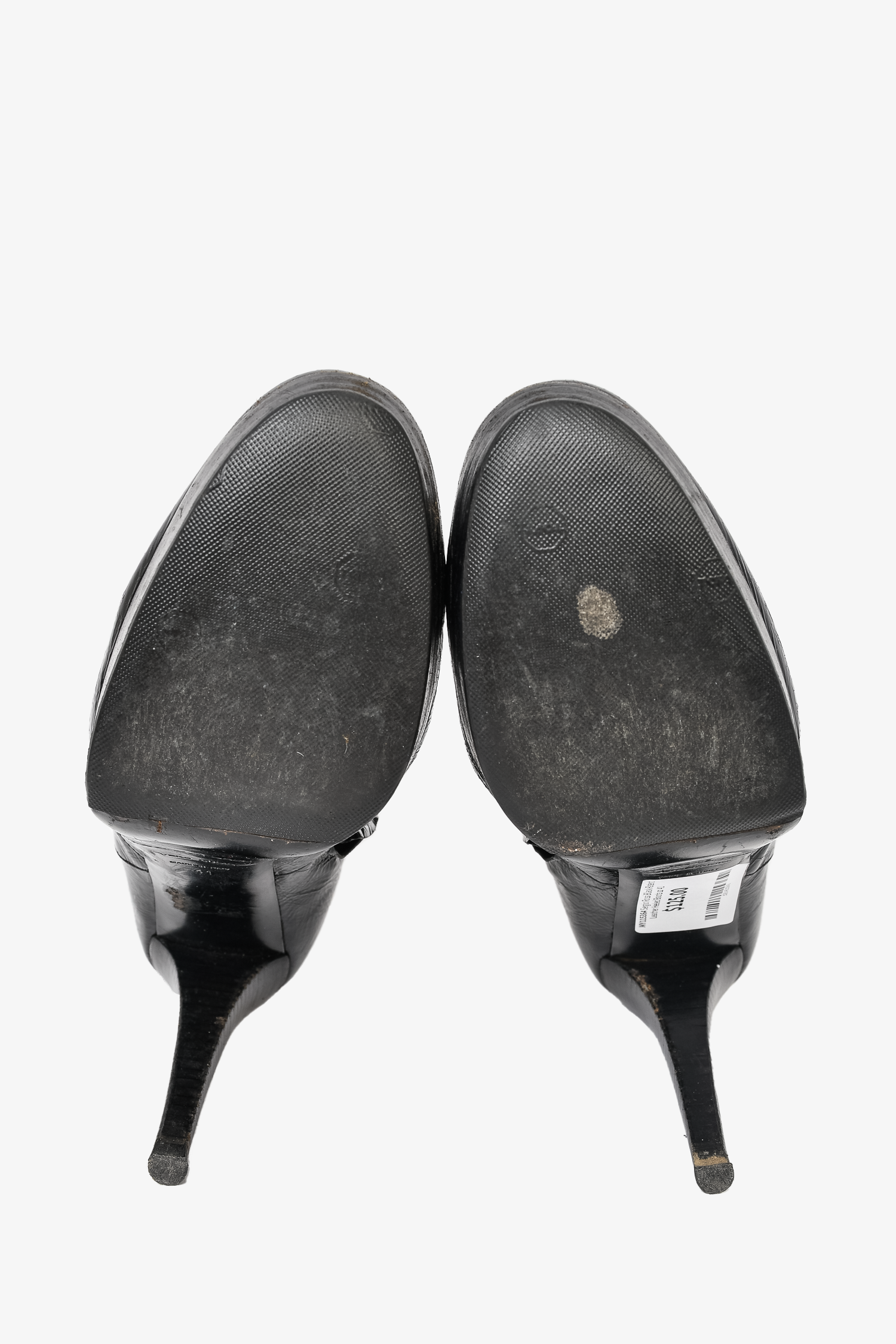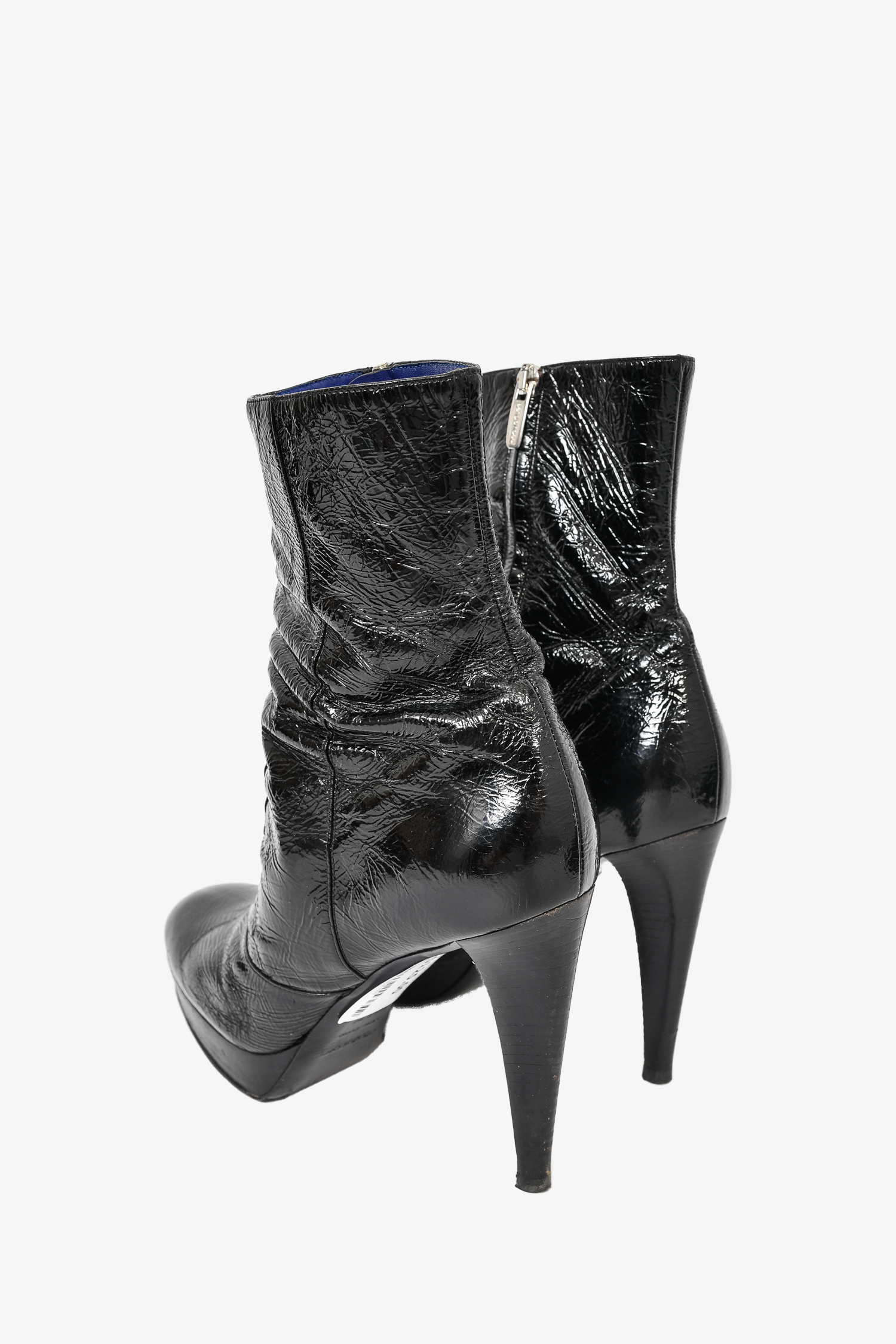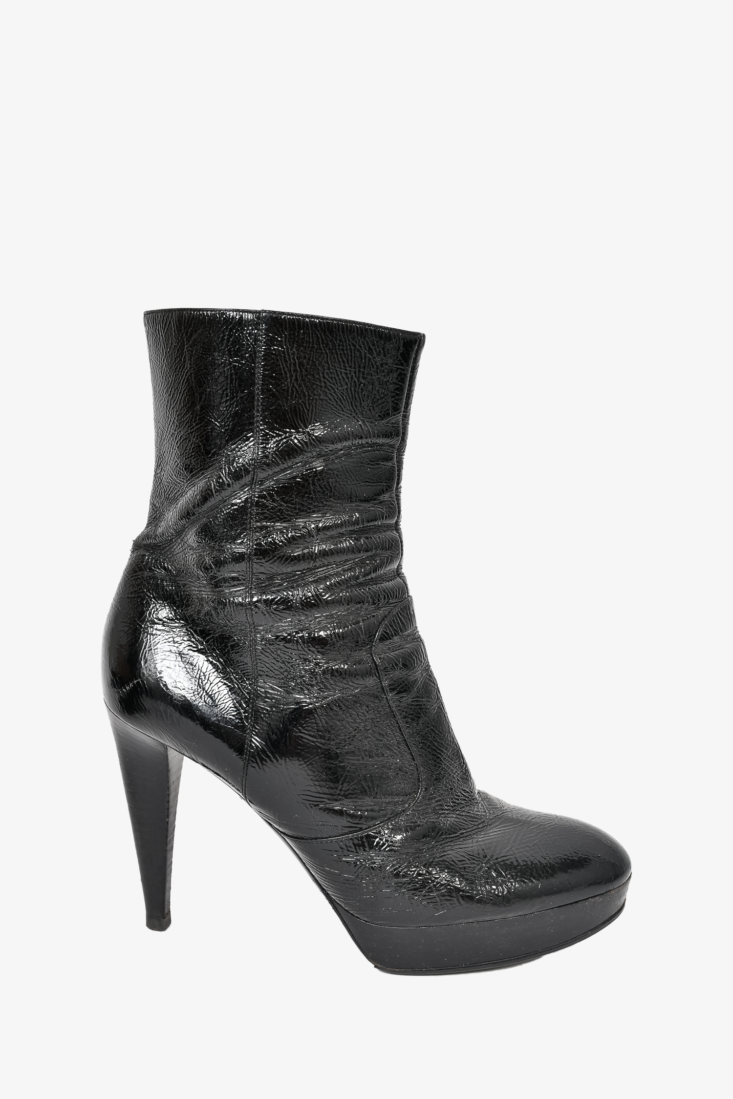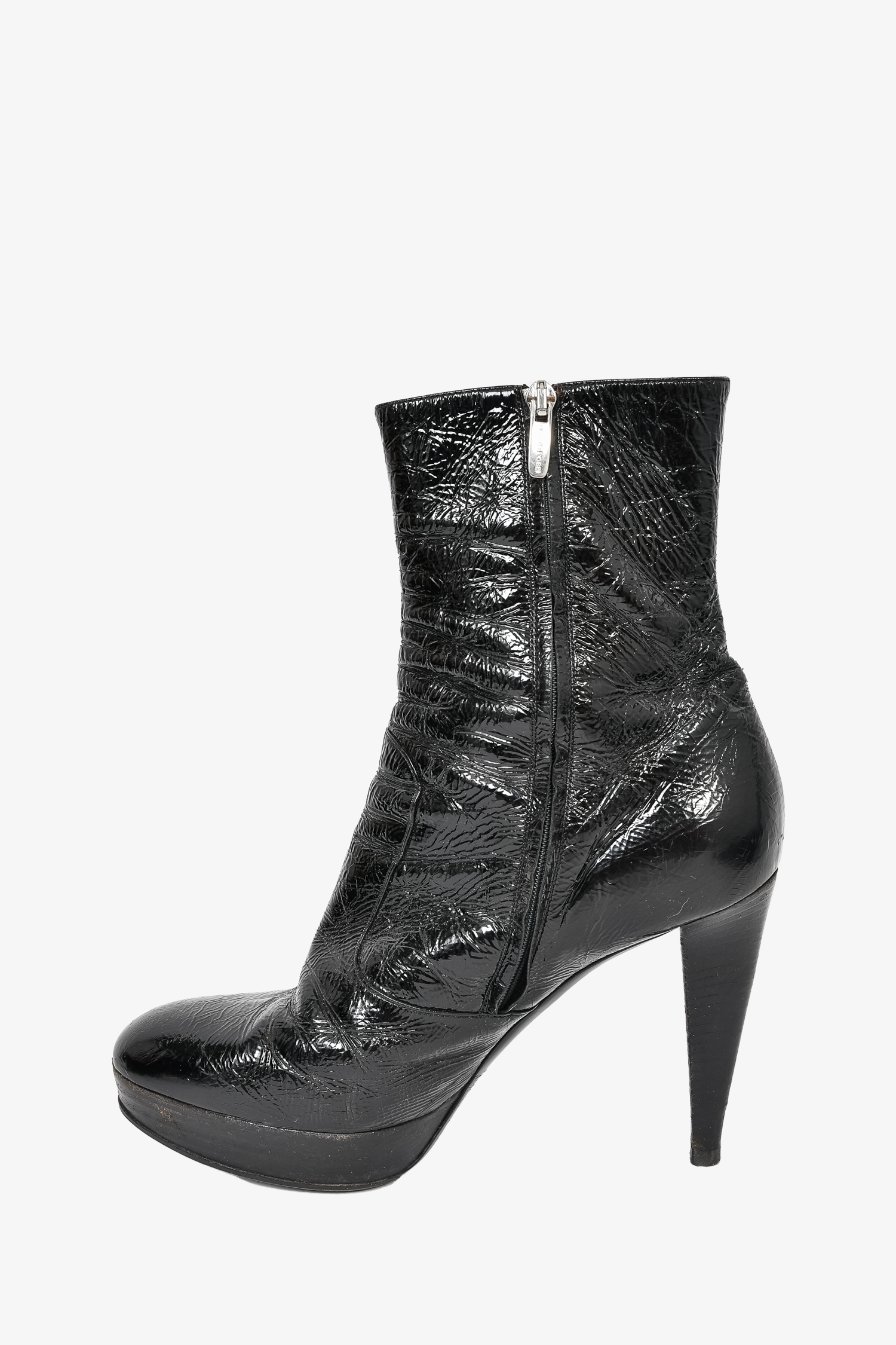 Refresh availabilitySergio Rossi Black Patent Leather Heeled Boots. Round toe. Side zip closure. Tonal stitching. Topy soles.