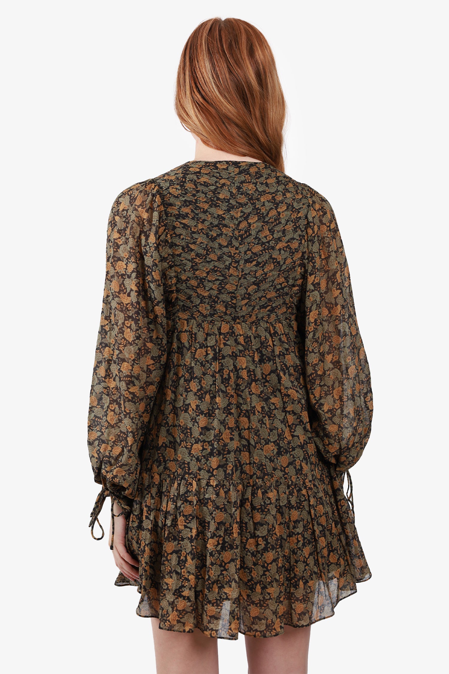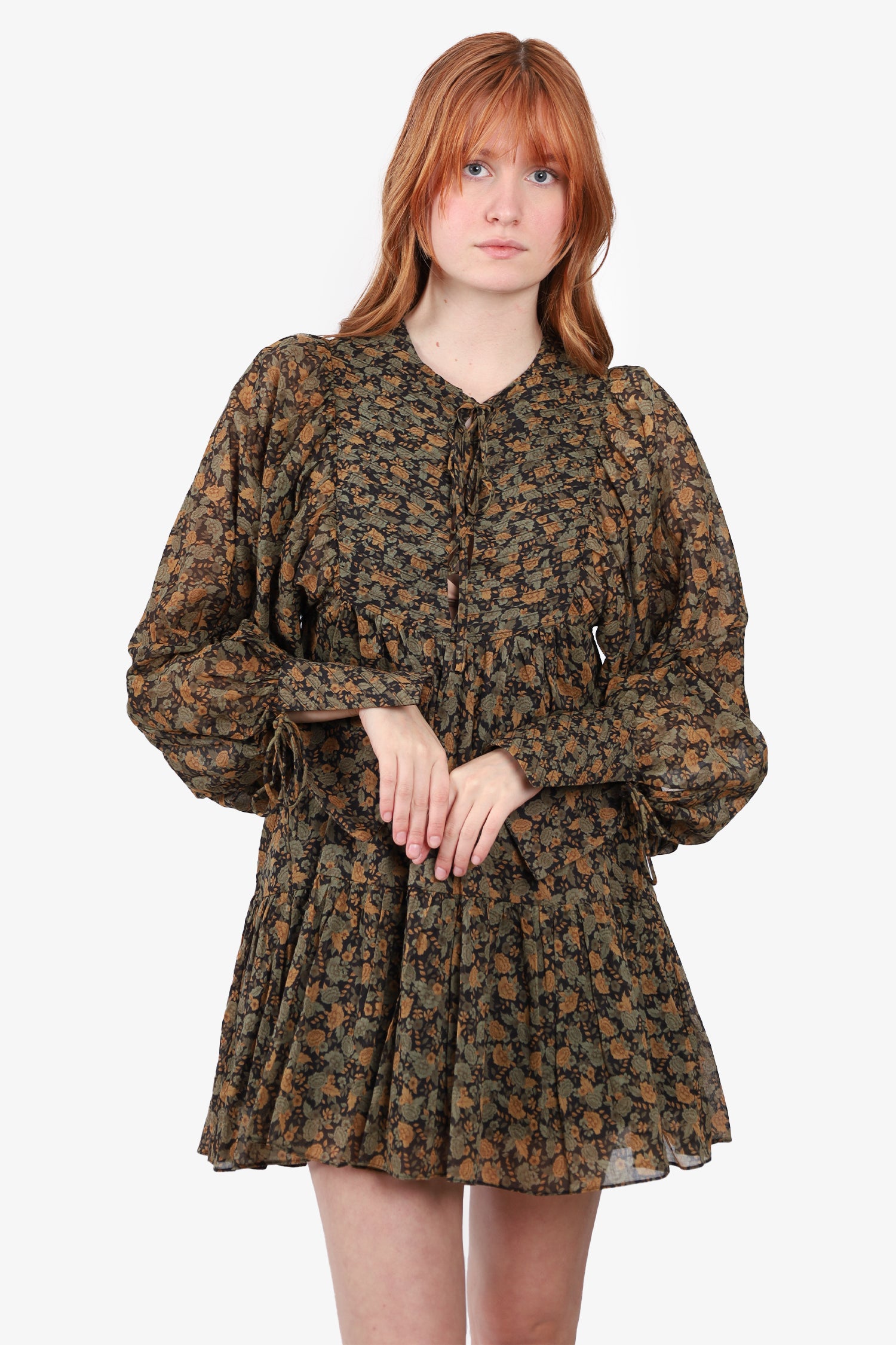 Refresh availabilityShona Joy Green/Black Floral Long-Sleeve Tiered Mini Dress. Round neck. Tie front closure. Pull-on. Tonal stitching.