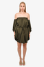 Shona Joy Olive Green Off-The-Shoulder Dress. Elasticized neck, cuffs and waist. Tonal stitching.