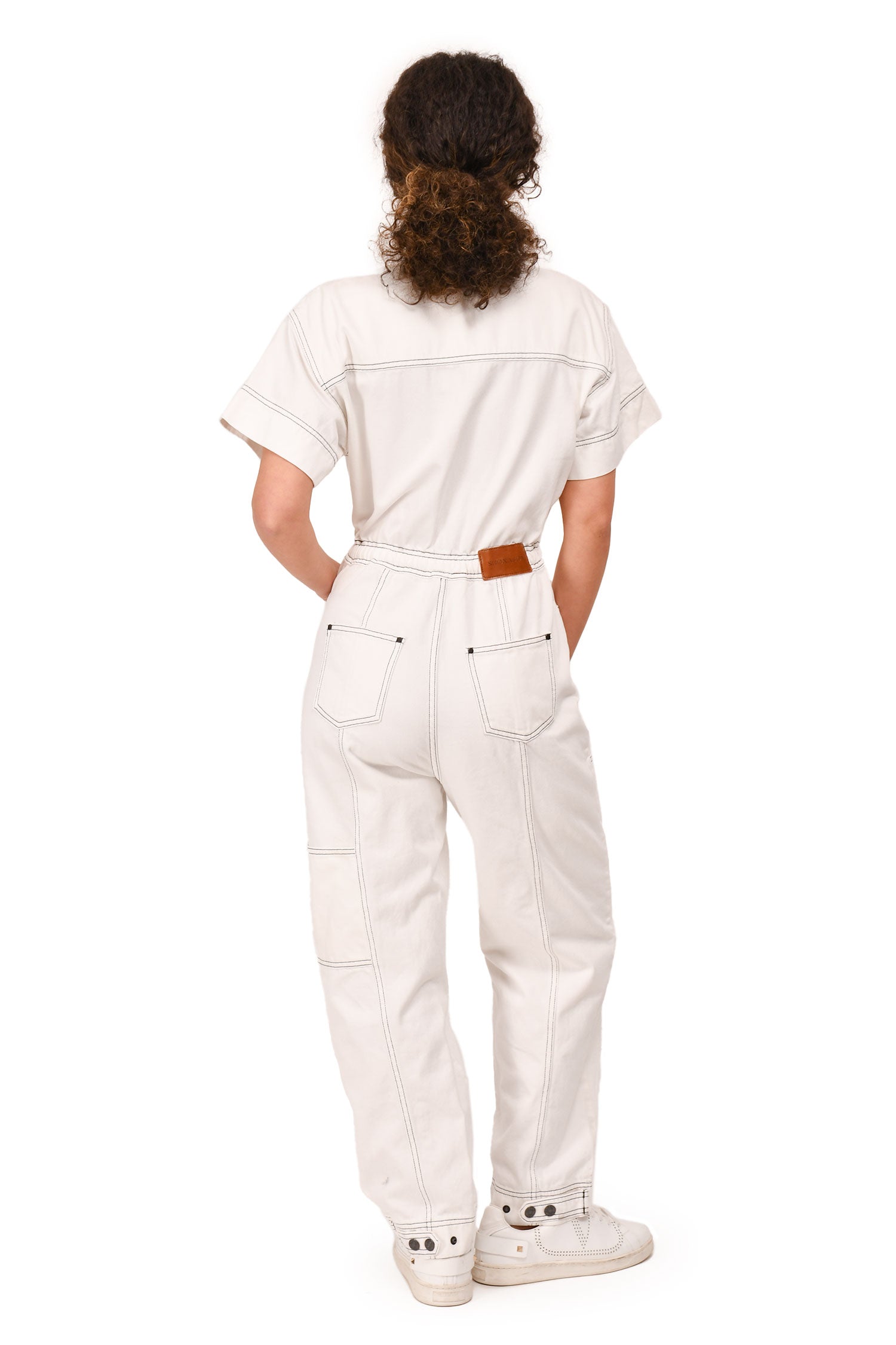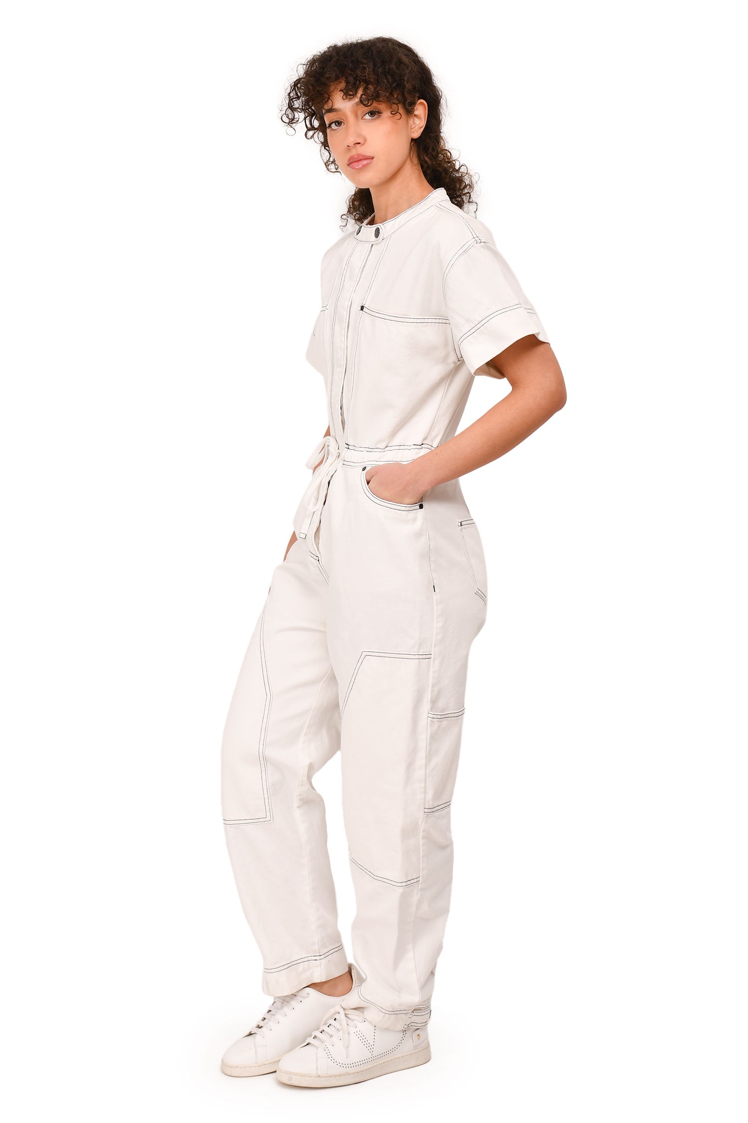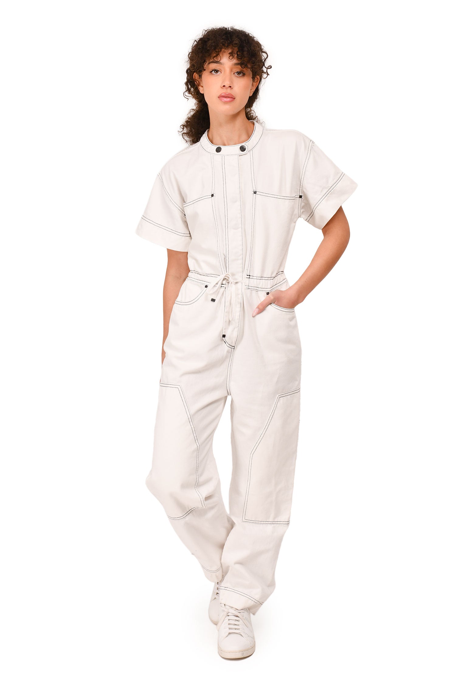 Refresh availabilityShona Joy White Contrast Stitch Denim Jumpsuit. Front snap placket. Side seam pockets. 2 rear pockets. 2 collar snaps. Contrast stitching.