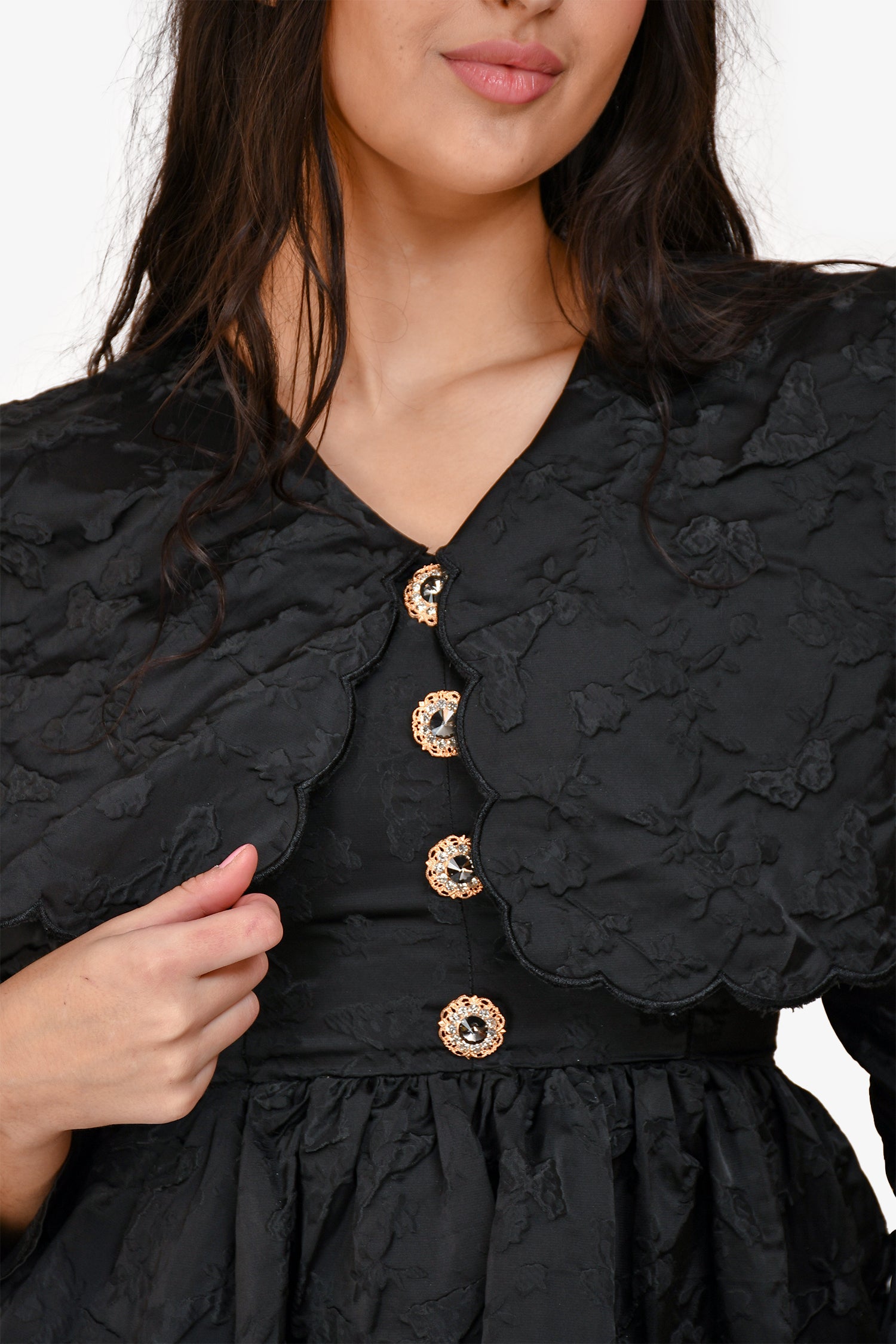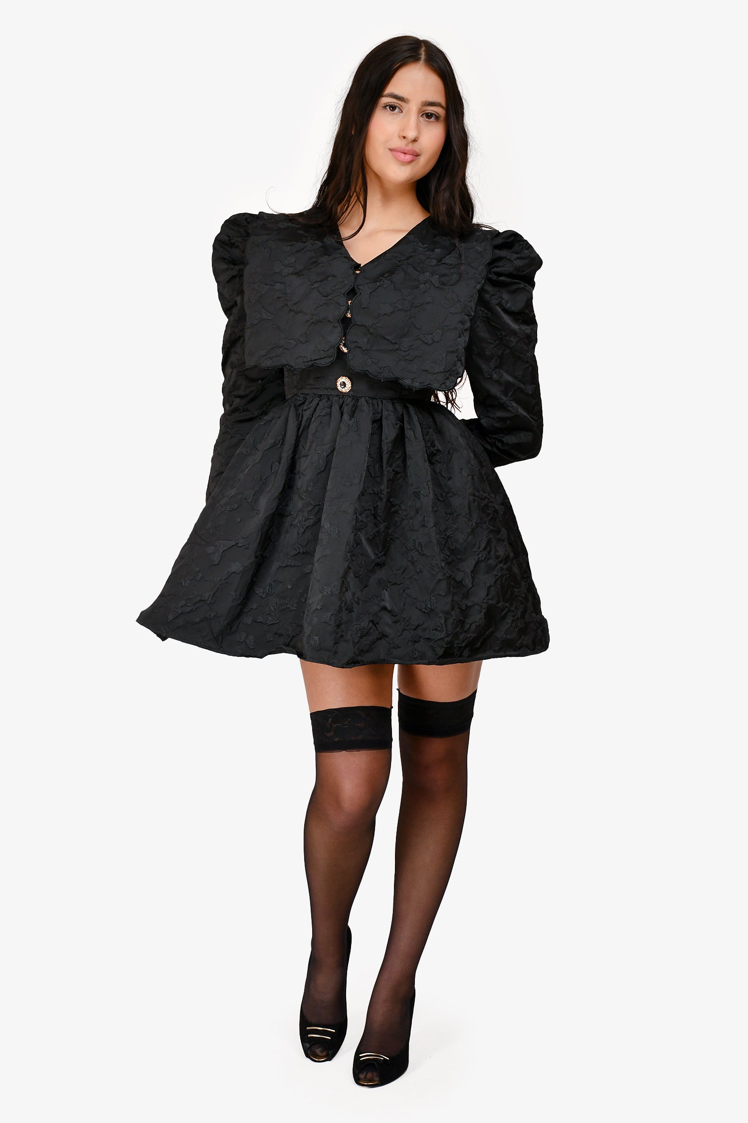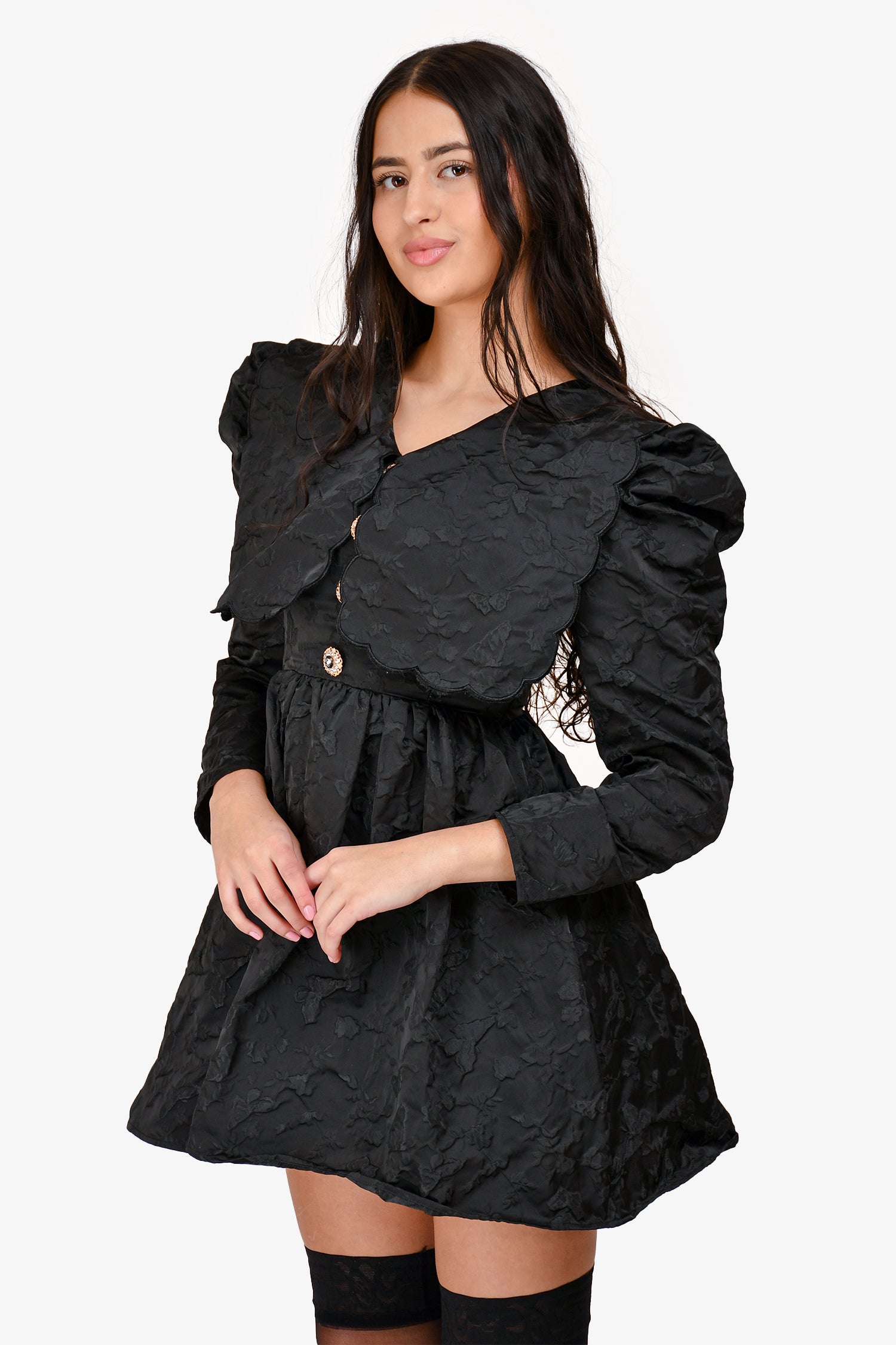 Refresh availabilitySister Jane Black Peter Pan Front Mini Dress. Side zipper closure. Side pockets. Front decorative buttons. Gold-tone hardware. Balloon sleeves. Tonal stitching.