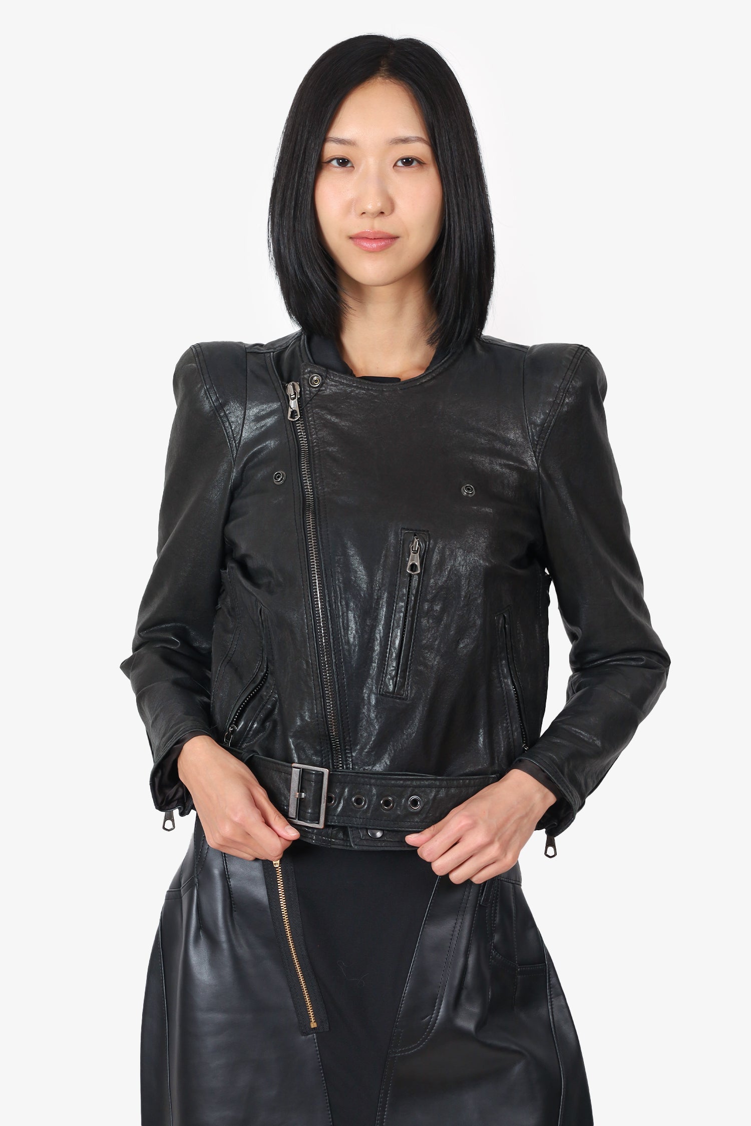Refresh availabilitySmythe Black Leather Moto Jacket. Pull-on. Round-neckline. Front zip and button-up closure. Zippers to wrist cuffs. Belt with adjustable pull-through buckle closure. 2 exterior zip pockets; 1 at breast, and 2 at side. Lined interior. Shoulder pads. Gunmetal-tone hardware. Tonal stitching.