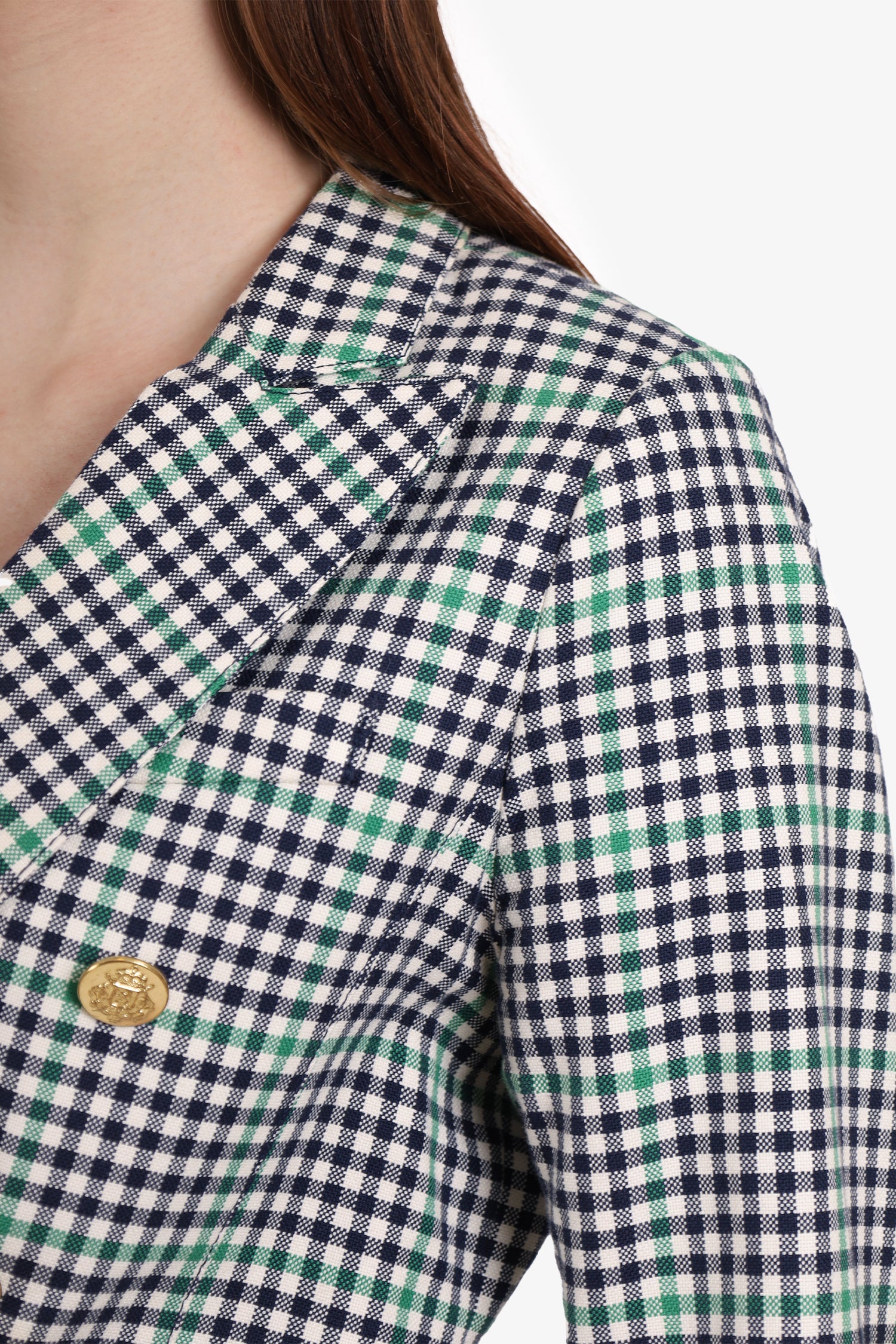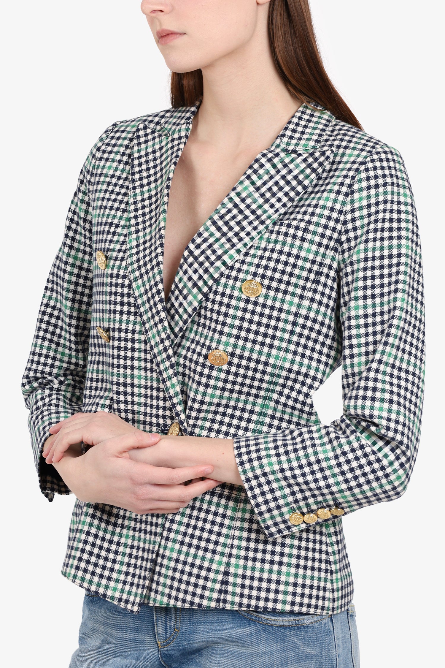 Refresh availabilitySmythe Green/Black/White Cotton Plaid Print Blazer. Front button-up closure. Gold hardware. Lined. Tonal. stitching.
