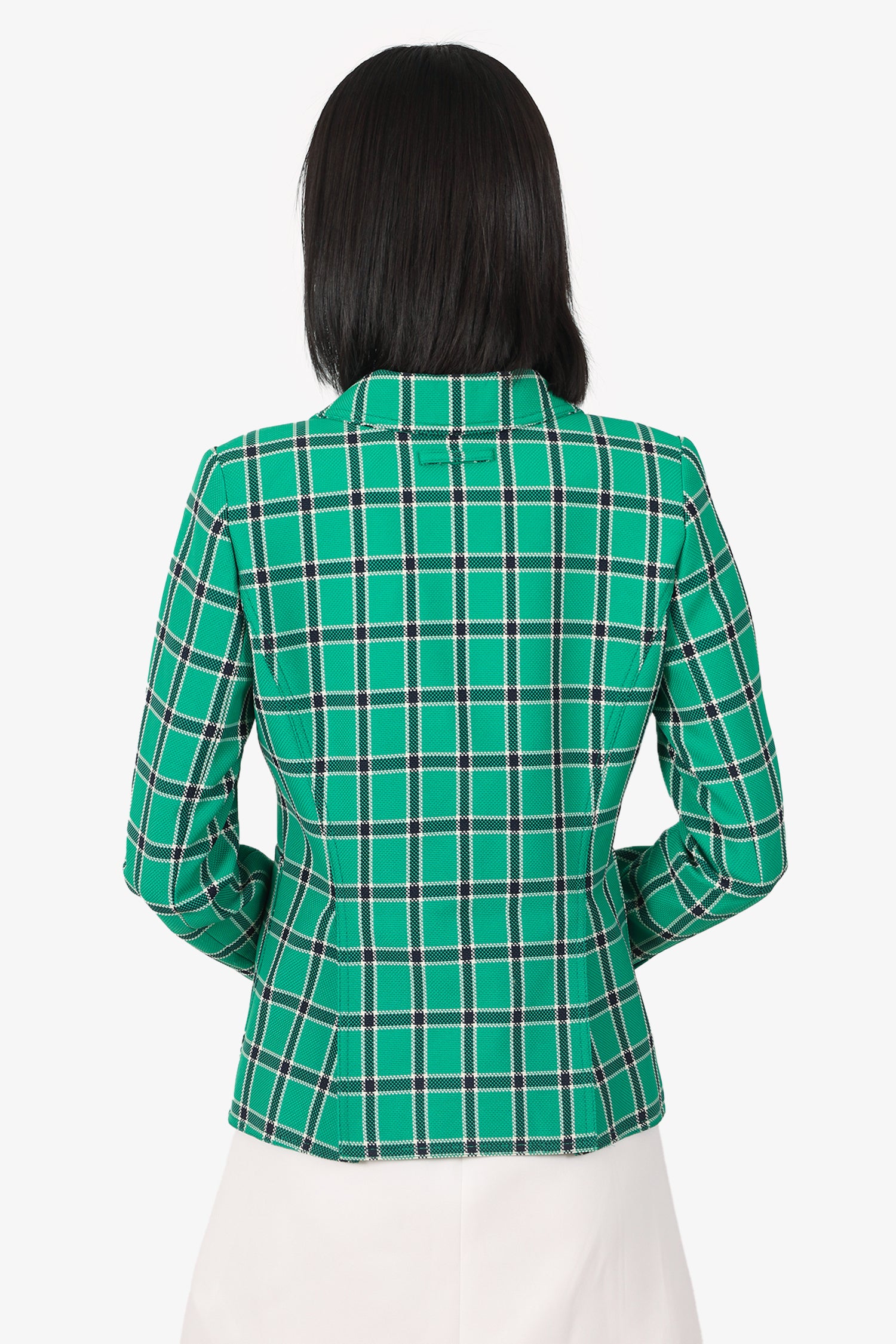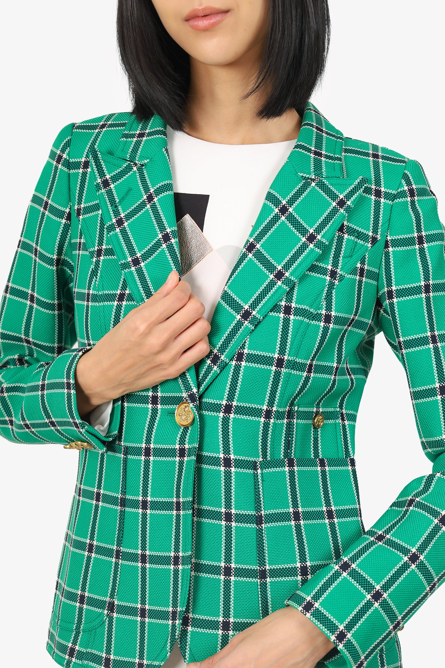 Refresh availabilitySmythe Green/Black Plaid Blazer. Pull-on. Peak lapels. Front button-up closure. Padded shoulders. Sleeve cuffs with button-up closure. 3 exterior pockets; 1 mini button-up, and 2 side slip. Double rear vent. Lined interior. Gold-tone hardware. Tonal stitching.