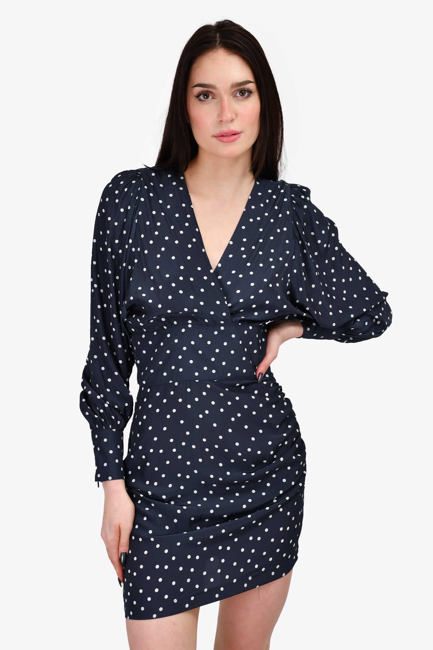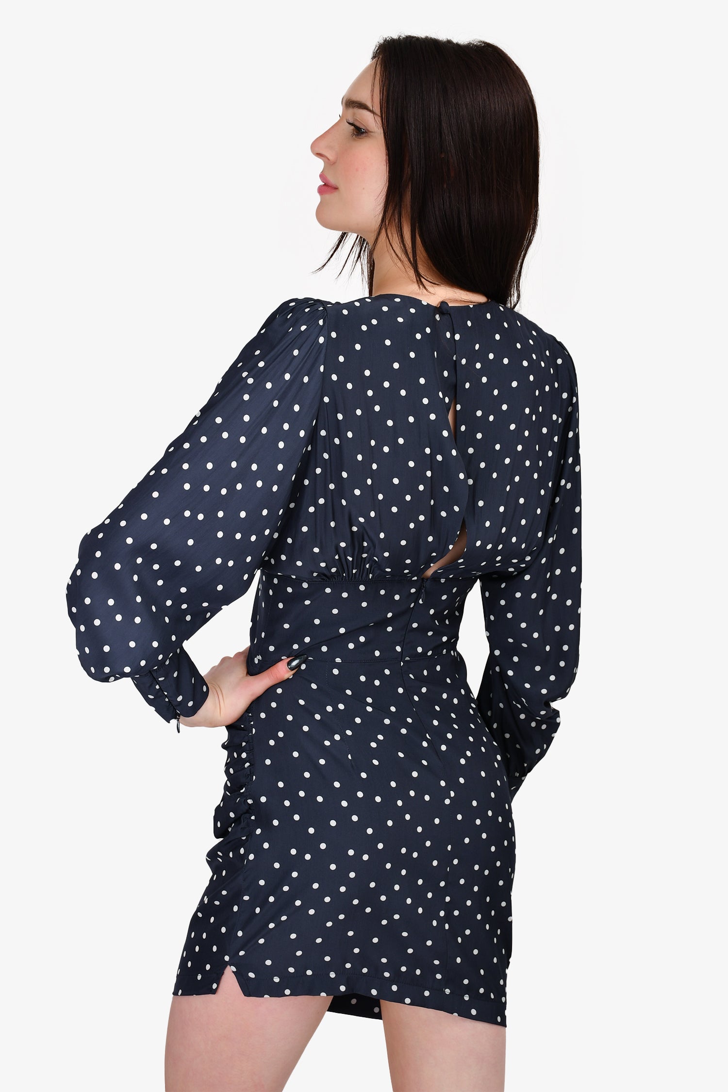 Refresh availabilitySmythe Navy Polka Dot Draped Mini Dress. V-neckline. Shoulder pads. Asymmetrical open-back with button closure. Hidden back zipper closure. French cuffs with button closure. Ruching on the left side. Quarter sleeves. Tonal stitching.