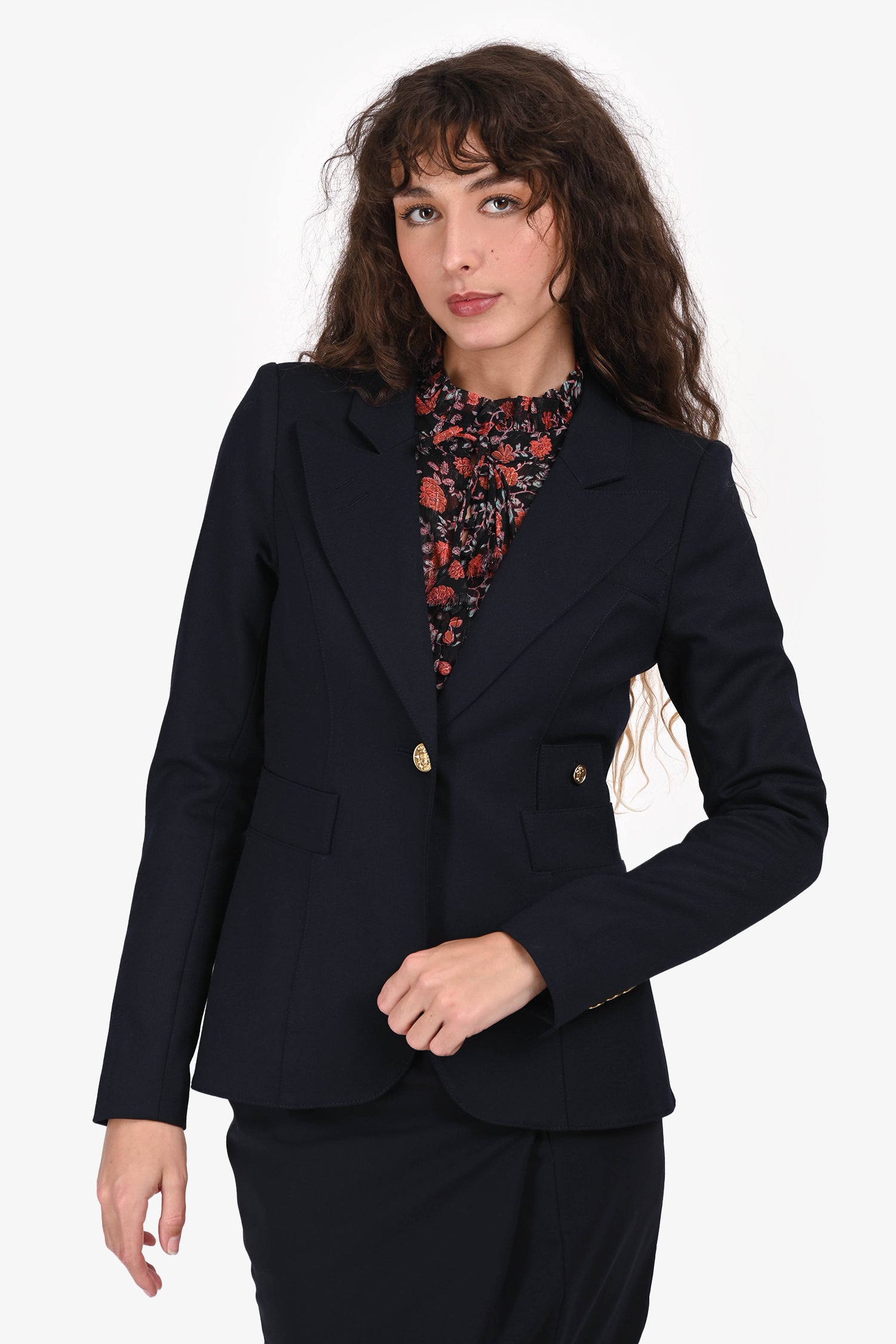 Refresh availabilitySmythe Navy Single Breasted Blazer. Slip-on. Notched lapel. Single front button closure. Padded shoulders. 3 exterior pockets; 2 slip, 1 with button closure. Sleeve cuffs with button closures. Gold-tone hardware. Tonal stitching.