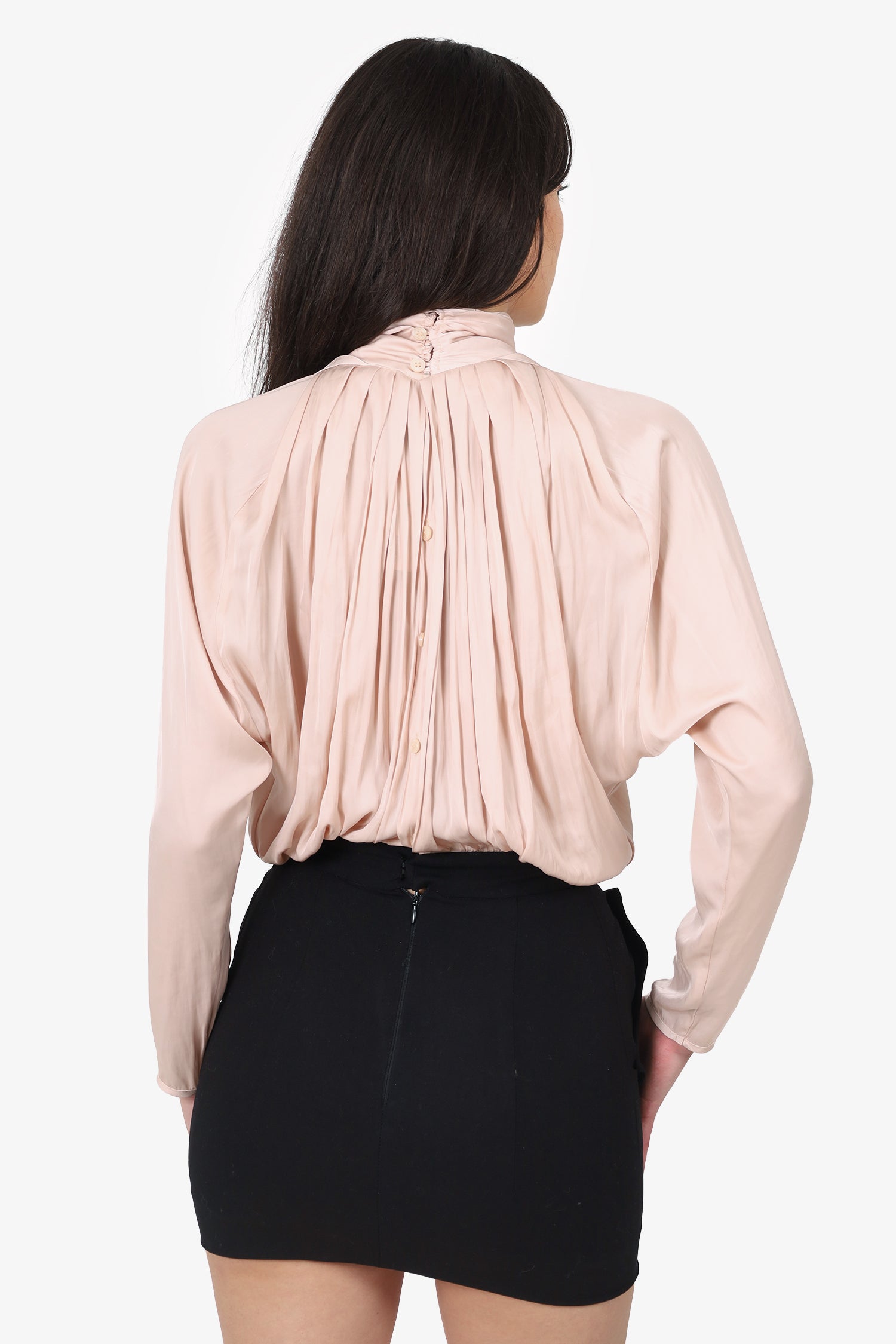 Refresh availabilitySmythe Pale Pink/Black Satin Long Sleeve Mock Neck Mini Dress. Slip–on. Mock neckline. Rear top button-up closure. Bottom rear skirt zip closure with clasp. Side slip pockets with fold-over front detail. Tonal stitching.