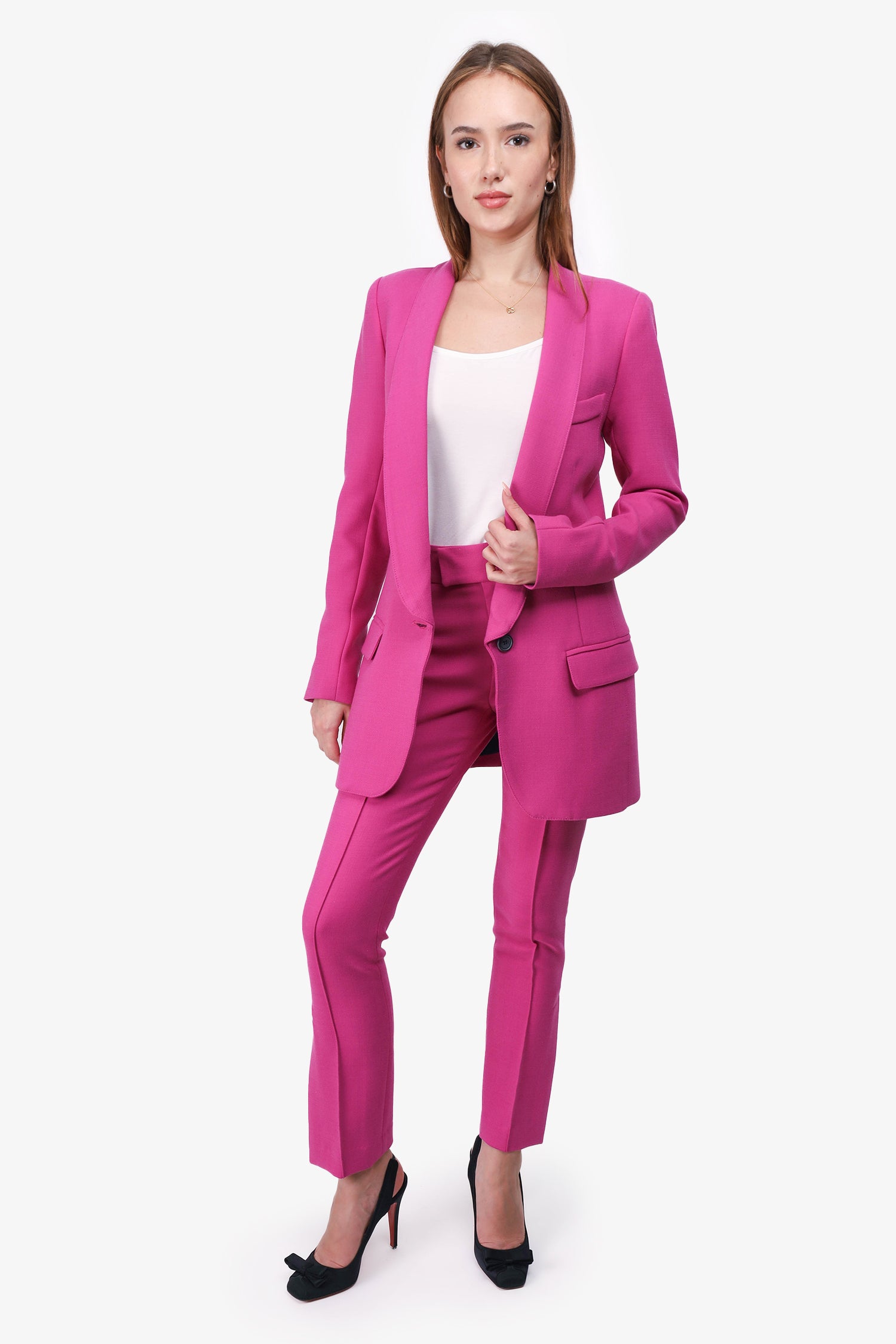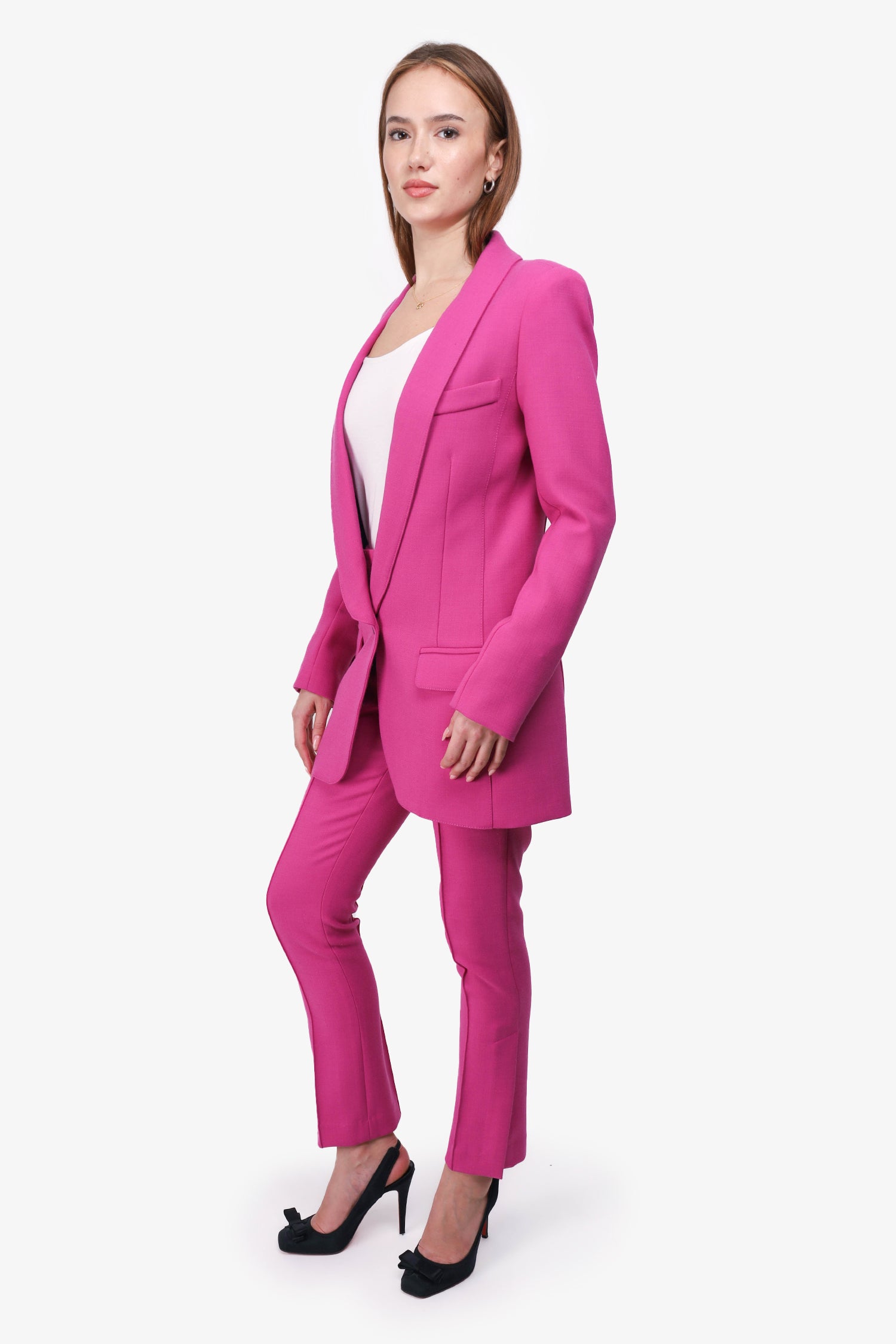 Refresh availabilitySmythe Pink Long Blazer and Pant Set. Blazer; Shawl lapel. Internal shoulder pads. Single front button closure. Front pockets. Lined. Tonal stitching. Pants; Front zip and hook closure. Split hems. Unlined. Tonal stitching.