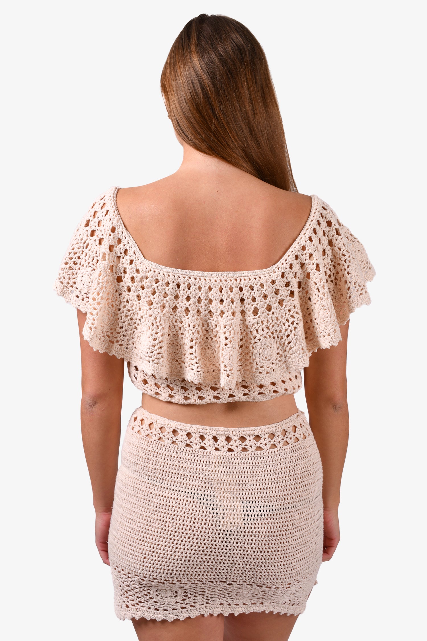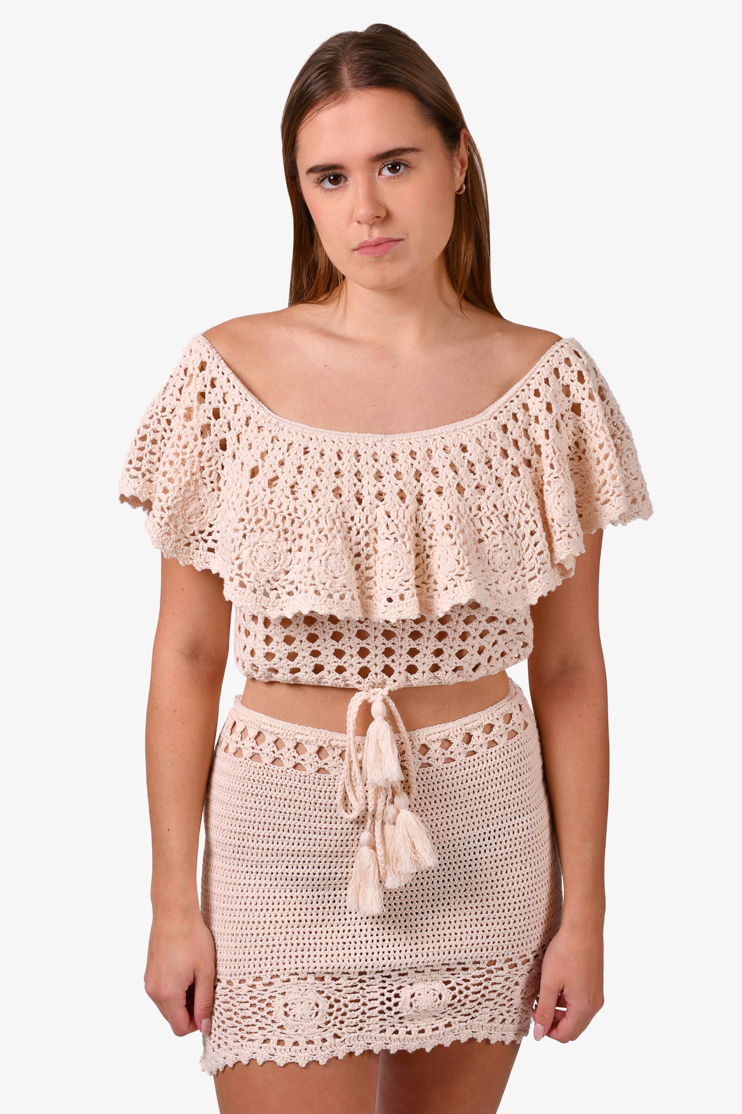 Refresh availabilitySpell Cream Crochet Ruffle Front Tie Top + Matching Mini Skirt. Top: Off-the-shoulder design. Elasticized trims. Drawstring adjustable hem. Skirt: Drawstring adjustable waist band. Tonal stitching.