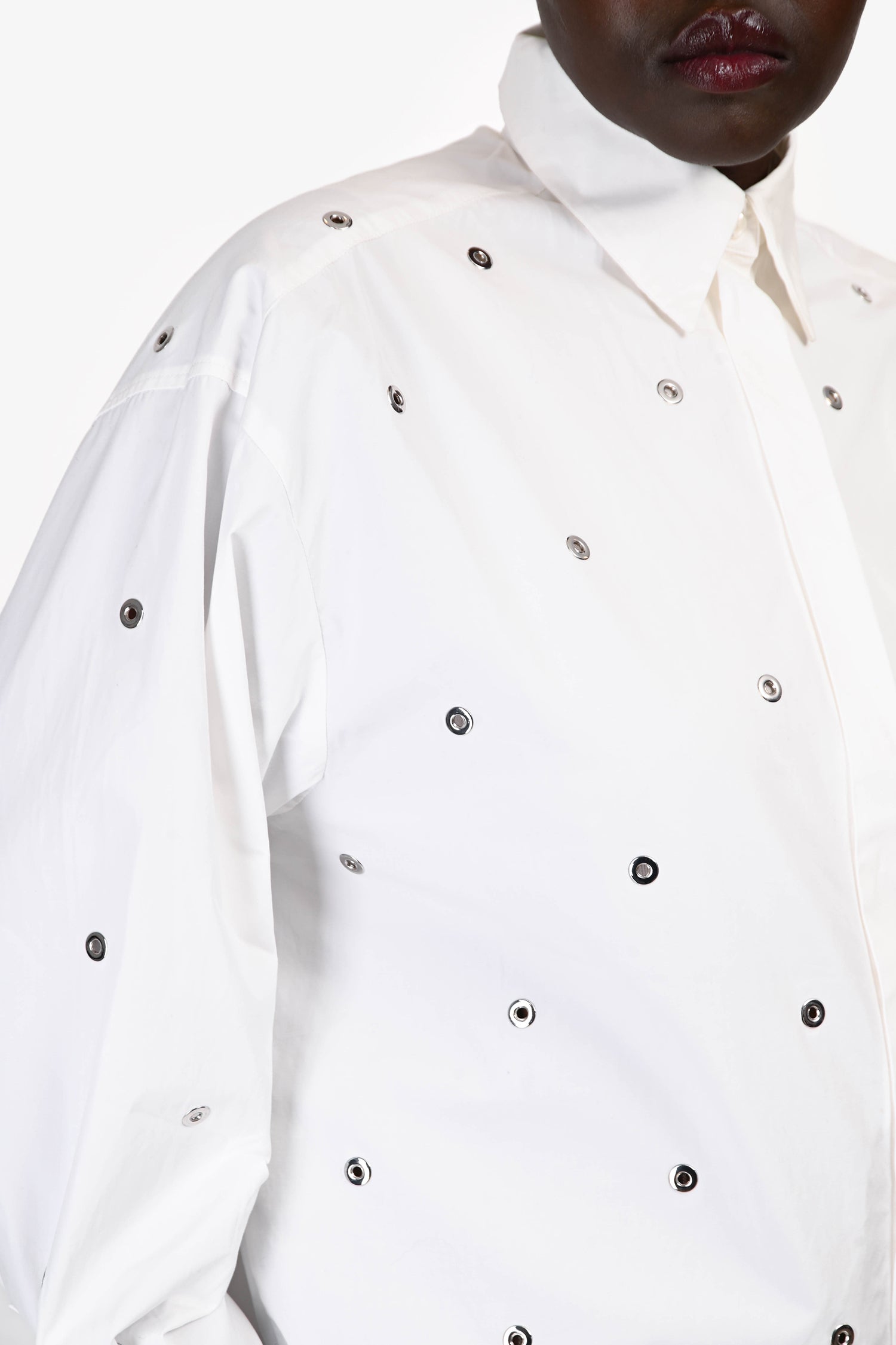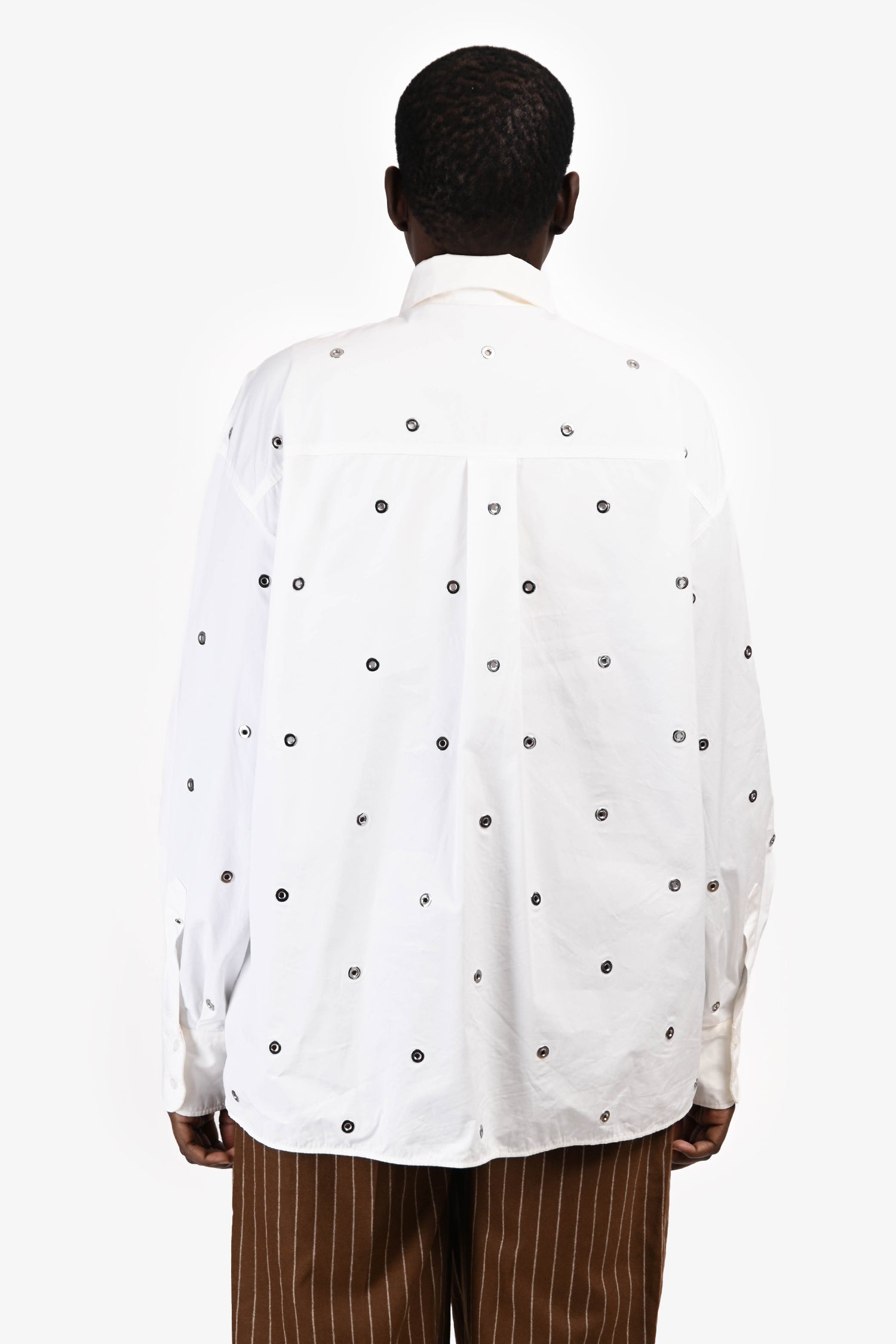 Refresh availabilitySportmax White Cotton Grommet Button Down Shirt. Slip-on. Pointed collar. Front button-up closure. Cuffs with button-up closures. Silver-tone hardware. Tonal stitching.
