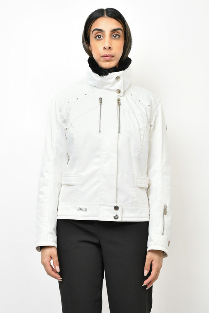 Refresh availabilitySpyder XTL White Thinsulate Faux Fur Collar Ski Jacket. Front zip and velcro closure. Zip pockets throughout. Detachable collar. Lined. Tonal stitching.
