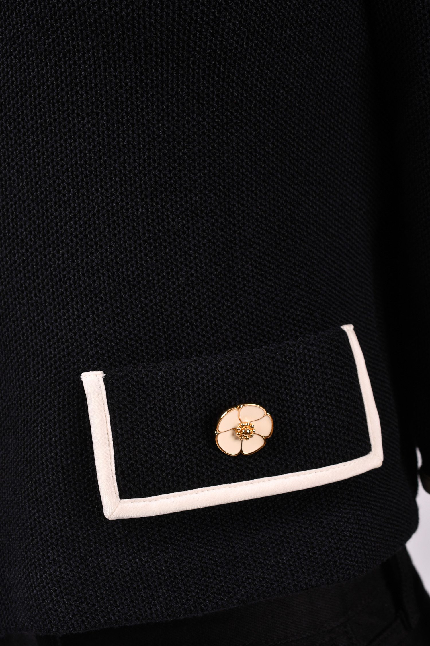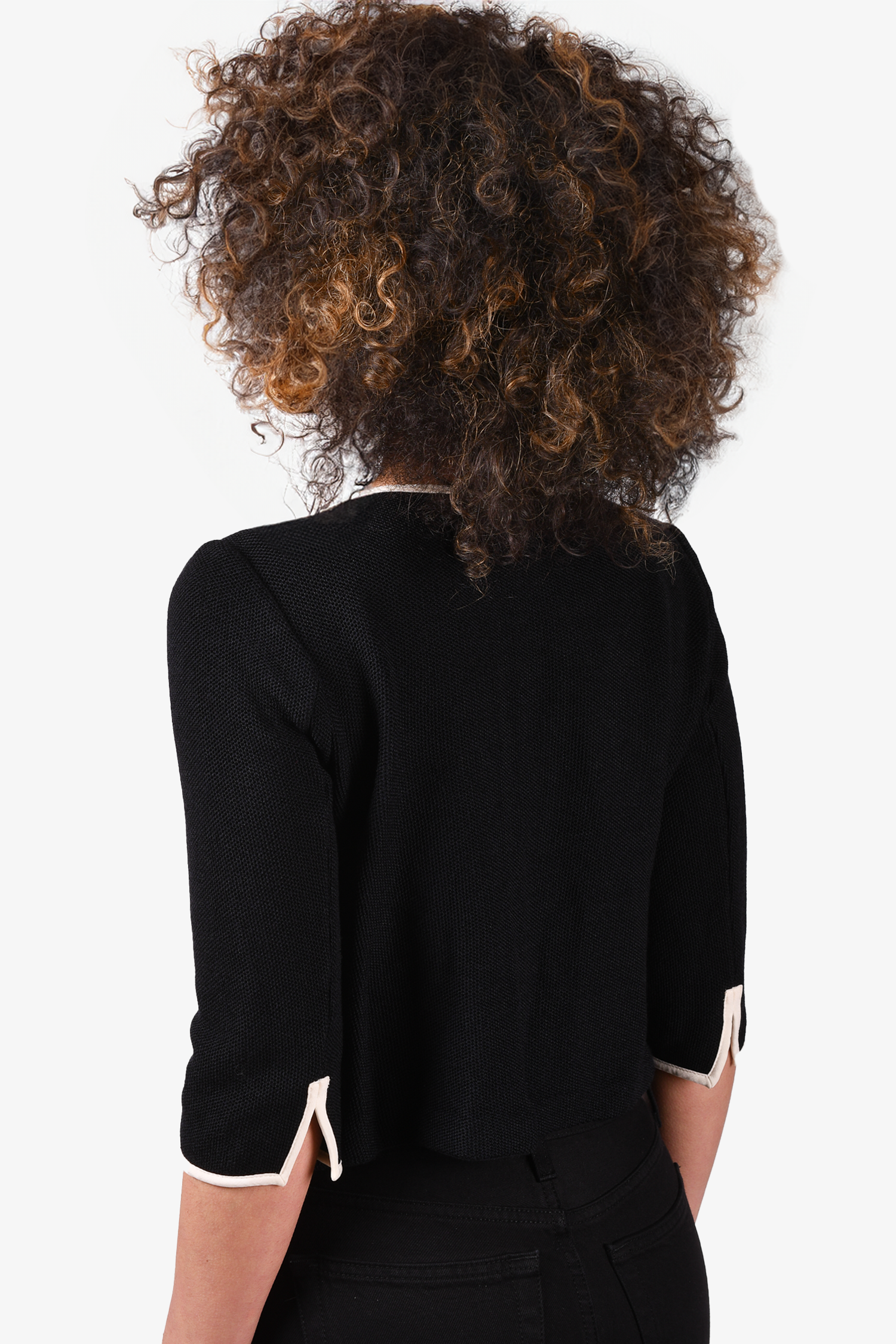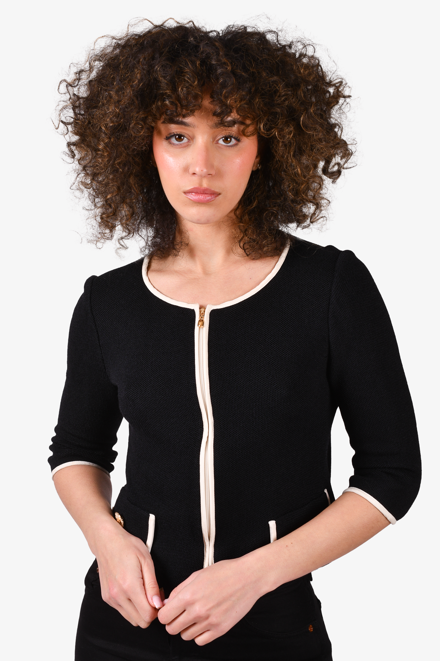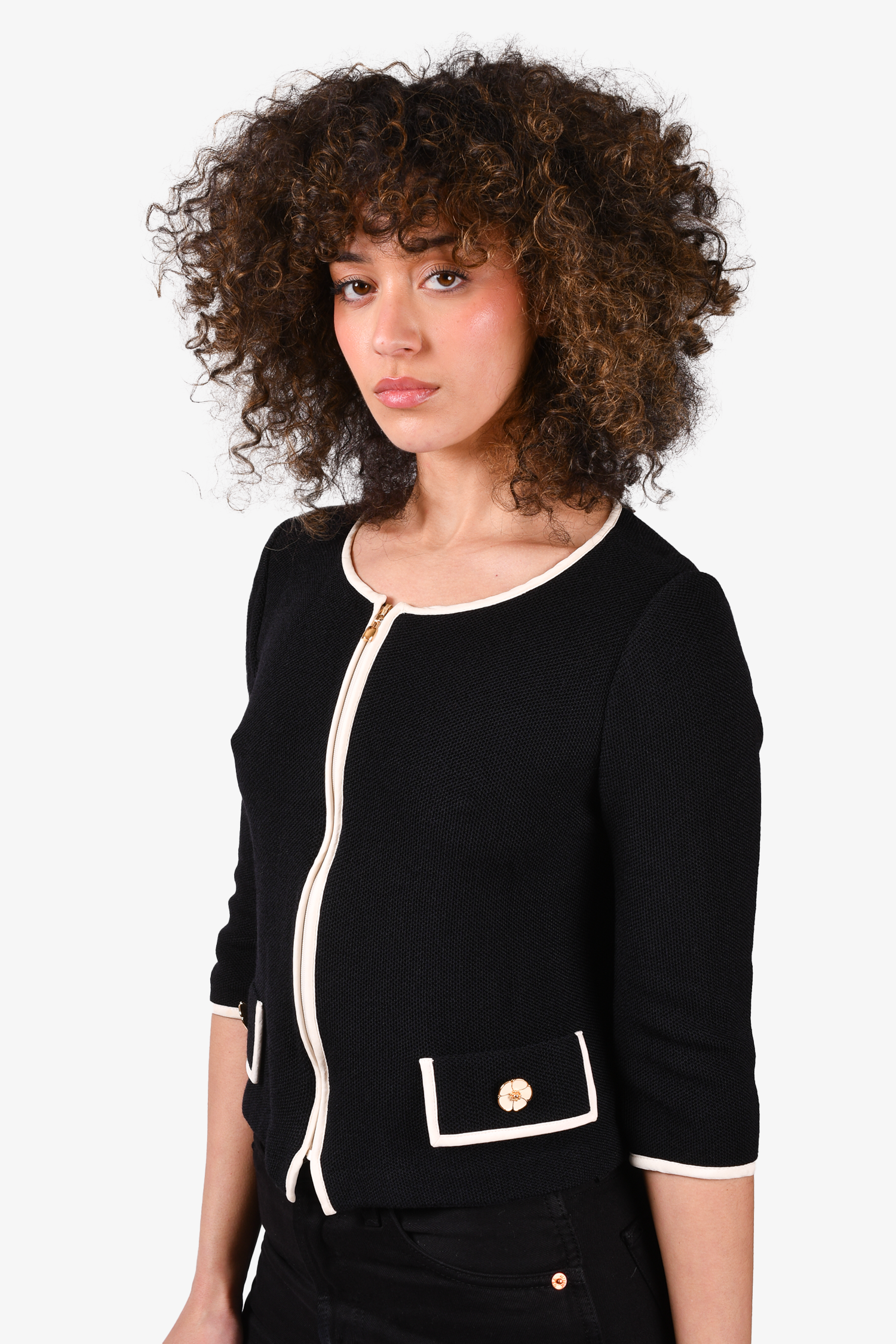 Refresh availabilitySt. John Black Cardigan with White Trim. Front zip closure. Faux front pockets. Tonal stitching.