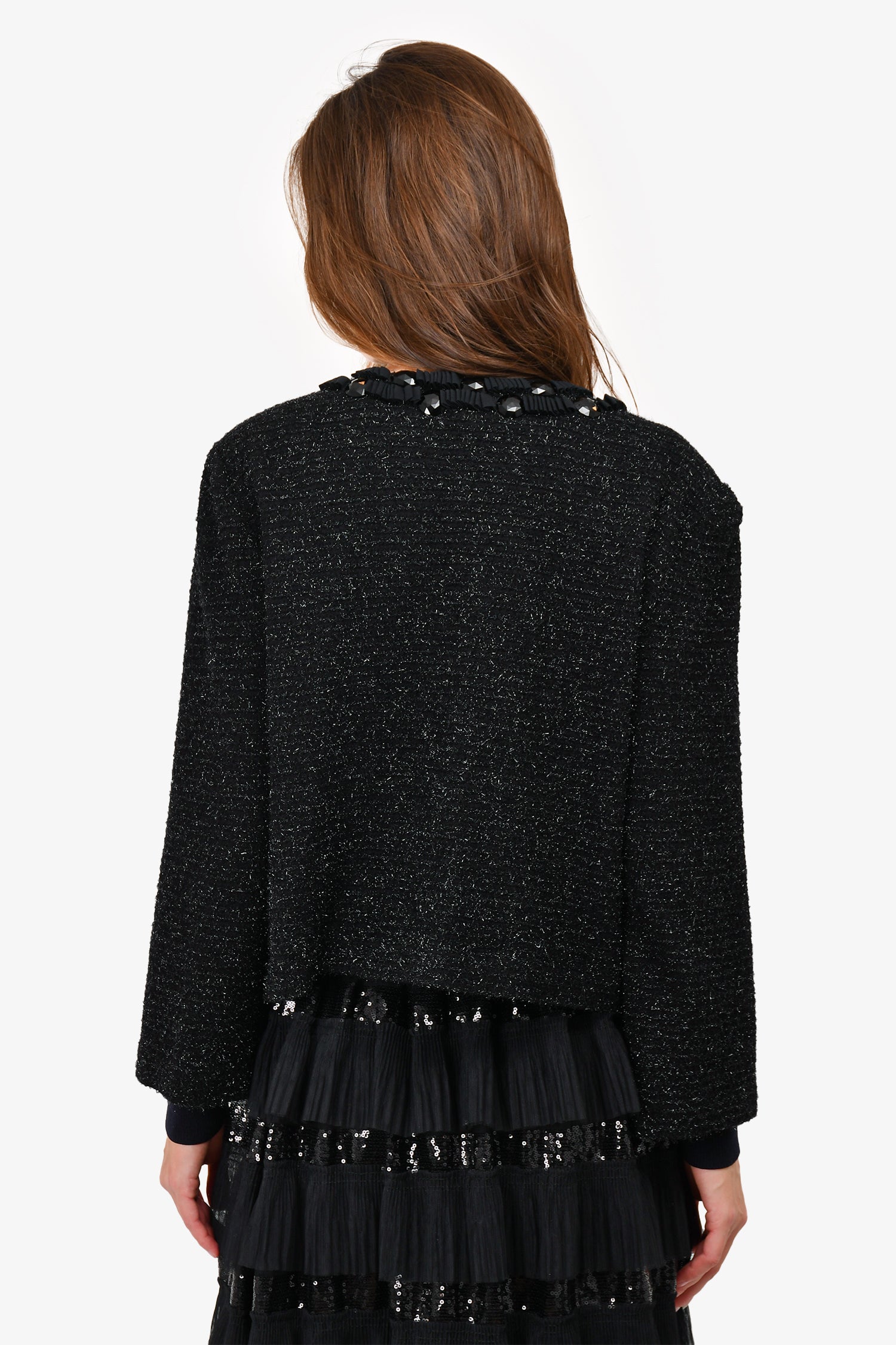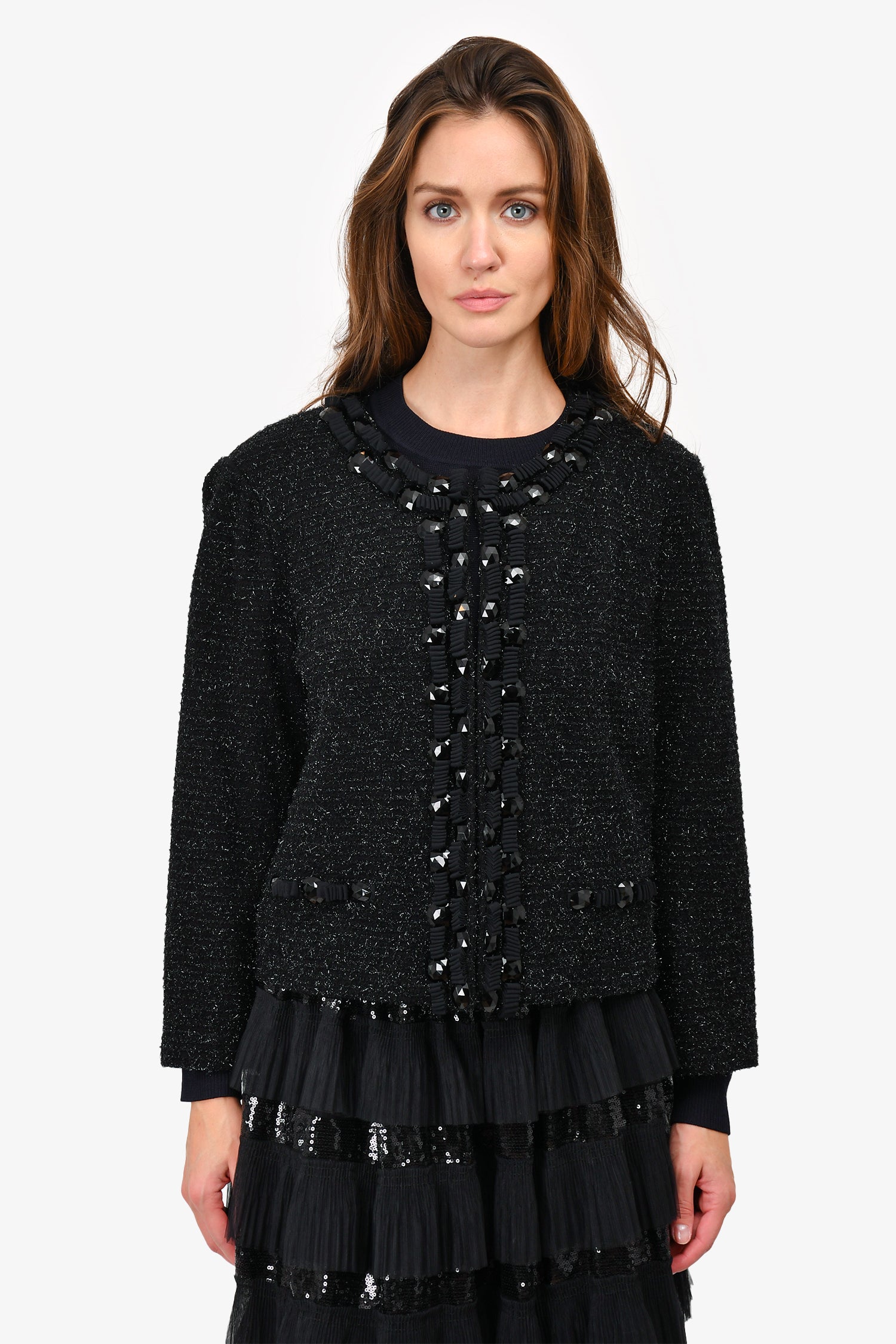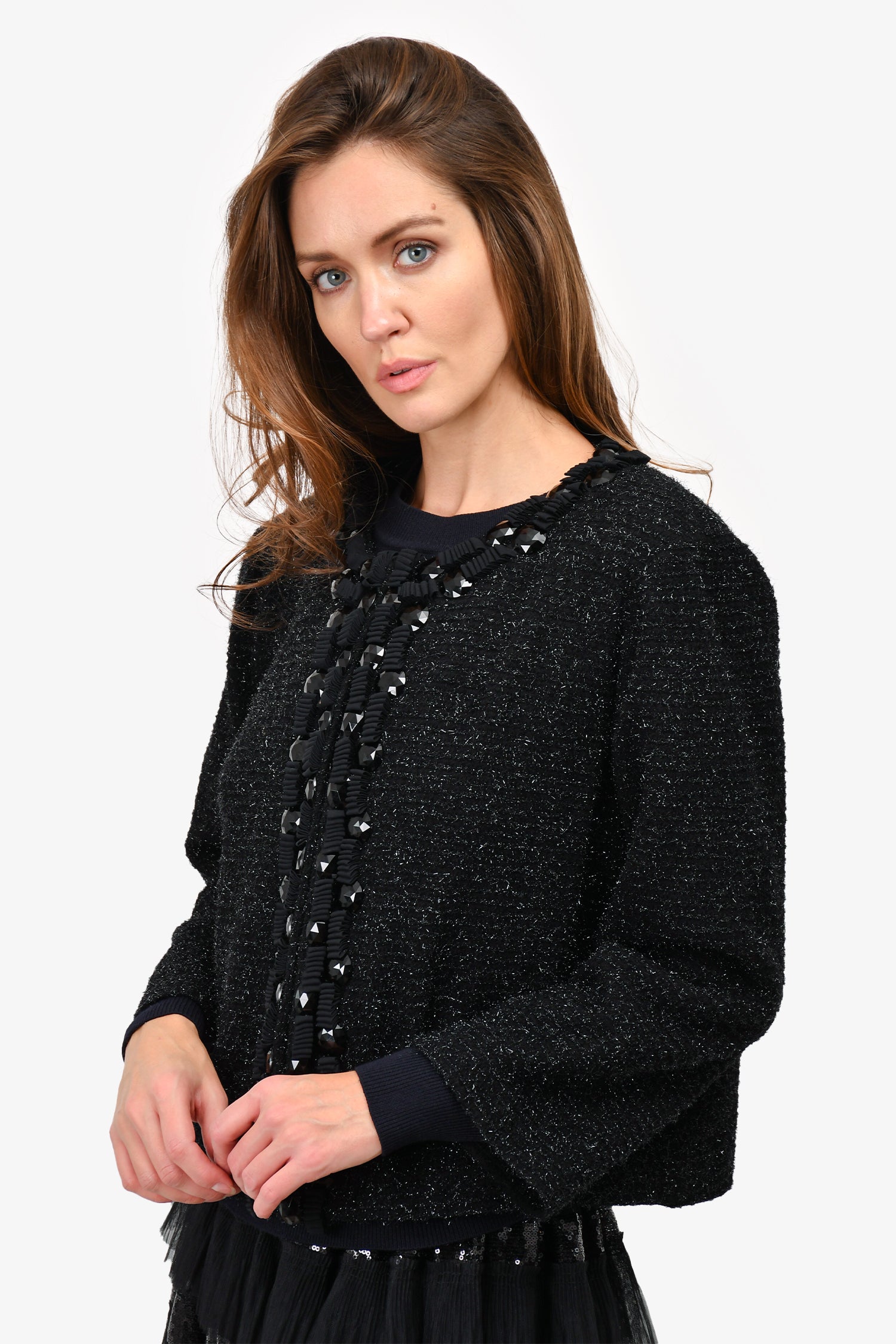 Refresh availabilitySt. John Couture Black Shimmer Knit Evening Jacket. Tonal stitching. Unlined. Silver-foil threading.