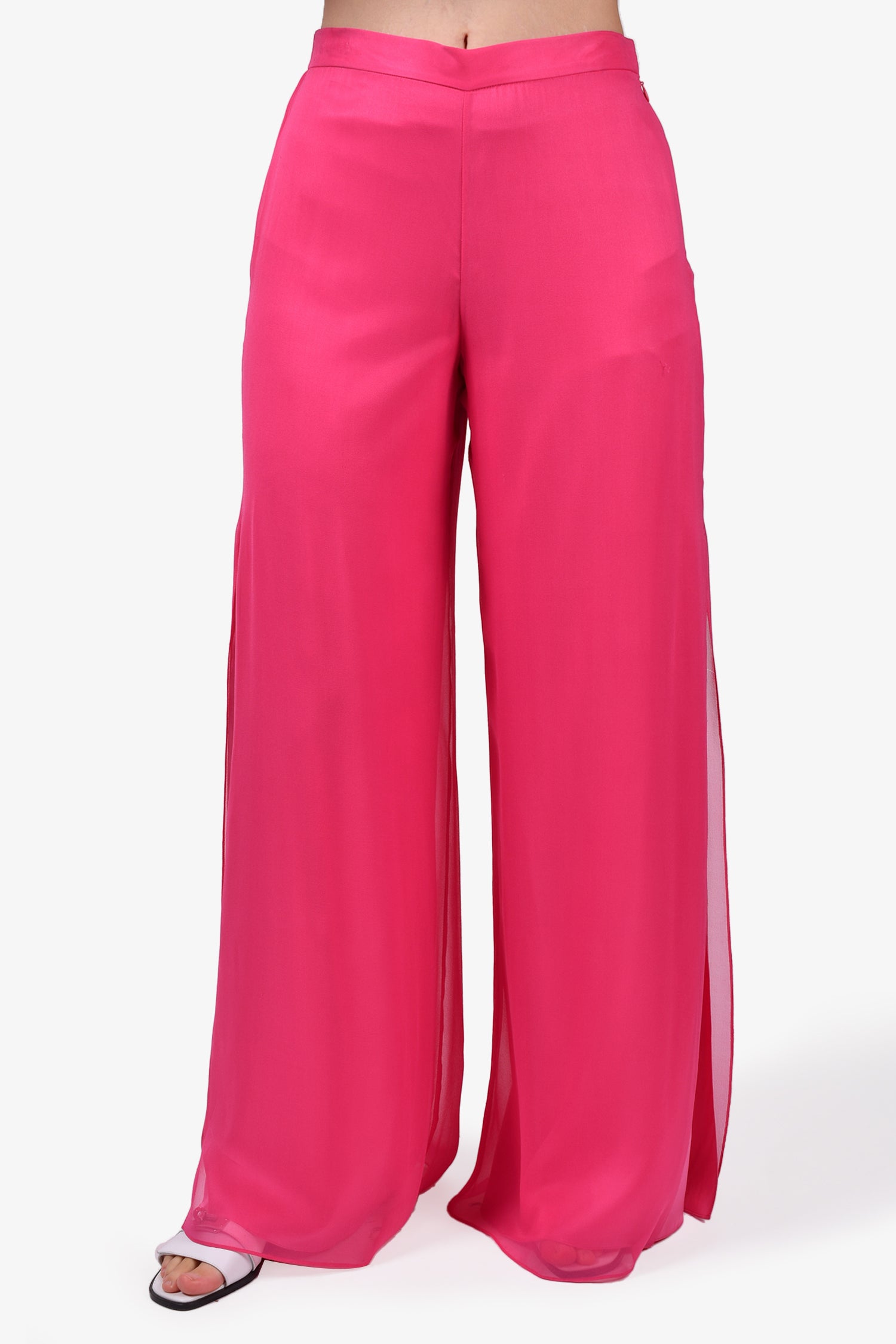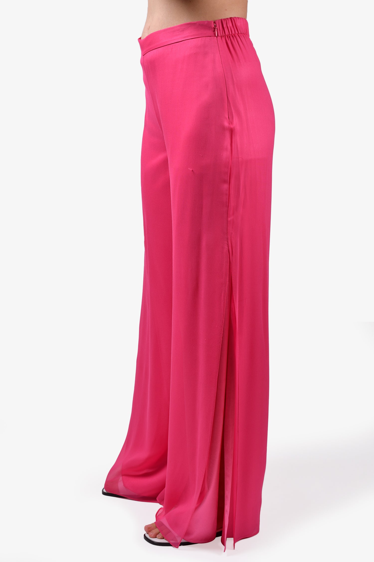 Refresh availabilitySt. John Pink Silk Wide Legged Side Split Trousers. Side zip and hook closure. Elasticized waist. Tonal stitching.