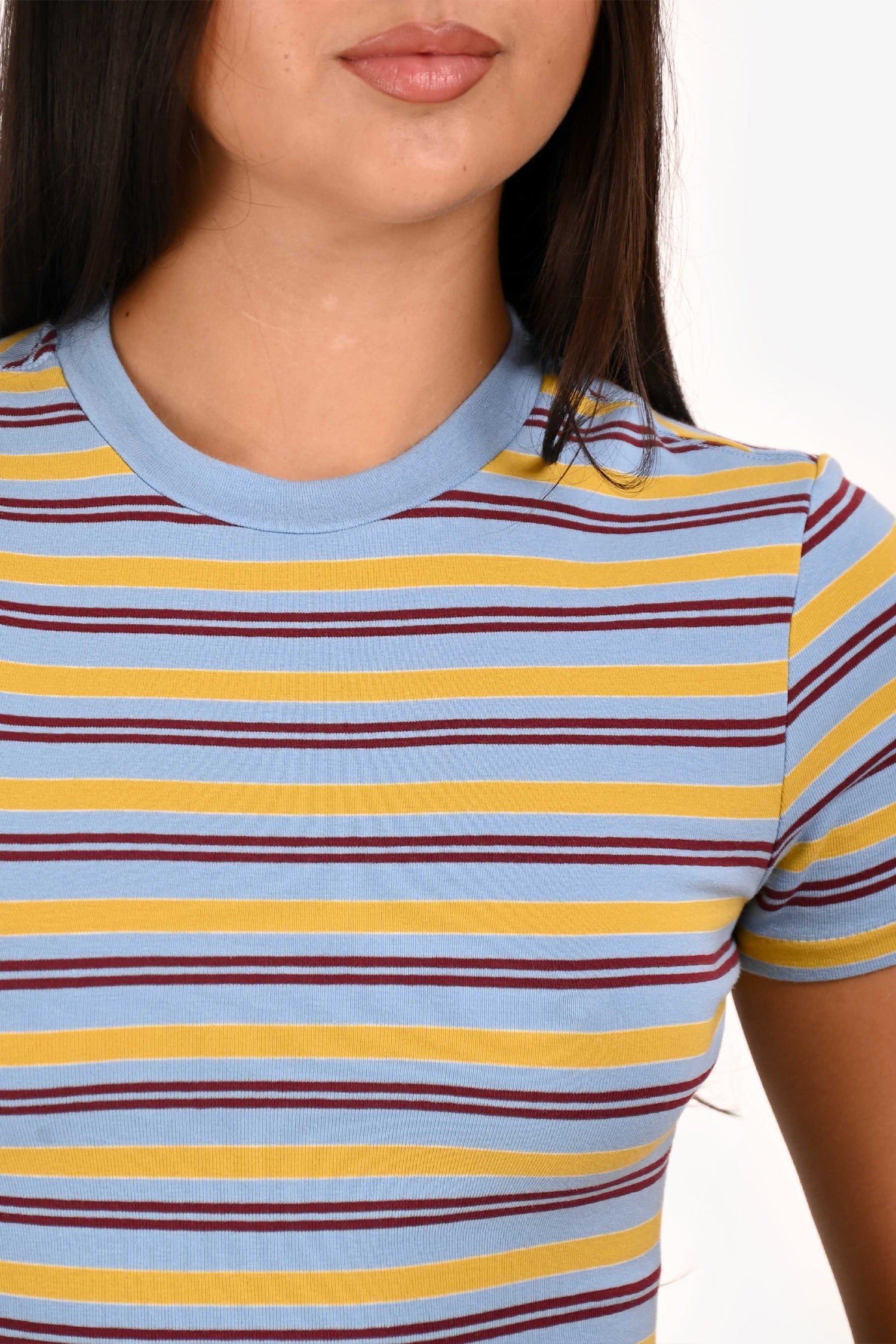 Refresh availabilityStaud Blue/Yellow Striped Short-Sleeved Mini Dress. Round neckline. Centre rear seam. Tonal stitching.