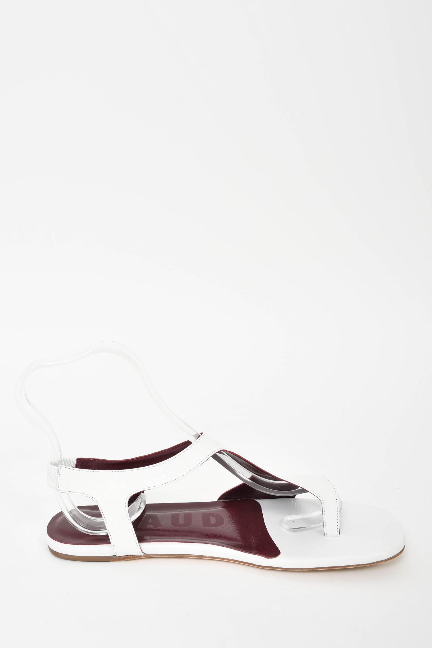 Refresh availabilityStaud White Leather Cutout Flat Sandals. Toe straps. Elastic straps at ankles. Tonal stitching.