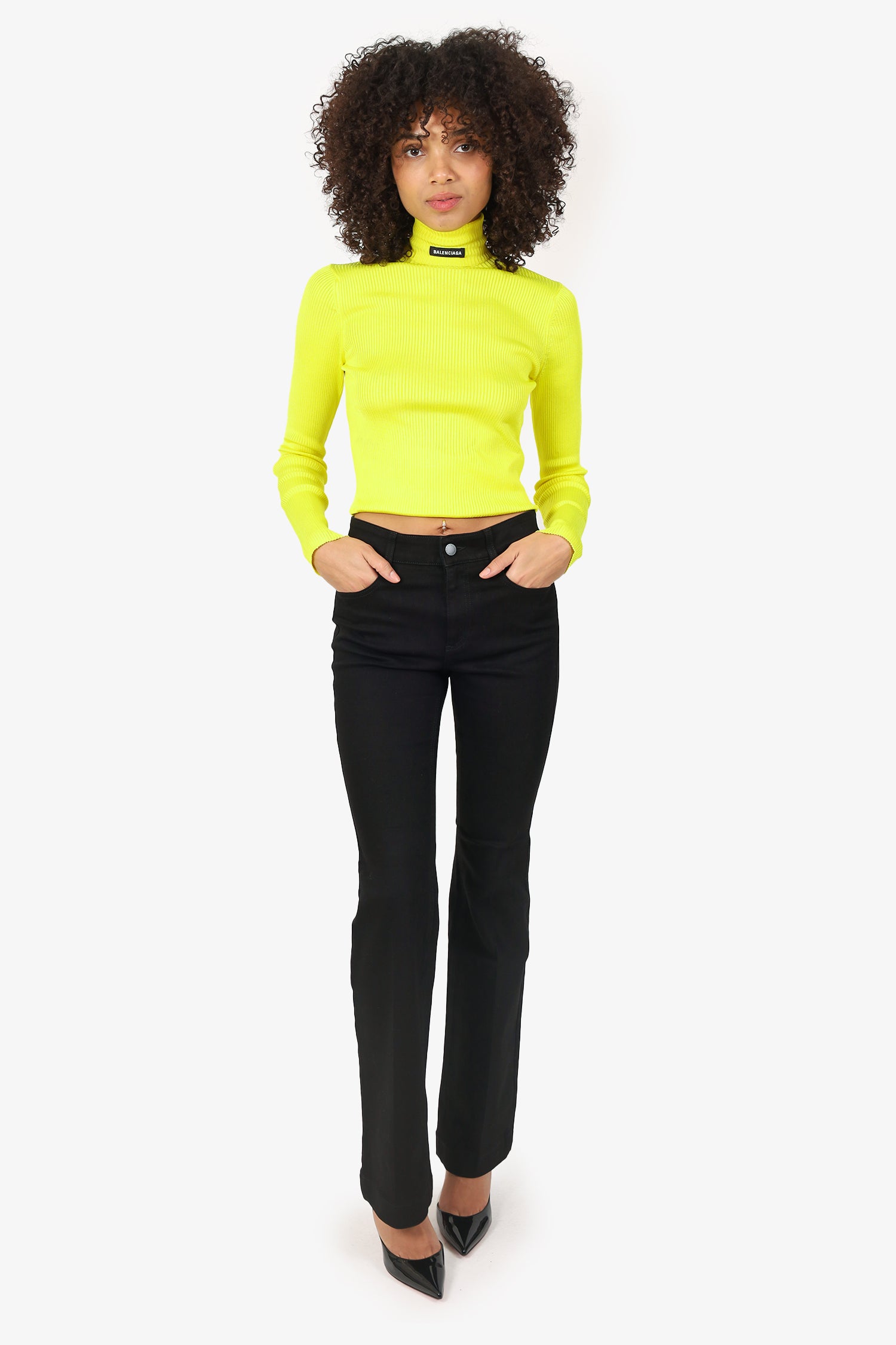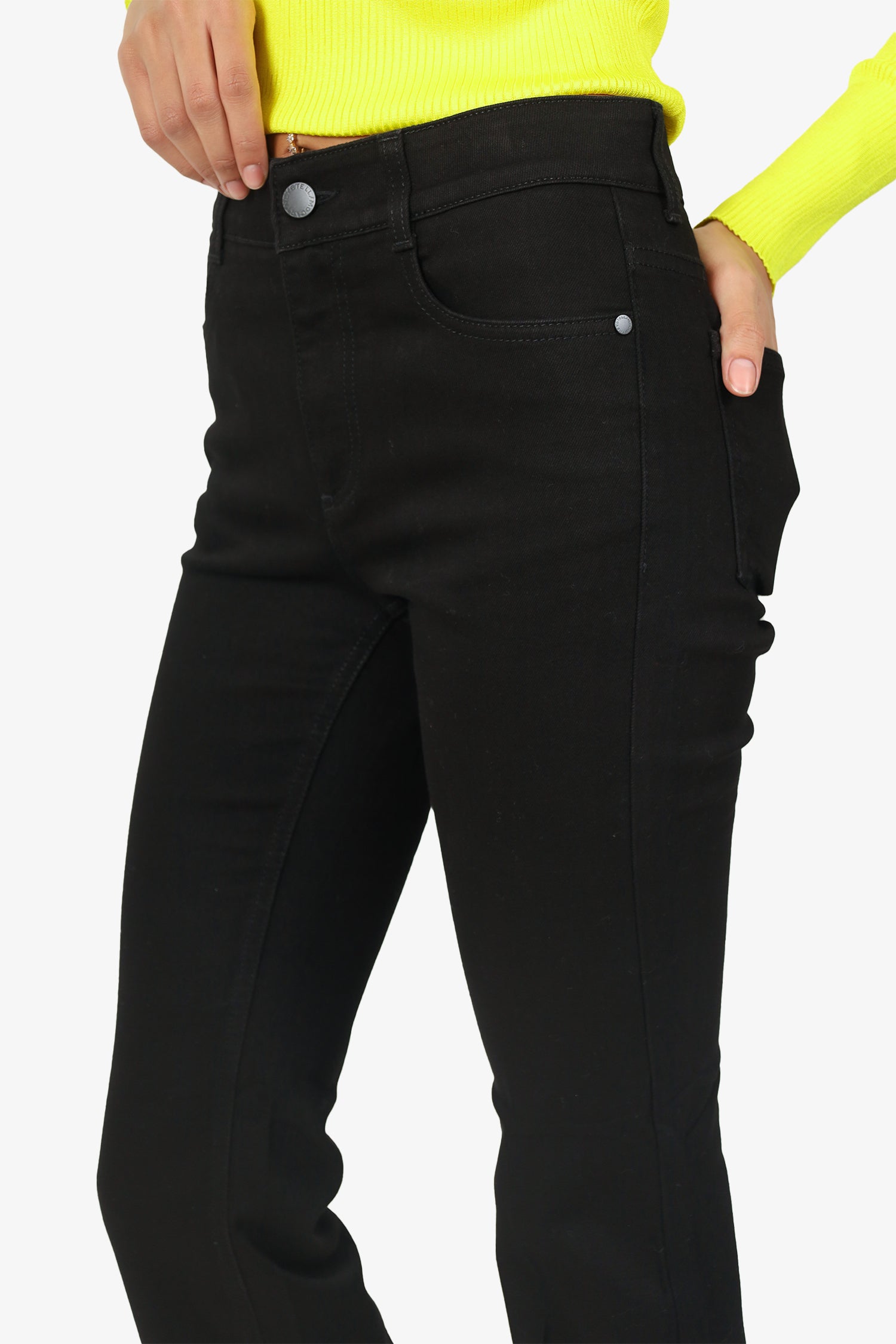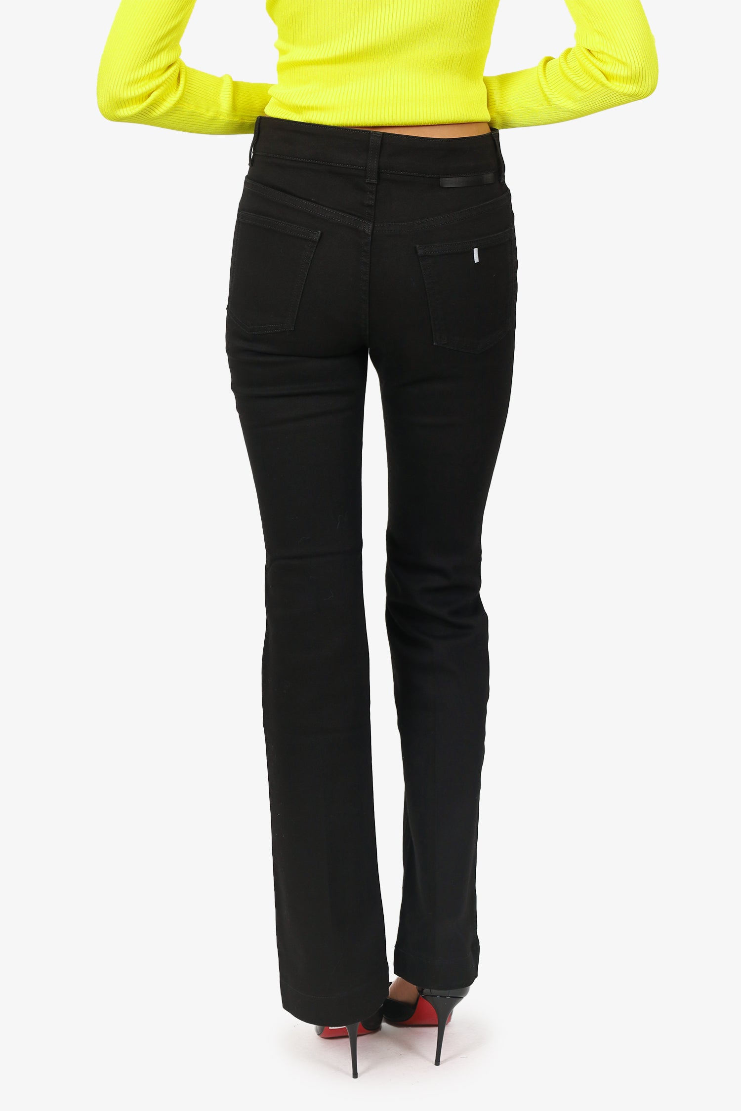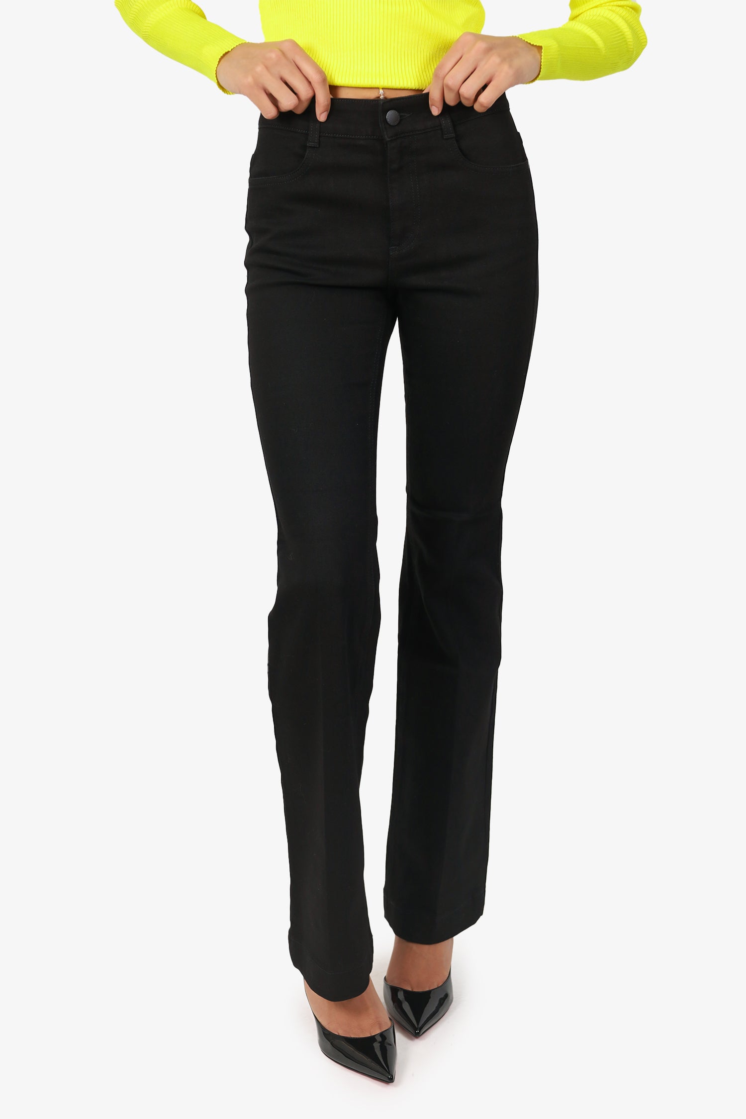 Refresh availabilityStella McCartney Black Denim Flared Jeans. Slip on. Front zip with button-up closure. Waistband belt-loops. 4 exterior slip pockets; 2 front, and 2 rear. Gunmetal-tone hardware. Tonal stitching.