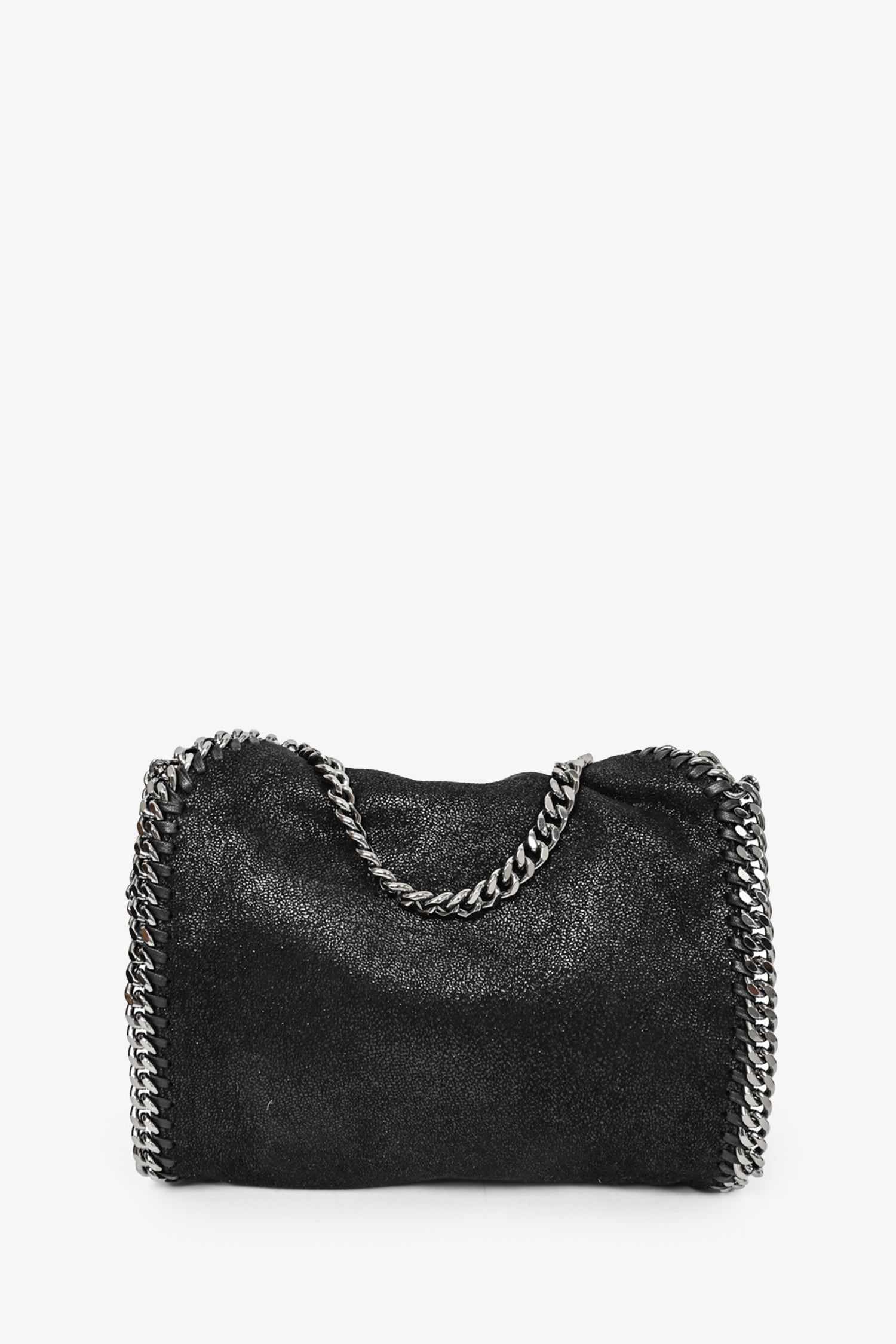 Stella McCartney Black Mini Tote Falabella Crossbody Bag. Top handle and crossbody chain. Interior magnetic button closure. Pink textile interior lining. 1 interior slip pocket. Silver-tone hardware. Tonal stitching.