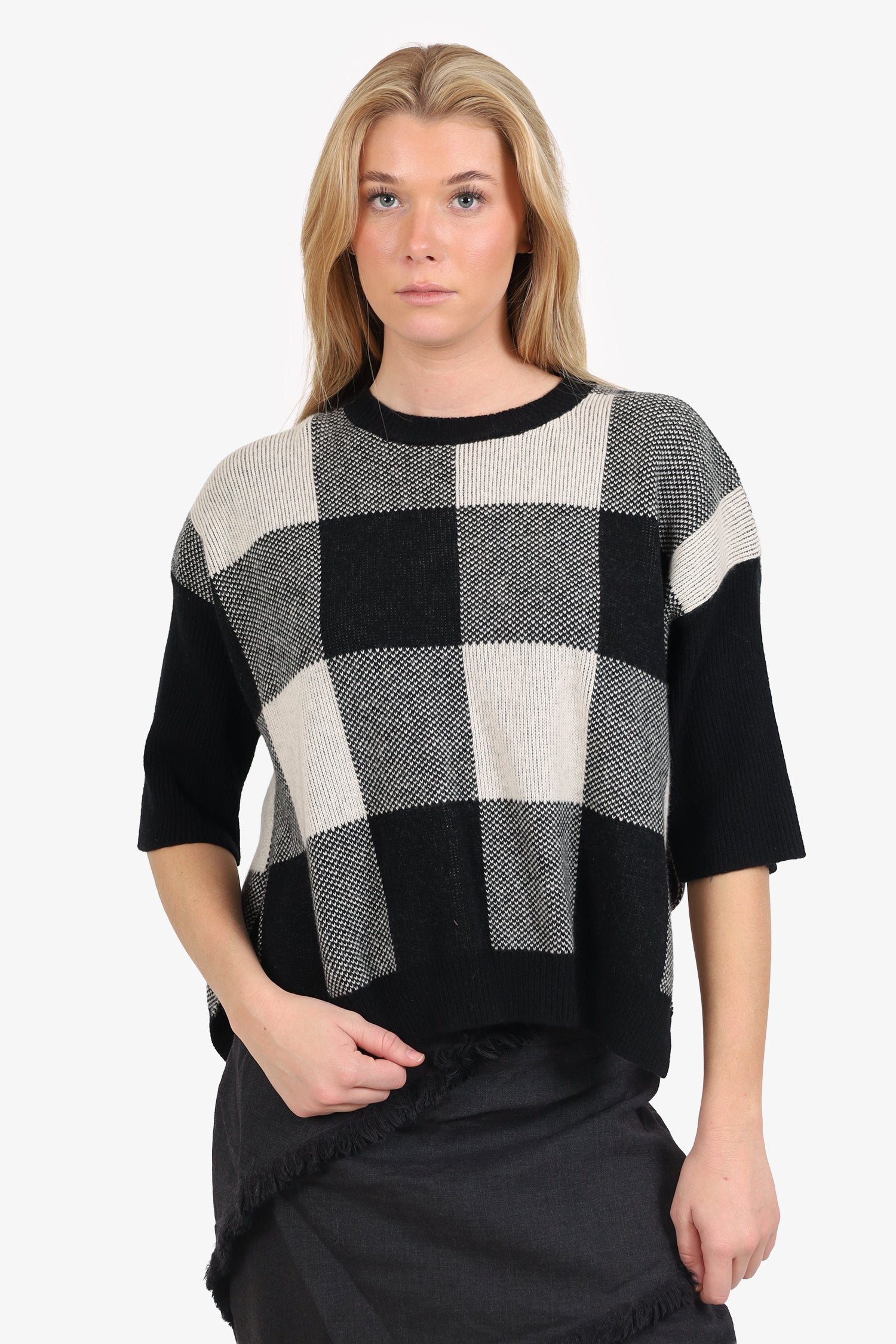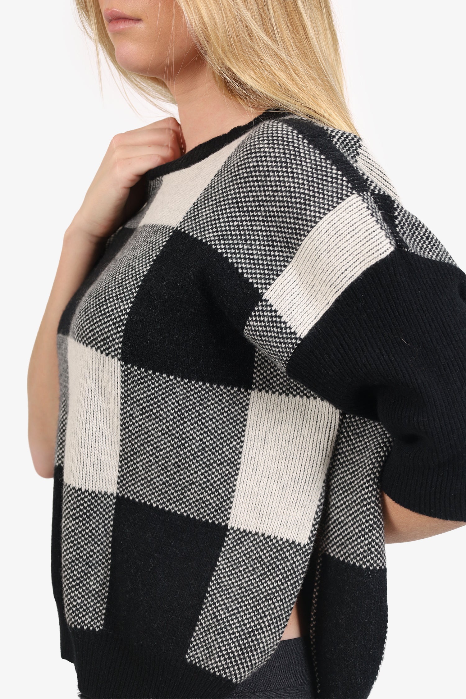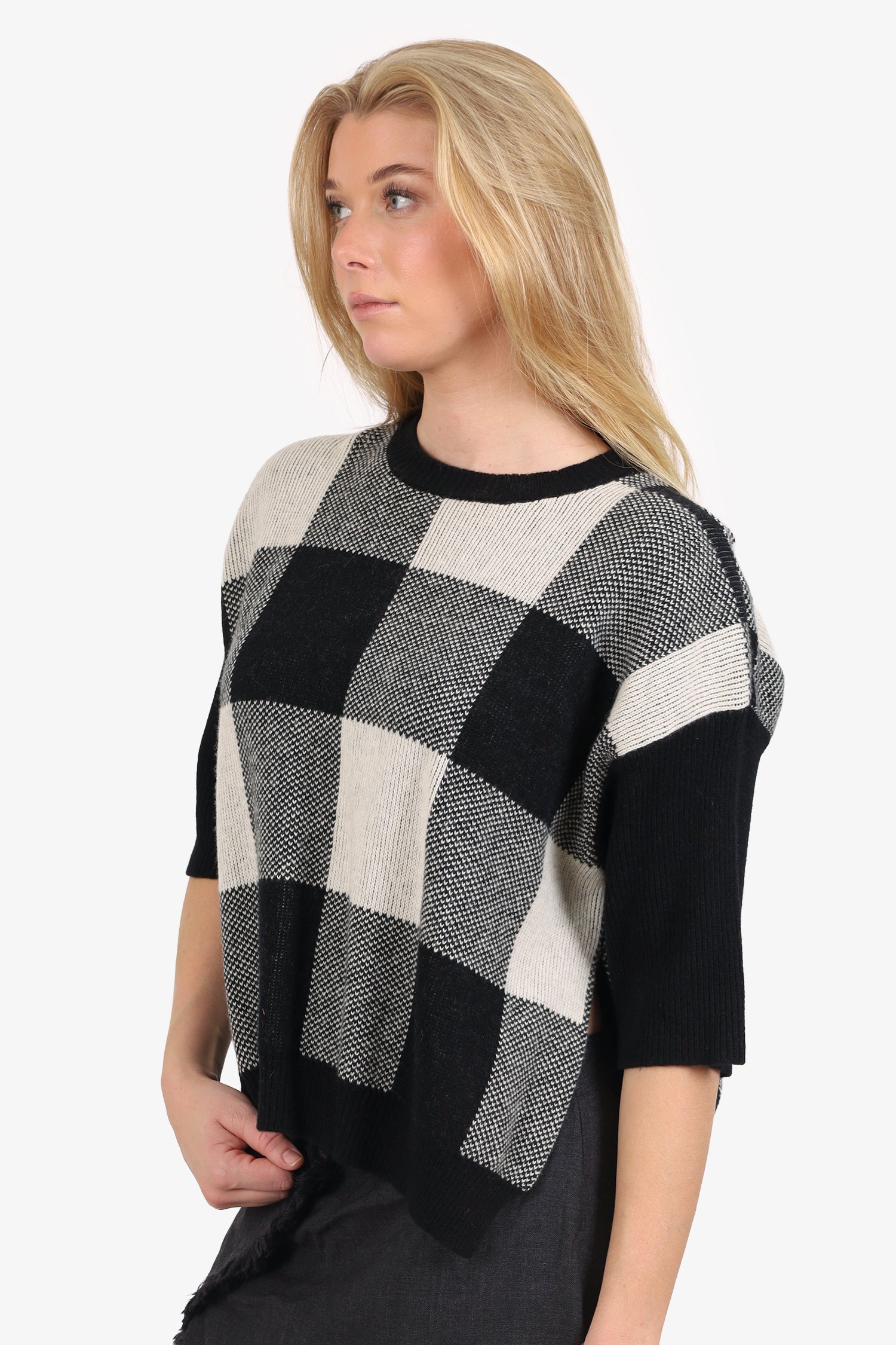 Refresh availabilityStella McCartney Black/White Plaid Wool Open Side Sweater. Pull-on. Round neckline. Tonal stitching.
