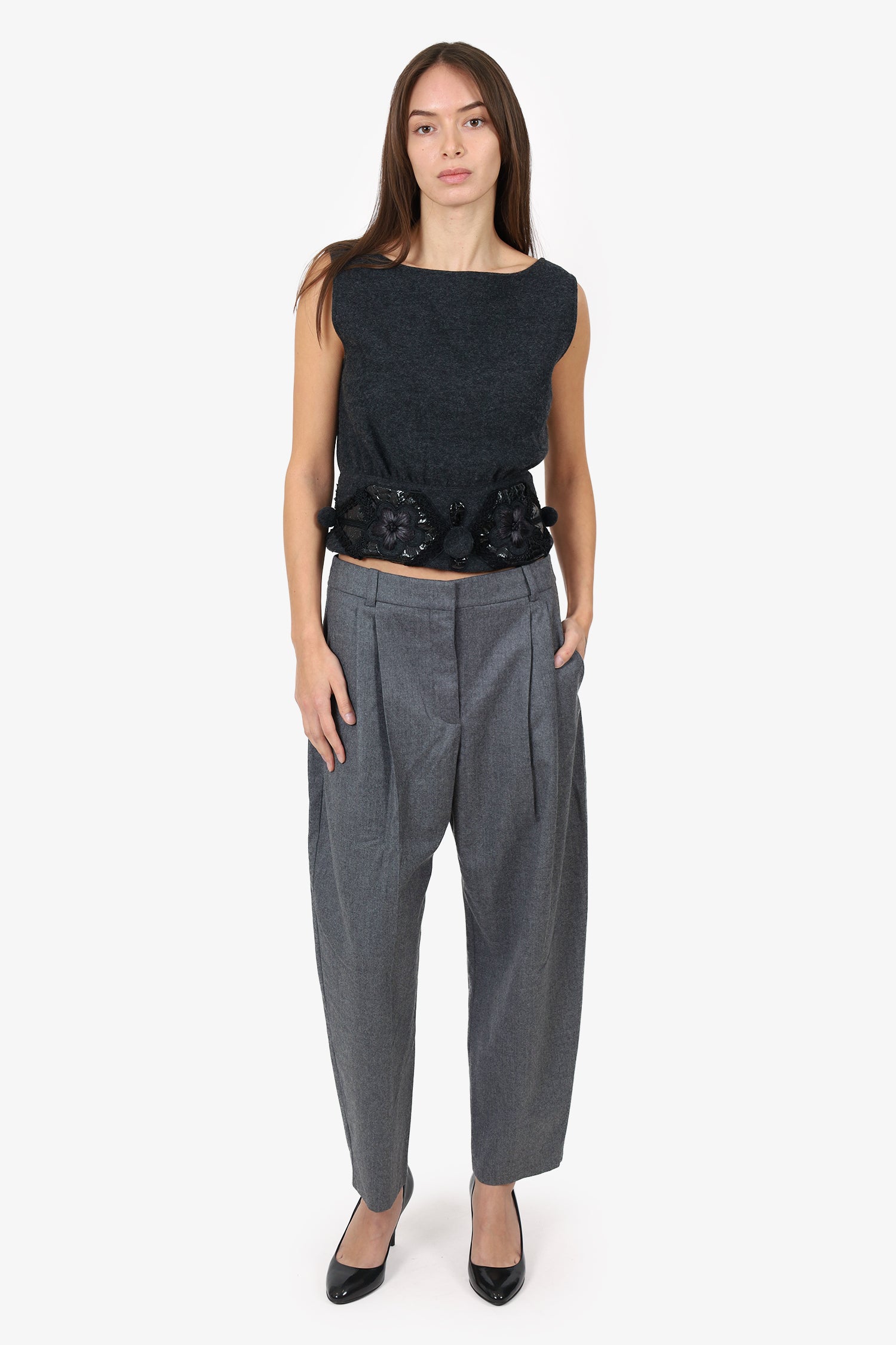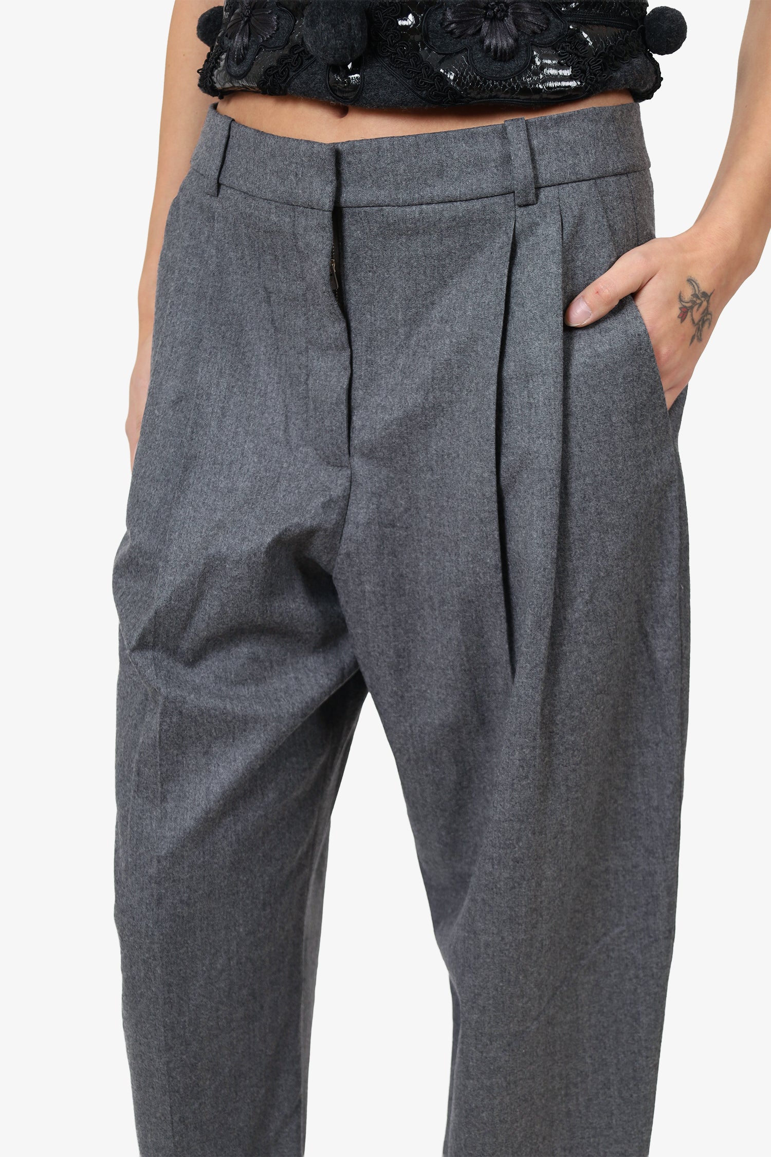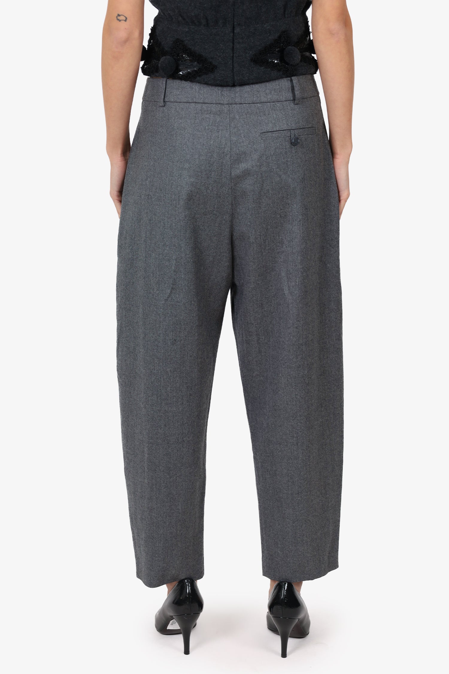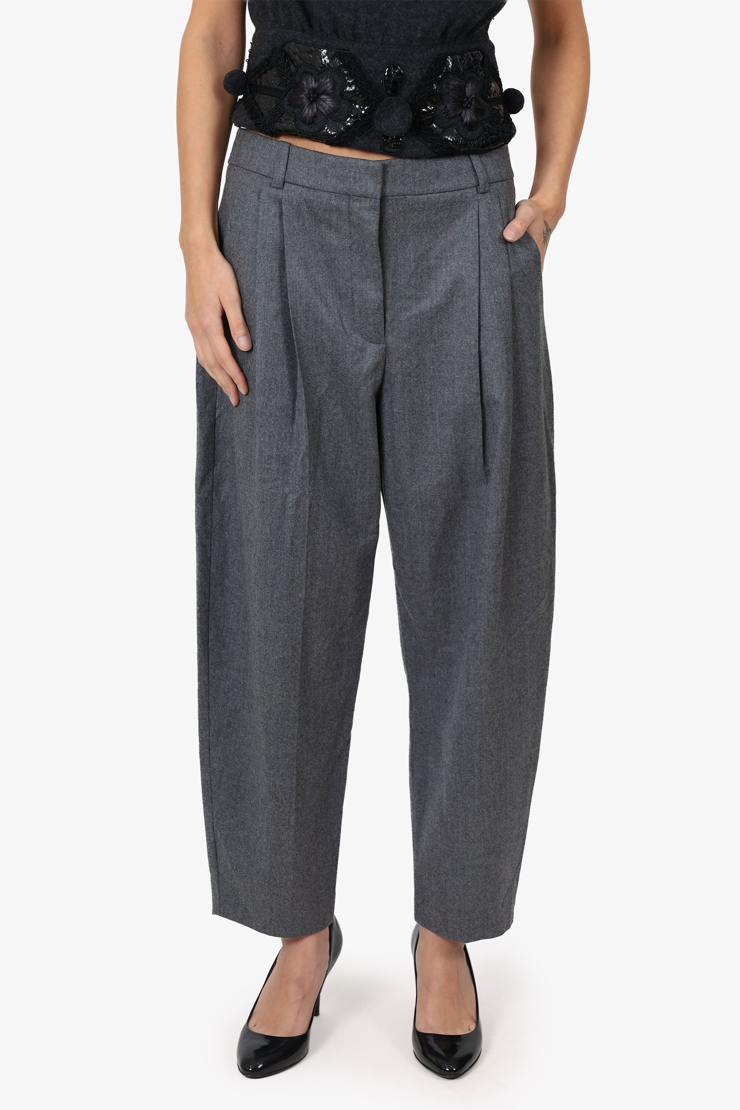 Refresh availabilityStella McCartney Grey Wool Trousers. Slip-on. Front zip with hook closure. Waistband belt loops. 3 exterior pockets; 2 side slip and 1 rear slip pocket with button-up closure. Tonal stitching.