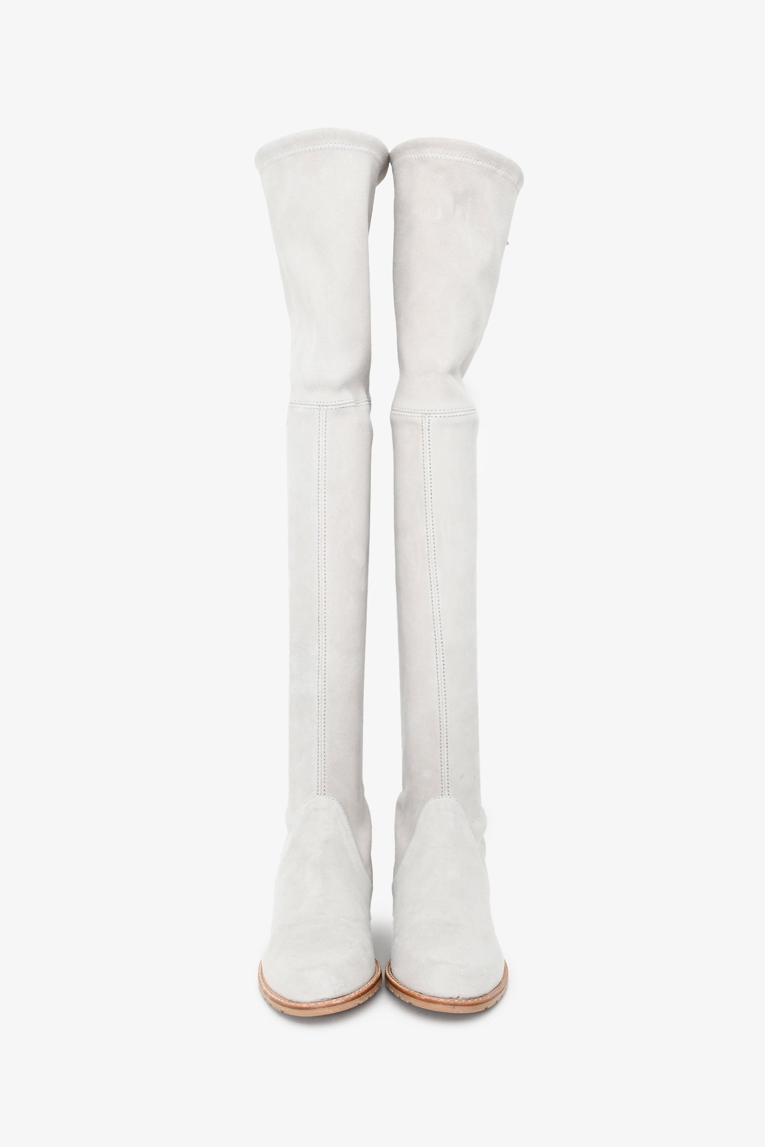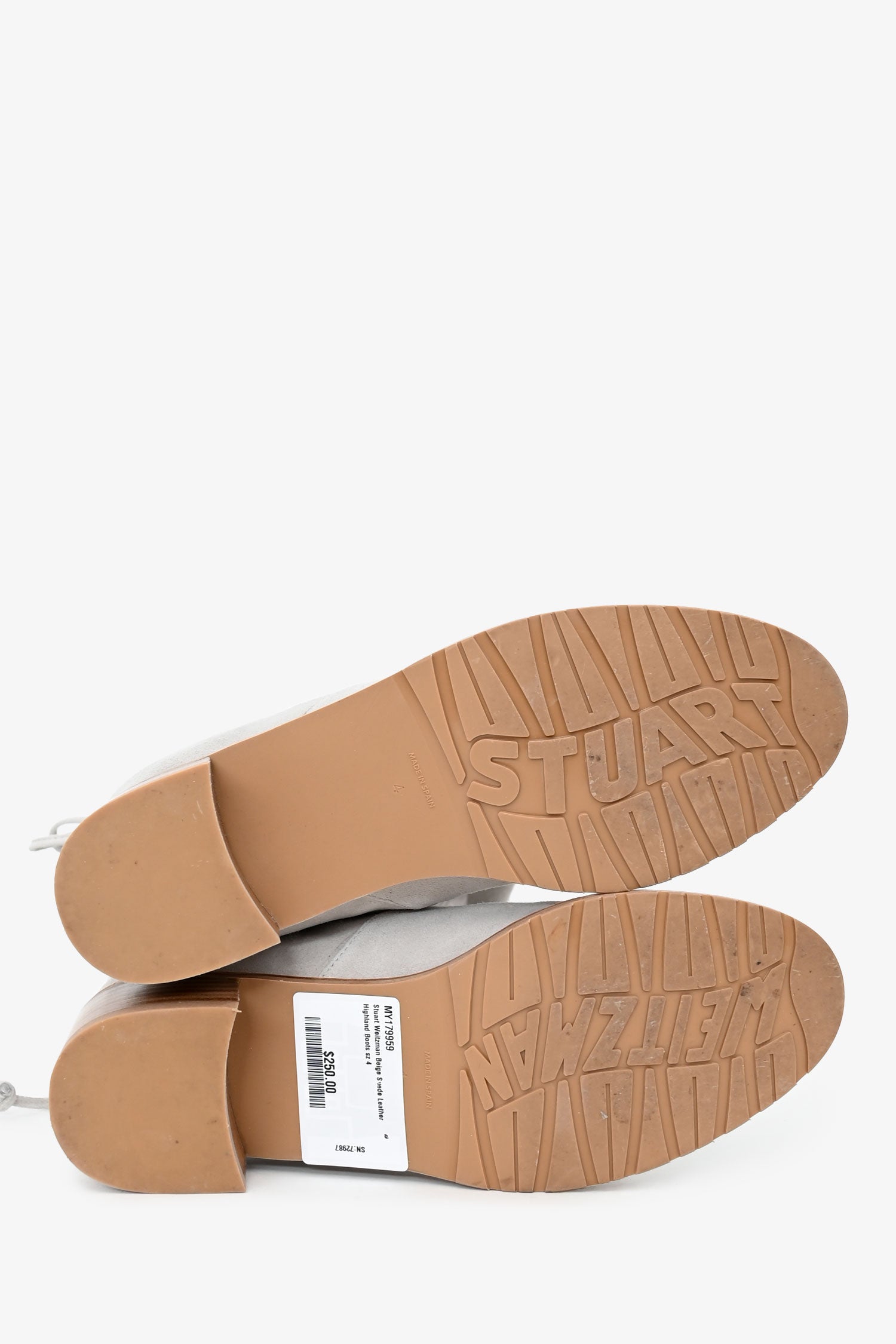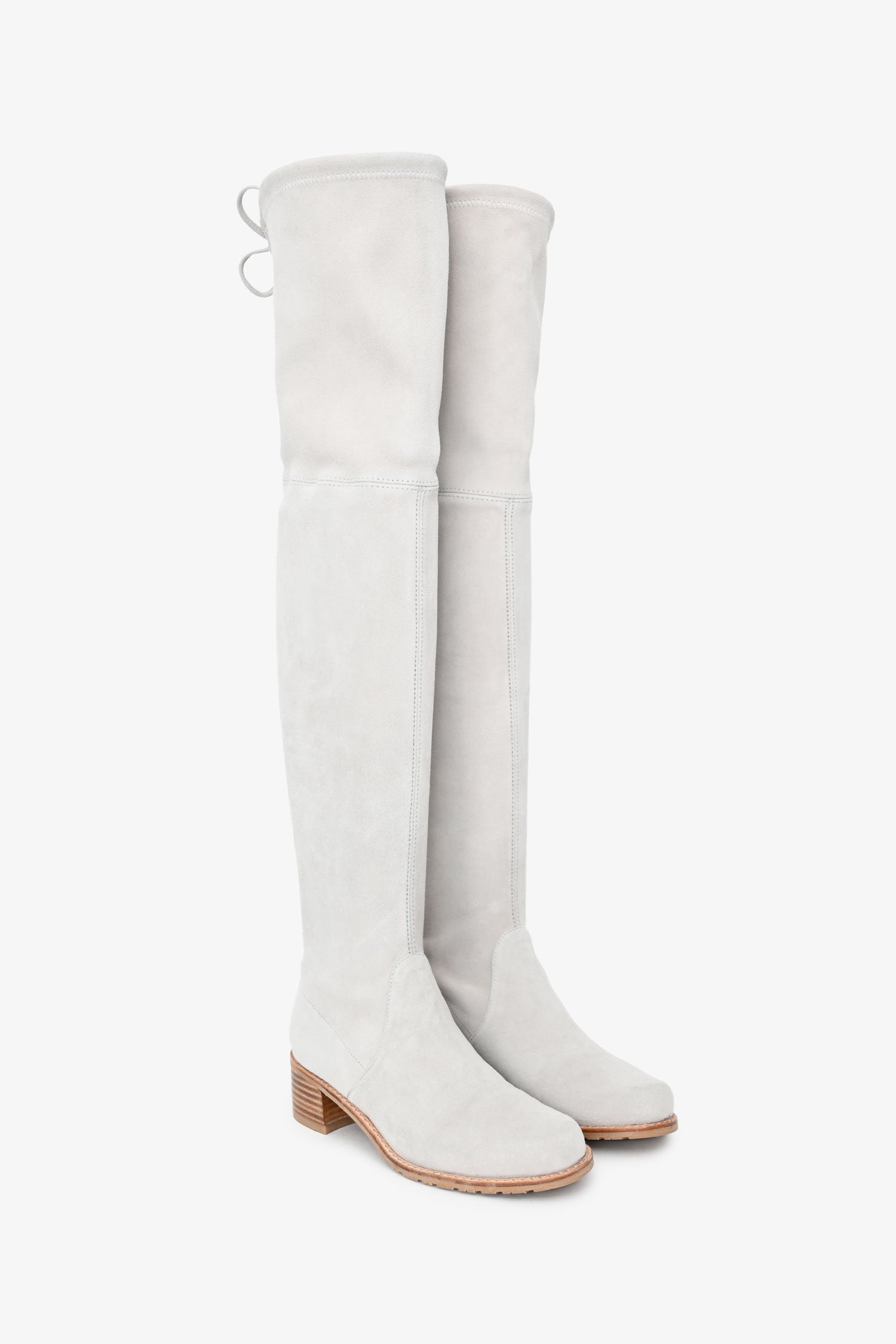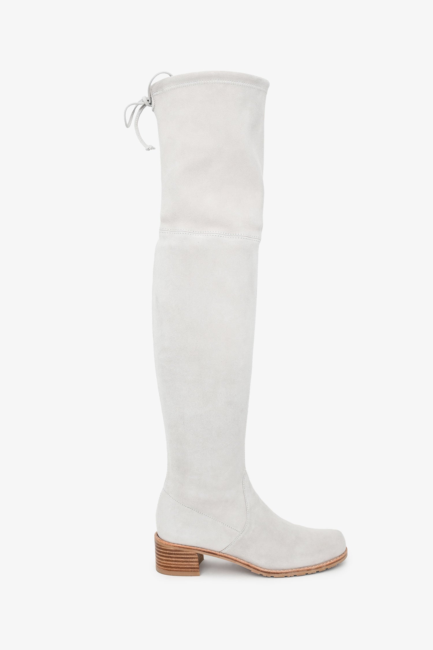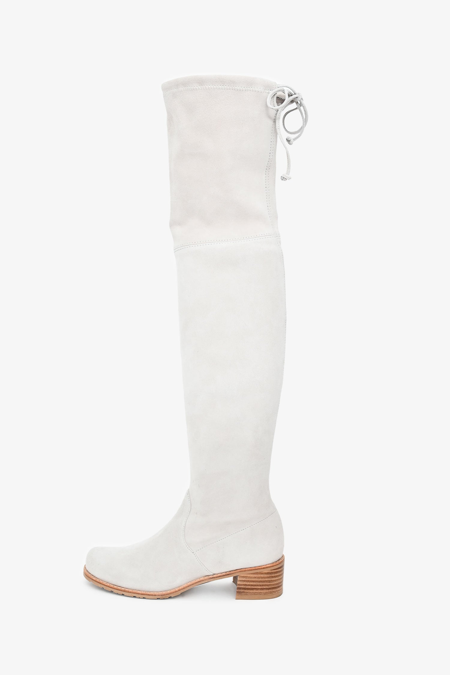 Refresh availabilityStuart Weitzman Beige Suede Leather Highland Boots. Pull-on. Almond toe. Adjustable tie top. Leather lining and insole. Wooden Heel. Rubber sole. Tonal stitching.