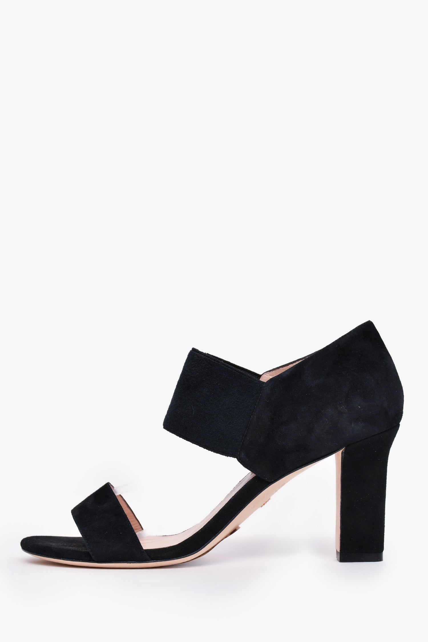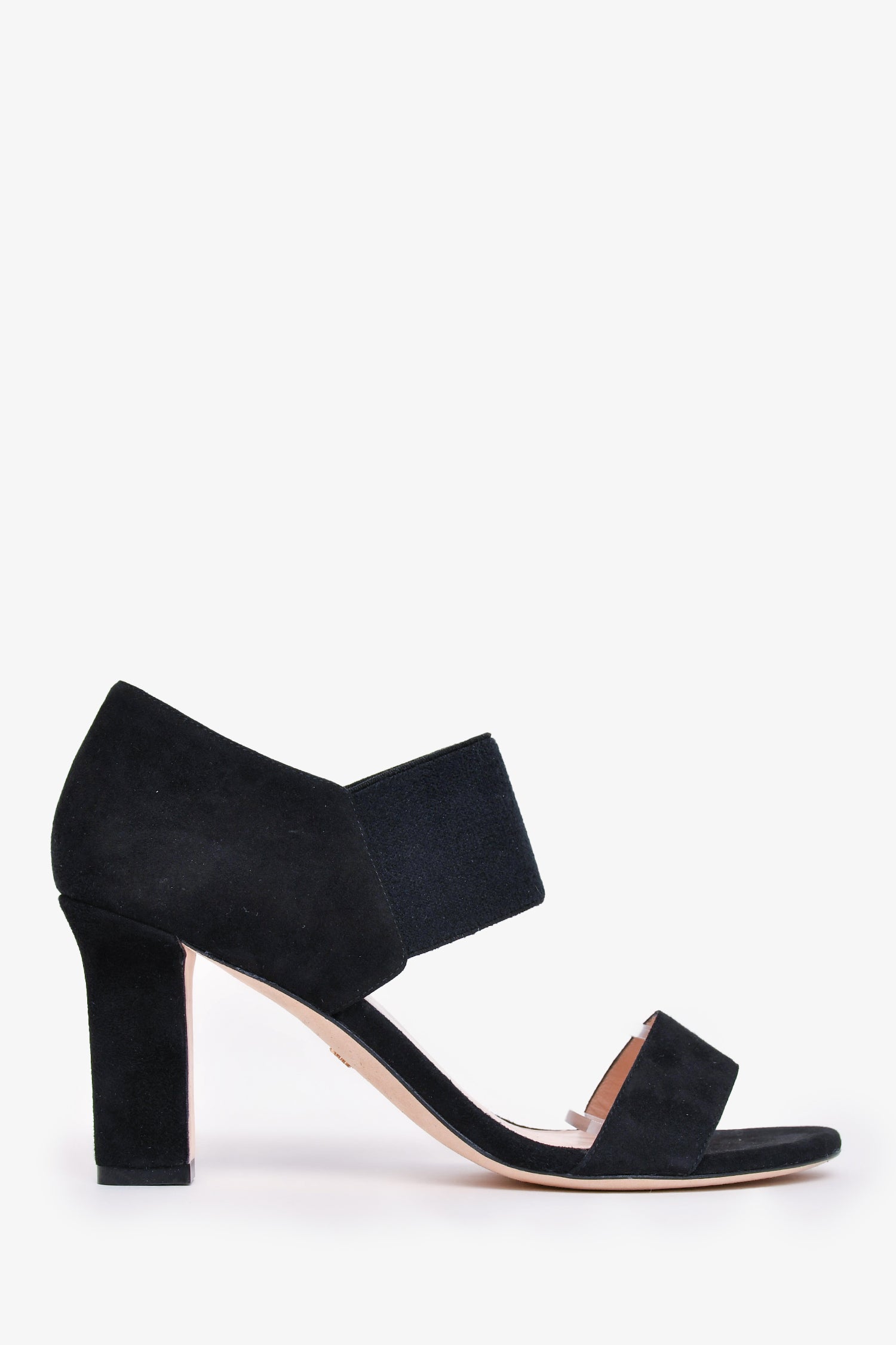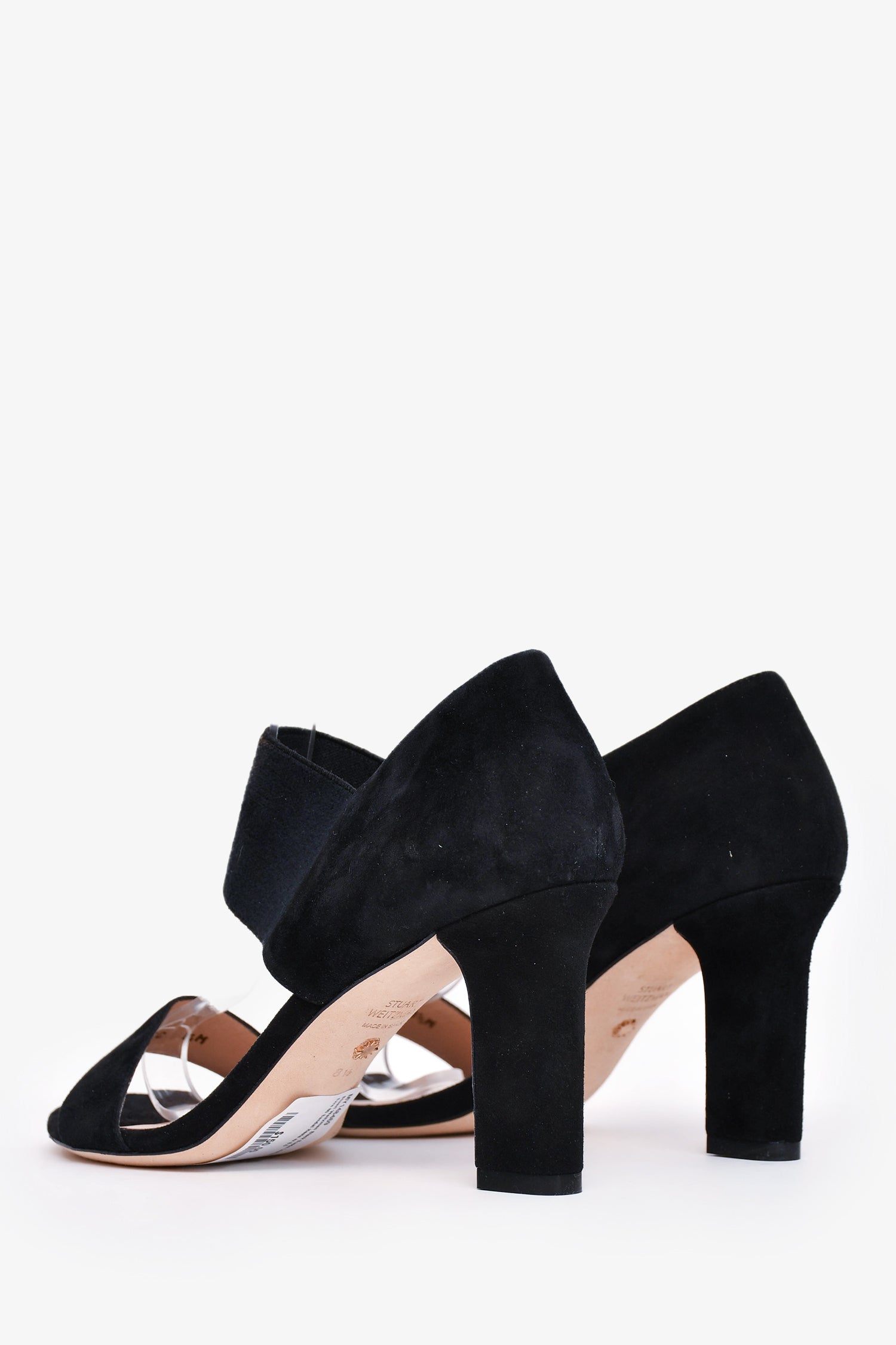 Refresh availabilityStuart Weitzman Black Suede Leather Ezra 80 Sandal Heels. Elastic band at the ankle. Slip-on. Open-toe. Tonal stitching.