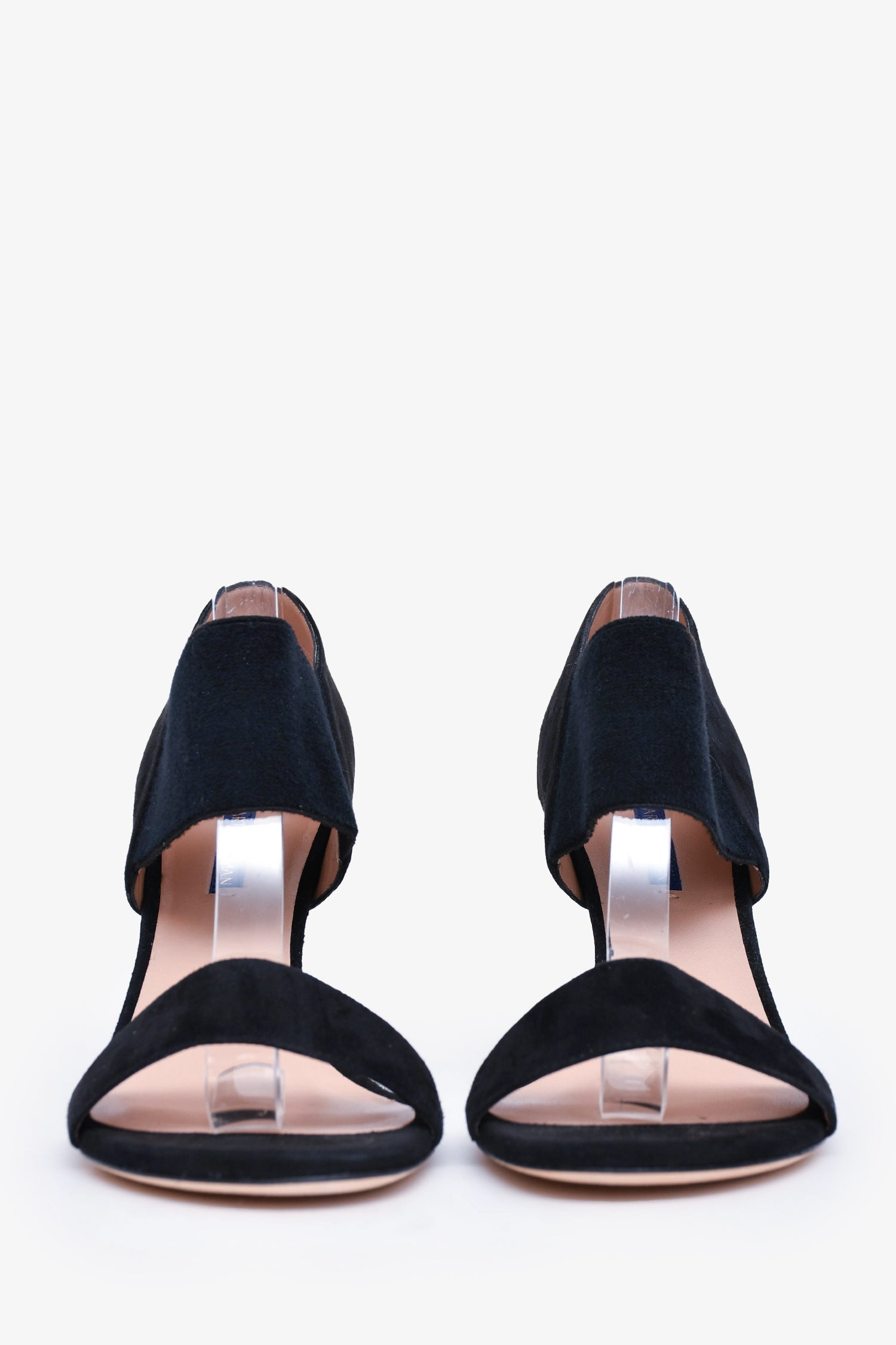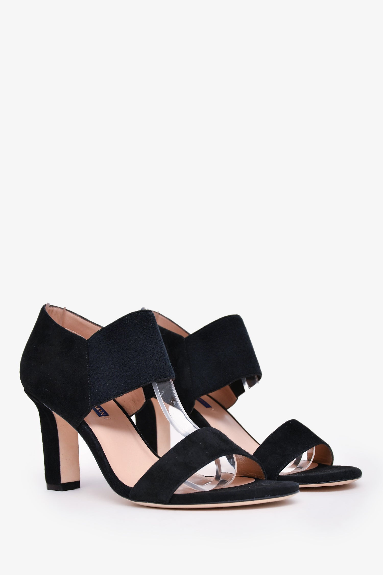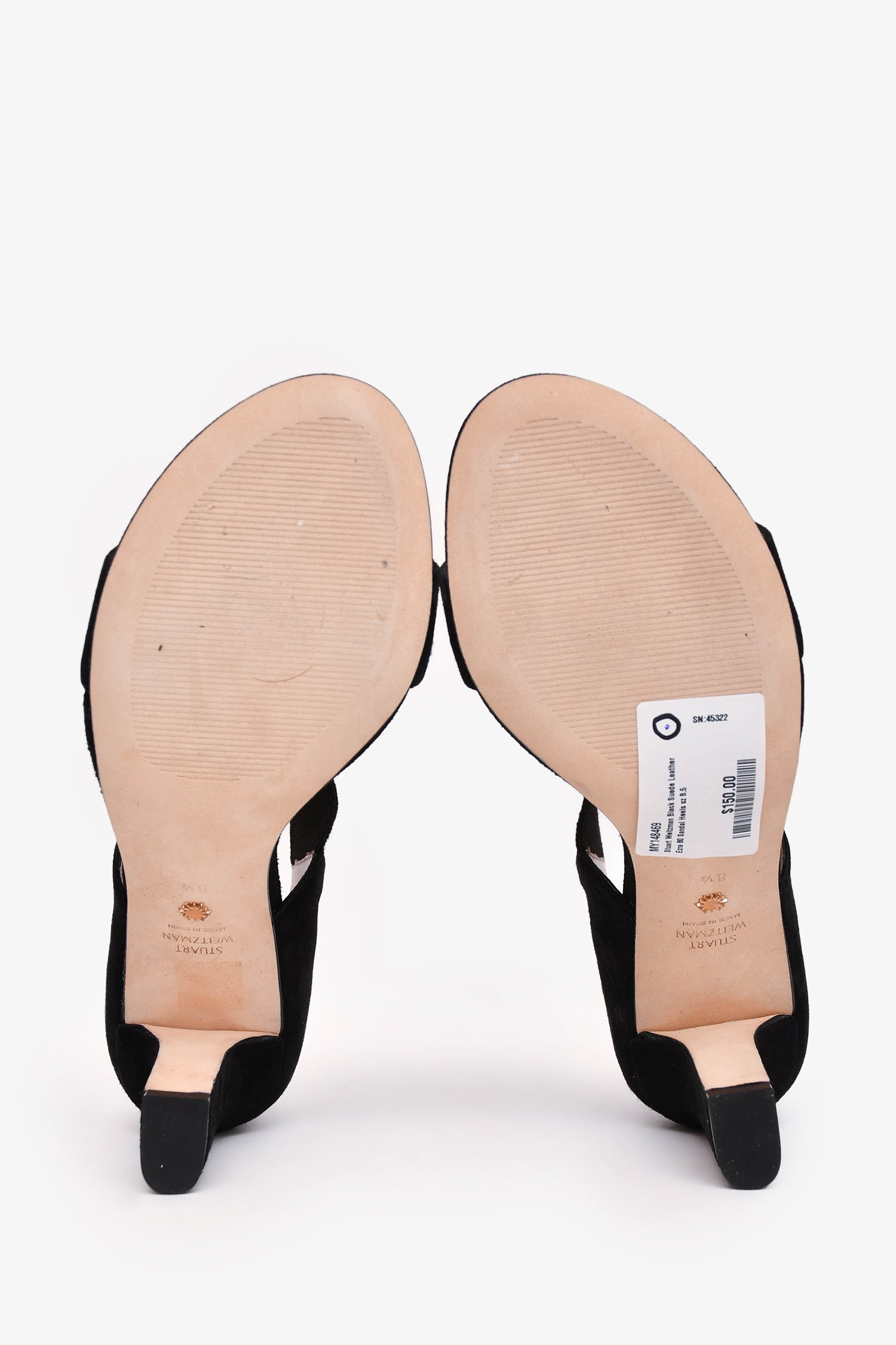 Refresh availabilityStuart Weitzman Black Suede Leather Ezra 80 Sandal Heels. Elastic band at the ankle. Slip-on. Open-toe. Tonal stitching.
