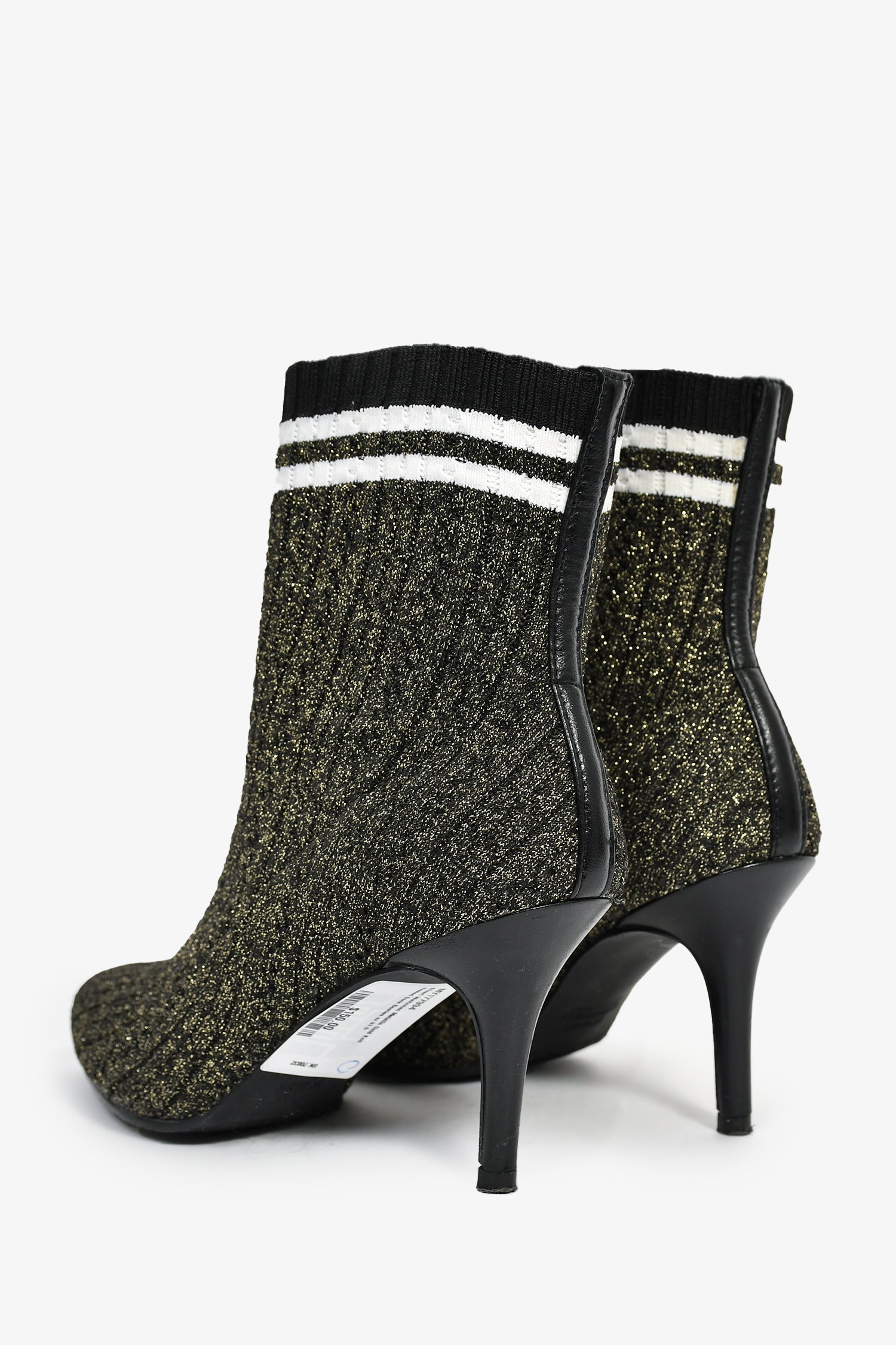 Refresh availabilityStuart Weitzman Metallic Gold Knit Heeled Sock Booties. Textile knit. Leather trim. Stiletto heel. Leather insole. Tonal stitching.