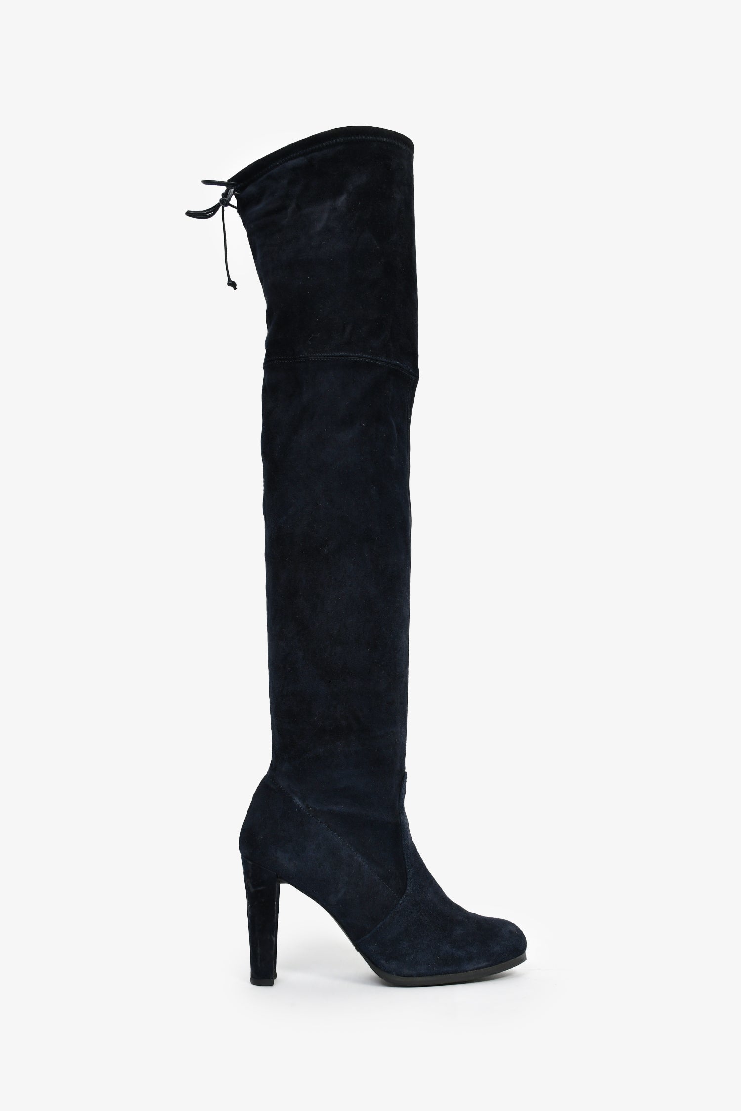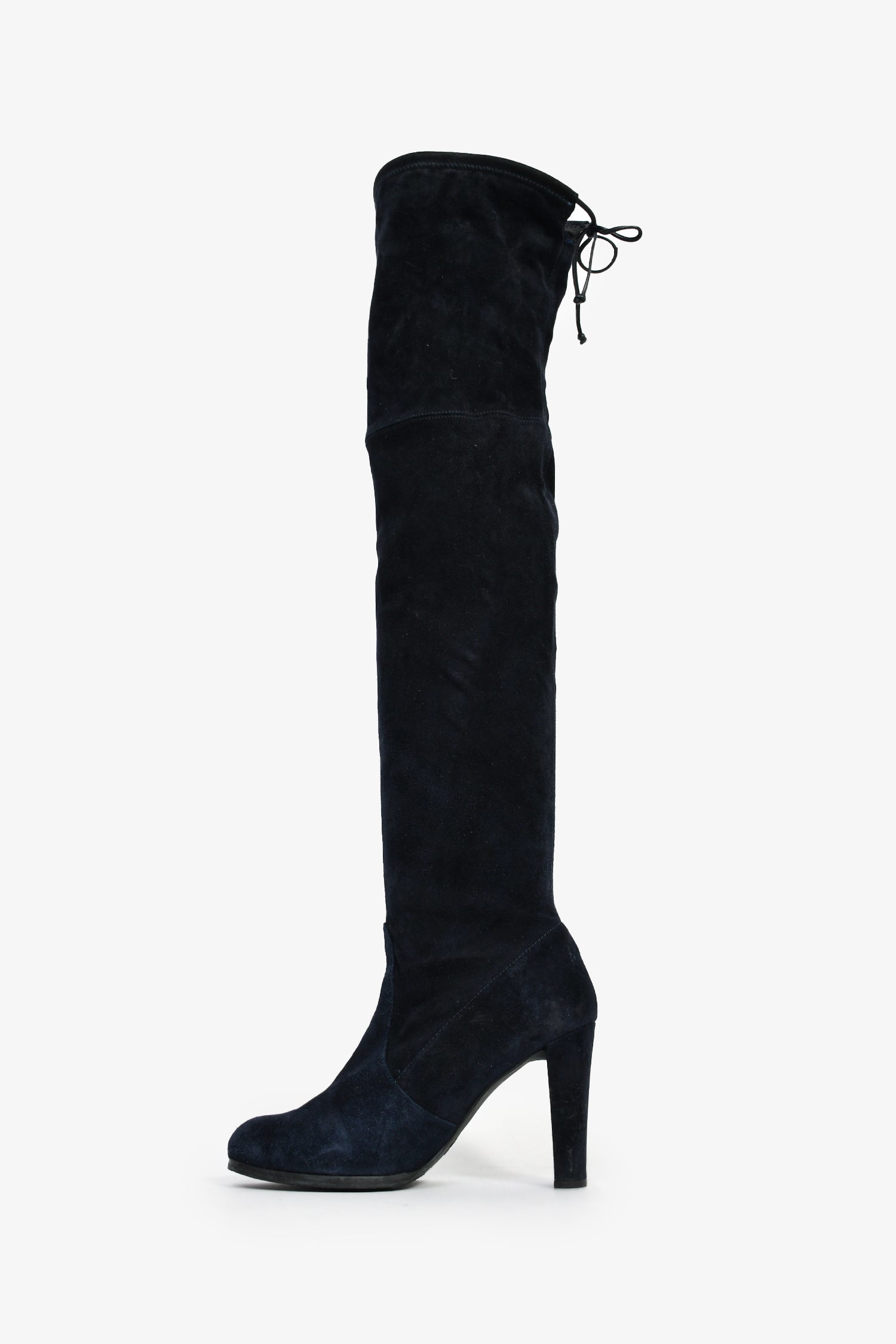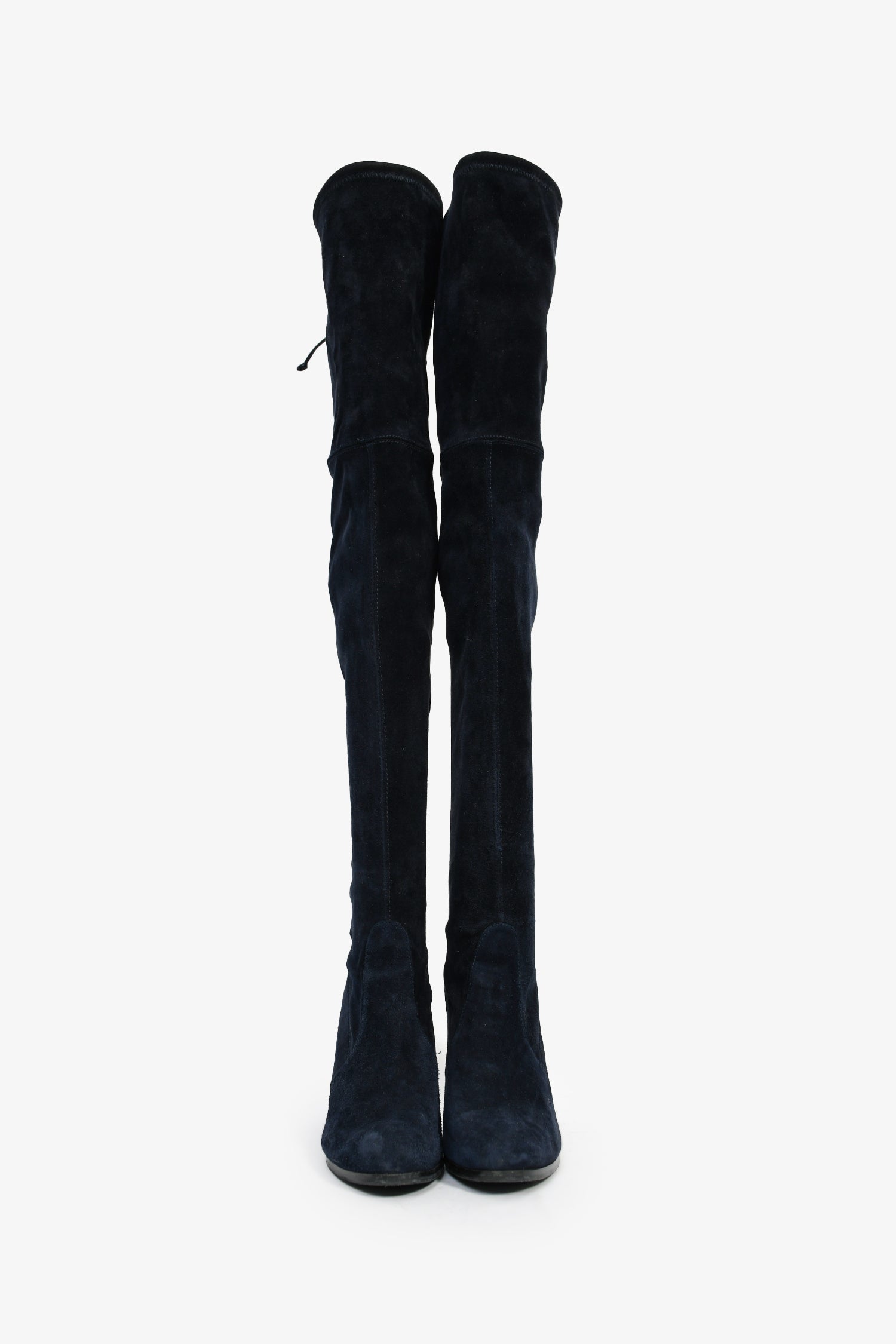 Refresh availabilityStuart Weitzman Navy Suede Thigh High Heeled Boots. Round toe. Pull-on. Tonal stitching.