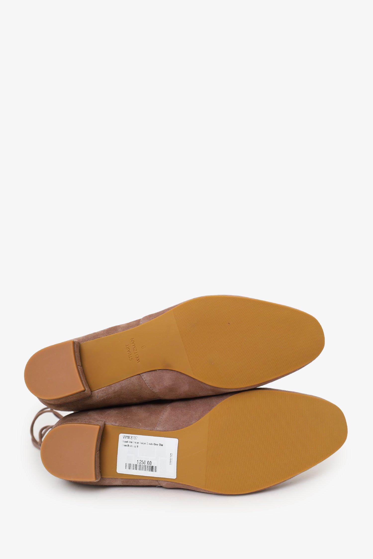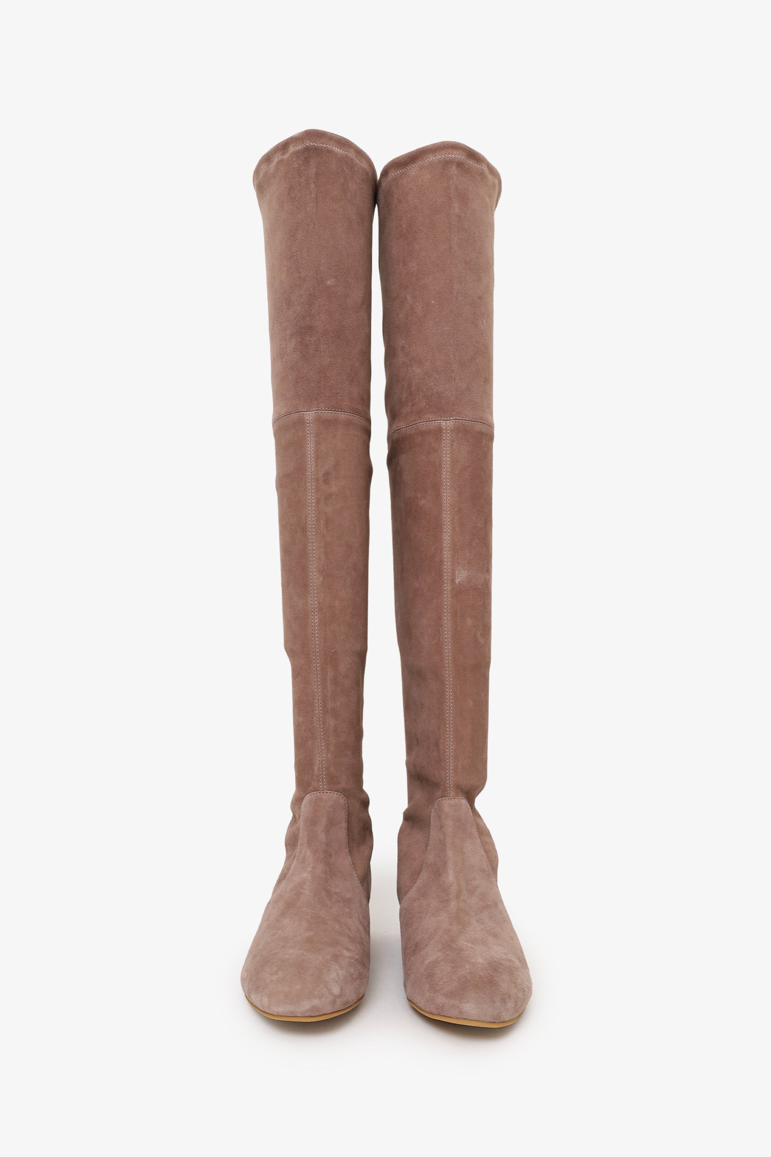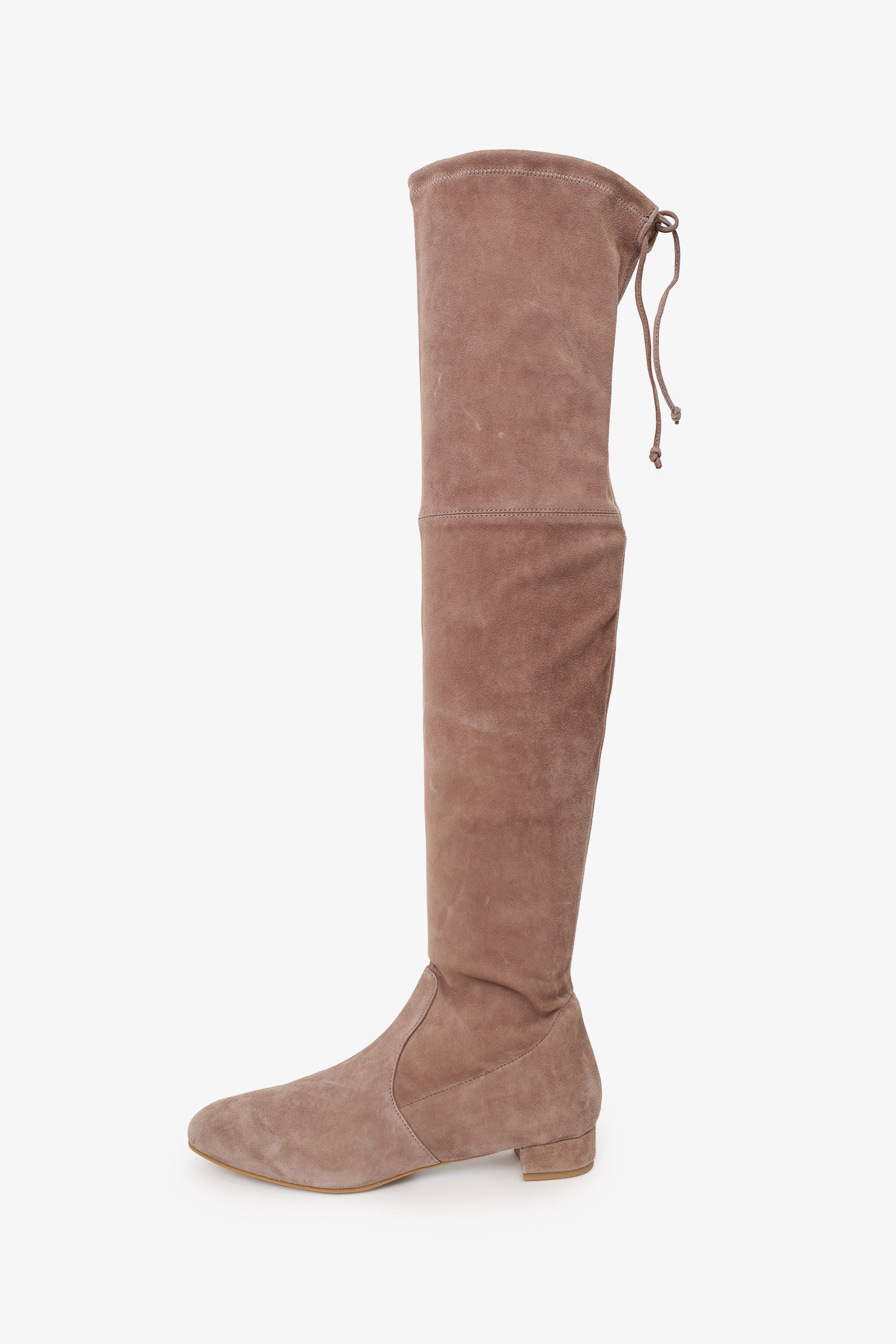Refresh availabilityStuart Weitzman Taupe Suede Over The Knee Boots. Pull-on. Round toe. Rear lace tie-up closure. Tonal stitching.
